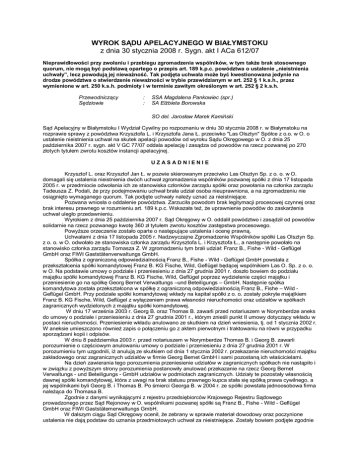 WYROK SĄDU APELACYJNEGO W BIAŁYMSTOKU z dnia 30 stycznia 2008 r. Sygn. akt I ACa 612/07 Nieprawidłowości przy zwołaniu i przebiegu zgromadzenia wspólników, w tym także brak stosownego quorum, nie mogą być podstawą opartego o przepis art. 189 k.p.c. powództwa o ustalenie „nieistnienia uchwały”, lecz powodują jej nieważność. Tak podjęta uchwała może być kwestionowana jedynie na drodze powództwa o stwierdzenie nieważności w trybie przewidzianym w art. 252 § 1 k.s.h., przez wymienione w art. 250 k.s.h. podmioty i w terminie zawitym określonym w art. 252 § 2 k.s.h. Przewodniczący Sędziowie : : SSA Magdalena Pankowiec (spr.) SA Elżbieta Borowska SO del. Jarosław Marek Kamiński Sąd Apelacyjny w Białymstoku I Wydział Cywilny po rozpoznaniu w dniu 30 stycznia 2008 r. w Białymstoku na rozprawie sprawy z powództwa Krzysztofa L. i Krzysztofa Jana Ł. przeciwko "Las Olsztyn" Spółce z o.o. w O. o ustalenie nieistnienia uchwał na skutek apelacji powodów od wyroku Sądu Okręgowego w O. z dnia 25 października 2007 r. sygn. akt V GC 77/07 oddala apelację i zasądza od powodów na rzecz pozwanej po 270 złotych tytułem zwrotu kosztów instancji apelacyjnej. UZASADNIENIE Krzysztof L. oraz Krzysztof Jan Ł. w pozwie skierowanym przeciwko Las Olsztyn Sp. z o. o. w O. domagali się ustalenia nieistnienia dwóch uchwał zgromadzenia wspólników pozwanej spółki z dnia 17 listopada 2005 r. w przedmiocie odwołania ich ze stanowiska członków zarządu spółki oraz powołania na członka zarządu Tadeusza Z. Podali, że przy podejmowaniu uchwał brała udział osoba nieuprawniona, a na zgromadzeniu nie osiągnięto wymaganego quorum. Tak podjęte uchwały należy uznać za nieistniejące. Pozwana wniosła o oddalenie powództwa. Zarzuciła powodom brak legitymacji procesowej czynnej oraz brak interesu prawnego w rozumieniu art. 189 k.p.c. Wskazała też, że uprawnienie powodów do zaskarżenia uchwał uległo przedawnieniu. Wyrokiem z dnia 25 października 2007 r. Sąd Okręgowy w O. oddalił powództwo i zasądził od powodów solidarnie na rzecz pozwanego kwotę 360 zł tytułem zwrotu kosztów zastępstwa procesowego. Powyższe orzeczenie zostało oparte o następujące ustalenia i ocenę prawną. Uchwałami z dnia 17 listopada 2005 r. Nadzwyczajne Zgromadzenie Wspólników spółki Las Olsztyn Sp. z o. o. w O. odwołało ze stanowiska członka zarządu Krzysztofa L. i Krzysztofa Ł., a następnie powołało na stanowisko członka zarządu Tomasza Z. W zgromadzeniu tym brali udział: Franz B., Fishe - Wild - Geflügel GmbH oraz FIWI Gaststätenverwaltungs GmbH. Spółka z ograniczoną odpowiedzialnością Franz B., Fishe - Wild - Geflügel GmbH powstała z przekształcenia spółki komandytowej Franz B. KG Fische, Wild, Geflügel będącej wspólnikiem Las O. Sp. z o. o. w O. Na podstawie umowy o podziale i przeniesieniu z dnia 27 grudnia 2001 r. doszło bowiem do podziału majątku spółki komandytowej Franz B. KG Fische, Wild, Geflügel poprzez wydzielenie części majątku i przeniesienie go na spółkę Georg Bernet Verwaltungs –und Beteiligungs – GmbH. Następnie spółka komandytowa została przekształcona w spółkę z ograniczoną odpowiedzialnością Franz B., Fishe – Wild Geflügel GmbH. Przy podziale spółki komandytowej wkłady na kapitał spółki z o. o. zostały pokryte majątkiem Franz B. KG Fische, Wild, Geflügel z wyłączeniem prawa własności nieruchomości oraz udziałów w spółkach zagranicznych wydzielonych z majątku spółki komandytowej. W dniu 17 września 2003 r. Georg B. oraz Thomas B. zawarli przed notariuszem w Norymberdze aneks do umowy o podziale i przeniesieniu z dnia 27 grudnia 2001 r., którym znieśli punkt II umowy dotyczący wkładu w postaci nieruchomości. Przeniesienie wkładu anulowano ze skutkiem na dzień wniesienia, tj. od 1 stycznia 2002 r. W aneksie umieszczono również zapis o połączeniu go z aktem pierwotnym i traktowaniu na równi w przypadku sporządzani kopii i odpisów. W dniu 8 października 2003 r. przed notariuszem w Norymberdze Thomas B. i Georg B. zawarli porozumienie o częściowym anulowaniu umowy o podziale i przeniesieniu z dnia 27 grudnia 2001 r. W porozumieniu tym uzgodnili, iż anulują ze skutkiem od dnia 1 stycznia 2002 r. przekazanie nieruchomości majątku zakładowego oraz zagranicznych udziałów w firmie Georg Bemet GmbH i sami pozostaną ich właścicielami. Na dzień zawierania tego porozumienia przeniesienie udziałów w zagranicznych spółkach nie nastąpiło i w związku z powyższym strony porozumienia postanowiły anulować przekazanie na rzecz Georg Bernet Verwaltungs - und Beteiligungs - GmbH udziałów w podmiotach zagranicznych. Udziały te pozostały własnością dawnej spółki komandytowej, która z uwagi na brak statusu prawnego kupca stała się spółką prawa cywilnego, a jej wspólnikami byli Georg B. i Thomas B. Po śmierci Georga B. w 2004 r. ze spółki powstała jednoosobowa firma należąca do Thomasa B. Zgodnie z danymi wynikającymi z rejestru przedsiębiorców Krajowego Rejestru Sądowego prowadzonego przez Sąd Rejonowy w O. wspólnikami pozwanej spółki są Franz B., Fishe - Wild - Geflügel GmbH oraz FIWI Gaststätemerwaltungs GmbH. W dalszym ciągu Sąd Okręgowy ocenił, że zebrany w sprawie materiał dowodowy oraz poczynione ustalenia nie dają podstaw do uznania przedmiotowych uchwał za nieistniejące. Zostały bowiem podjęte zgodnie z art. 227 k.s.h., tj. na zwołanym przez uprawnione podmioty, kompetentnym do ich uchwalenia zgromadzeniu wspólników. Powodowie, którzy domagali się uznania ich za nieistniejące, powoływali się na udział przy ich uchwalaniu podmiotu niebędącego wspólnikiem pozwanej spółki oraz brak quorum. Okoliczności te mogły jedynie decydować o nieważności uchwał, jednakże w takim przypadku powodowie musieliby wystąpić w oparciu o art. 252 § 1 k.s.h. z powództwem o stwierdzenie nieważności