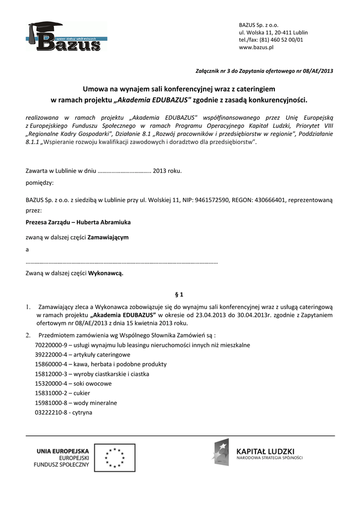 BAZUS Sp. z o.o. ul. Wolska 11, 20-411 Lublin tel./fax: (81) 460 52 00/01 www.bazus.pl Załącznik nr 3 do Zapytania ofertowego nr 08/AE/2013 Umowa na wynajem sali konferencyjnej wraz z cateringiem w ramach projektu „Akademia EDUBAZUS" zgodnie z zasadą konkurencyjności. realizowana w ramach projektu „Akademia EDUBAZUS" współfinansowanego przez Unię Europejską z Europejskiego Funduszu Społecznego w ramach Programu Operacyjnego Kapitał Ludzki, Priorytet VIII „Regionalne Kadry Gospodarki", Działanie 8.1 „Rozwój pracowników i przedsiębiorstw w regionie", Poddziałanie 8.1.1 „Wspieranie rozwoju kwalifikacji zawodowych i doradztwo dla przedsiębiorstw”. Zawarta w Lublinie w dniu …………………………….. 2013 roku. pomiędzy: BAZUS Sp. z o.o. z siedzibą w Lublinie przy ul. Wolskiej 11, NIP: 9461572590, REGON: 430666401, reprezentowaną przez: Prezesa Zarządu – Huberta Abramiuka zwaną w dalszej części Zamawiającym a ……………………………………………………………………………………………………………… Zwaną w dalszej części Wykonawcą. §1 1. Zamawiający zleca a Wykonawca zobowiązuje się do wynajmu sali konferencyjnej wraz z usługą cateringową w ramach projektu „Akademia EDUBAZUS” w okresie od 23.04.2013 do 30.04.2013r. zgodnie z Zapytaniem ofertowym nr 08/AE/2013 z dnia 15 kwietnia 2013 roku. 2. Przedmiotem zamówienia wg Wspólnego Słownika Zamówień są : 70220000-9 – usługi wynajmu lub leasingu nieruchomości innych niż mieszkalne 39222000-4 – artykuły cateringowe 15860000-4 – kawa, herbata i podobne produkty 15812000-3 – wyroby ciastkarskie i ciastka 15320000-4 – soki owocowe 15831000-2 – cukier 15981000-8 – wody mineralne 03222210-8 - cytryna BAZUS Sp. z o.o. ul. Wolska 11, 20-411 Lublin tel./fax: (81) 460 52 00/01 www.bazus.pl 3. Wykonawca oświadcza, iż posiada doświadczenie zawodowe do należytego wykonania zlecenia. 4. Wykonawca oświadcza, iż nie jest powiązany z Zamawiającym osobowo lub kapitałowo1. §2 Do obowiązków Wykonawcy należy w szczególności: 1. Wynajem sali szkoleniowej wraz z wyposażeniem na terenie Lublina w celu realizacji 1 szkolenia przeprowadzonego w ciągu 3 dni (23-25 kwietnia 2013r.) w łącznym wymiarze 24 godzin szkoleniowych + niezbędne przerwy 2. Usługa gastronomiczna - przygotowanie i podanie wyżywienia dla uczestników szkolenia – 6 osób (obiadzgodnie z przedłożoną ofertą zaakceptowaną przez Zamawiającego) 3. Przygotowanie i dostarczenie przerw kawowych dla grupy szkoleniowej – 2 przerwy kawowe na 1 dzień szkoleniowy, łącznie 6 przerw kawowych. §3 1. Do wszelkich kontaktów przy wykonywaniu niniejszej umowy Zamawiający upoważnia koordynatora projektu Panią Agatę Witczak. 2. Wykonawca zobowiązany będzie do stosowania się przy wykonywaniu przedmiotu umowy do wskazówek Zamawiającego udzielanych przez osobę wskazaną w ust. 1. §4 1. 2. 1 Przed rozpoczęciem realizacji usługi Wykonawca otrzyma od Zamawiającego szczegółowy harmonogram pobytu grupy szkoleniowej w obiekcie. Odbiór przedmiotu zamówienia nastąpi po zrealizowaniu usługi. Przez powiązania kapitałowe rozumie się wzajemne powiązania między Zamawiającym lub osobami upoważnionymi do zaciągania zobowiązań w imieniu Zamawiającego lub osobami wykonującymi w imieniu Zamawiającego czynności związane z przygotowaniem i przeprowadzeniem procedury wyboru wykonawcy a wykonawcą, polegające w szczególności na: a) Uczestniczeniu w spółce jako wspólnik spółki cywilnej lub spółki osobowej; b) Posiadaniu co najmniej 10% udziałów lub akcji; c) Pełnieniu funkcji członka organu nadzorczego lub zarządzającego, prokurenta, pełnomocnika; d) Pozostawaniu w związku małżeńskim, w stosunku pokrewieństwa lub powinowactwa w linii prostej, pokrewieństwa lub powinowactwa w linii bocznej do drugiego stopnia lub w stosunku przysposobienia, opieki lub kurateli. BAZUS Sp. z o.o. ul. Wolska 11, 20-411 Lublin tel./fax: (81) 460 52 00/01 www.bazus.pl §5 1. Zapłata za wykonanie przedmiotu niniejszej umowy, określone w § 1 ust. 1, w wysokości ………………………………… zł netto, obliczone zgodnie z warunkami zapytania ofertowego oraz Ofertą Wykonawcy płatne będzie przelewem na konto Wykonawcy w terminie 14 dni po otrzymaniu prawidłowo wystawionego przez Wykonawcę rachunku/faktury VAT. Zapłata współfinansowana jest ze środków Unii Europejskiej w ramach Europejskiego Funduszu Społecznego. 2. Zamawiający będący realizatorem projektu współfinansowanego ze środków Unii Europejskiej z Europejskiego Funduszu Społecznego zastrzega sobie, że wypłata należności w w/w terminie jest możliwa, gdy Zamawiający posiada środki finansowe na subkoncie utworzonym na potrzeby realizacji projektu przekazane przez Instytucję Pośredniczącą. W przypadku braku środków finansowych należność zostanie uregulowana niezwłocznie po ich otrzymaniu. 3. Dane do faktury: BAZUS Sp. z o.o., ul. Wolska 11, 20-411 Lublin, NIP: 9461572590, REGON: 430666401 4. Wartość umowy ogółem ……………………. zł (słownie: …………………………………………………………….). §6 1. Wykonawca zapłaci Zamawiającemu karę umowną w następujących przypadkach: a. w przypadku odstąpienia od umowy, z przyczyn obciążających Wykonawcę w wysokości 10% szacunkowej wartości przedmiotu umowy; b. w przypadku nieterminowej realizacji przedmiotu umowy określonego w § 1 umowy, w wysokości 0.05 % szacunkowej wartości przedmiotu umowy, za każdy dzień zwłoki licząc od dnia, na który ustalono zakończenie wykonania przedmiotu umowy. 2. Zamawiający zapłaci Wykonawcy karę umowną w przypadku odstąpienia od umowy z przyczyn obciążających Zamawiającego, w wysokości 10 % szacunkowej wartości przedmiotu umowy. 3. Zamawiający może dochodzić odszkodowania na zasadach ogólnych określonych w kodeksie cywilnym