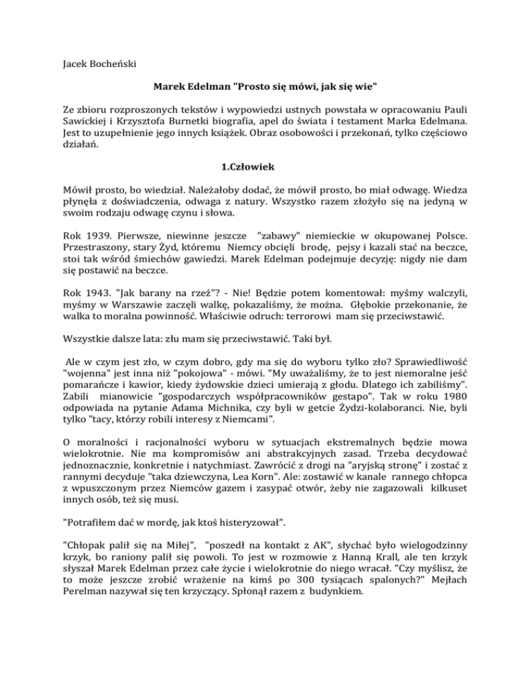 Jacek Bocheński Marek Edelman "Prosto się mówi, jak się wie" Ze zbioru rozproszonych tekstów i wypowiedzi ustnych powstała w opracowaniu Pauli Sawickiej i Krzysztofa Burnetki biografia, apel do świata i testament Marka Edelmana. Jest to uzupełnienie jego innych książek. Obraz osobowości i przekonań, tylko częściowo działań. 1.Człowiek Mówił prosto, bo wiedział. Należałoby dodać, że mówił prosto, bo miał odwagę. Wiedza płynęła z doświadczenia, odwaga z natury. Wszystko razem złożyło się na jedyną w swoim rodzaju odwagę czynu i słowa. Rok 1939. Pierwsze, niewinne jeszcze "zabawy" niemieckie w okupowanej Polsce. Przestraszony, stary Żyd, któremu Niemcy obcięli brodę, pejsy i kazali stać na beczce, stoi tak wśród śmiechów gawiedzi. Marek Edelman podejmuje decyzję: nigdy nie dam się postawić na beczce. Rok 1943. "Jak barany na rzeź"? - Nie! Będzie potem komentował: myśmy walczyli, myśmy w Warszawie zaczęli walkę, pokazaliśmy, że można. Głębokie przekonanie, że walka to moralna powinność. Właściwie odruch: terrorowi mam się przeciwstawić. Wszystkie dalsze lata: złu mam się przeciwstawić. Taki był. Ale w czym jest zło, w czym dobro, gdy ma się do wyboru tylko zło? Sprawiedliwość "wojenna" jest inna niż "pokojowa" - mówi. "My uważaliśmy, że to jest niemoralne jeść pomarańcze i kawior, kiedy żydowskie dzieci umierają z głodu. Dlatego ich zabiliśmy". Zabili mianowicie "gospodarczych współpracowników gestapo". Tak w roku 1980 odpowiada na pytanie Adama Michnika, czy byli w getcie Żydzi-kolaboranci. Nie, byli tylko "tacy, którzy robili interesy z Niemcami". O moralności i racjonalności wyboru w sytuacjach ekstremalnych będzie mowa wielokrotnie. Nie ma kompromisów ani abstrakcyjnych zasad. Trzeba decydować jednoznacznie, konkretnie i natychmiast. Zawrócić z drogi na "aryjską stronę" i zostać z rannymi decyduje "taka dziewczyna, Lea Korn". Ale: zostawić w kanale rannego chłopca z wpuszczonym przez Niemców gazem i zasypać otwór, żeby nie zagazowali kilkuset innych osób, też się musi. "Potrafiłem dać w mordę, jak ktoś histeryzował". "Chłopak palił się na Miłej", "poszedł na kontakt z AK", słychać było wielogodzinny krzyk, bo raniony palił się powoli. To jest w rozmowie z Hanną Krall, ale ten krzyk słyszał Marek Edelman przez całe życie i wielokrotnie do niego wracał. "Czy myślisz, że to może jeszcze zrobić wrażenie na kimś po 300 tysiącach spalonych?" Mejłach Perelman nazywał się ten krzyczący. Spłonął razem z budynkiem. "Ruth siedem razy strzelała do siebie" , "duża , ładna dziewczyna z brzoskwiniową cerą", "zmarnowała nam siedem naboi". Zmarnowała, bo nie potrafiła jednym strzałem popełnić samobójstwa z Anielewiczem. A legendarna karuzela kręciła się pod gettem rzeczywiście. Marek Edelman mówi o tym spokojnie. Taki jest świat. Taki jest człowiek. "Mieliśmy radio, nastawialiśmy czasem i wszędzie była taka skoczna muzyka" (ze ścieżki dźwiękowej filmu Dylewskiej, rok 1993). 2. Lekarz Był lekarzem-ryzykantem, leczył wbrew rutynie i osiągał pomyślne wyniki w niepomyślnych sytuacjach. "Nie umiem powiedzieć, dlaczego tak jest, że jak coś nowego się wprowadza, to wszyscy nie chcą". Jednak pacjenci chcieli. Jego innowacjom, ryzykownym, lecz przemyślanym, towarzyszyło ogromne zaufanie pacjentów, które umiał zdobyć. To prawdopodobnie przyczyniało się w pewnej mierze do medycznych sukcesów. "W umyśle lekarza powinno być, że musi być świetnym obserwatorem i dobrze kojarzyć"- stwierdza. Ponadto aparatura, na coraz szerszą skalę wprowadzana za jego czasów do lecznictwa, nie może zastąpić człowieka. "Maszyna" się myli i nie będzie troskliwa ani czuła, a taki ma być lekarz i mają być pielęgniarki. Pielęgniarek bardzo pod tym względem pilnował w swoim łódzkim szpitalu lub raczej potrafił osobistym przykładem przekonać do tej troskliwości i czułości. Zasada Hipokratesa: leczyć niewolnika jak zwycięzcę. Przytacza ją kilkakrotnie. U lekarza nikt nie może być lepszy. Nie można też dokonywać wyboru między chorymi mającymi większe i mniejsze szanse na przeżycie. Nawet w getcie w szpitalu Bersonów i Baumanów, gdzie podczas wojny był gońcem, tego nie robiono. Tak twierdzi w rozmowie z Zofią Kuratowską dla podziemnego wydawnictwa lekarskiego. Rok 1987. A przecież w walce takie wybory bywały konieczne: kogoś poświęcano, żeby kogoś ocalić. W medycynie nigdy. Banalnie brzmi już maksyma: "W sprawach zdrowia i życia ludzkiego nie można się powoływać na prawa wolnego rynku". Rok 1999. "Śmierć to jest nic". "Jeśli ktoś wie, co to jest nic, wie, czym jest śmierć" (w rozmowie z Barbarą Pietkiewicz w "Polityce", 1991). Ta filozoficzna uwaga wykracza już poza sferę medycyny. 3. Myśliciel i polityk "Tuż po wojnie życie miało bardzo niską wartość. Każda sprawa załatwiana była (zarówno przez okupantów, jak i przez podziemie) wyrokiem śmierci, wydanym przez sąd lub bez sądu". Tak w rozmowie z Zofią Kuratowską (tej dla lekarskiego wydawnictwa, 1987) objaśnia łatwość, z jaką mogło dojść do pogromu kieleckiego. Nie było nic prostszego niż tych Żydów zabić. Zofia Kuratowska mówi: "Jesteś wyrozumiały, ja tak nie potrafię". Może nie wyrozumiały, raczej trzeźwo rozumujący, bo na podstawie swego unikalnego doświadczenia świadomy, do czego w jakich okolicznościach zdolni bywają ludzie. Nie chciał odszkodowań od Niemców, skoro walczył z nimi, więc nie należały mu się! uważa. Można sprawdzić na stronie 324. "Przyjeżdżają do mnie dzieci esesmanów i proszą o wybaczenie za tatusiów - nie mam do was, dzieci, pretensji". Bezwzględna zasada, że odpowiada się wyłącznie za własne czyny, nie za pochodzenie, pokrewieństwo czy inną przynależność do jakiejś negatywnie zakwalifikowanej kategorii, rozciąga się także na komunizm. 