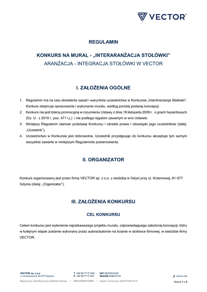 REGULAMIN KONKURS NA MURAL - „INTERARANŻACJA STOŁÓWKI” ARANŻACJA - INTEGRACJA STOŁÓWKI W VECTOR I. ZAŁOŻENIA OGÓLNE 1. Regulamin ma na celu określenie zasad i warunków uczestnictwa w Konkursie „InterAranżacja Stołówki”. Konkurs obejmuje opracowanie i wykonanie muralu, według poniżej podanej koncepcji. 2. Konkurs nie jest loterią promocyjną w rozumieniu Ustawy z dnia 19 listopada 2009 r. o grach hazardowych (Dz. U. z 2016 r. poz. 471 t.j.) i nie podlega regułom zawartym w w/w Ustawie. 3. Niniejszy Regulamin stanowi podstawę Konkursu i określa prawa i obowiązki jego uczestników (dalej: „Uczestnik”). 4. Uczestnictwo w Konkursie jest dobrowolne, Uczestnik przystępując do konkursu akceptuje tym samym wszystkie zawarte w niniejszym Regulaminie postanowienia. II. ORGANIZATOR Konkurs organizowany jest przez firmę VECTOR sp. z o.o. z siedzibą w Gdyni przy ul. Krzemowej, 81-577 Gdynia (dalej: „Organizator”). III. ZAŁOŻENIA KONKURSU CEL KONKURSU Celem konkursu jest wyłonienie najciekawszego projektu muralu, odpowiadającego założonej koncepcji, który w kolejnym etapie zostanie wykonany przez autora/autorów na ścianie w stołówce firmowej, w siedzibie firmy VECTOR. Strona 1 z 5 KONCEPCJA MURALU Mural powinien nawiązywać do idei stołówki, jako miejsca pełniącego dwie funkcję: gastronomiczną i integracyjną. Powinien charakteryzować się innowacyjnością, dynamizmem, a jednocześnie wprowadzać przyjazną atmosferę. To miejsce gdzie podczas przerw na posiłek, kawę czy herbatę można spędzać czas oddając się swobodnym rozmowom ze współpracownikami. Aby wejść w klimat panujący w firmie i dopasować pomysł, uczestnik konkursu może odwołać się do strony internetowej: www.vector.net. Inspiracją może być także kolorystyka, należąca do wizerunku grupy VECTOR: Strona 2 z 5 MIEJSCE I TECHNIKA WYKONANIA MURALU Mural wykonany będzie na ścianie w rozmiarach 3x10,7m w stołówce pracowniczej w siedzibie formy VECTOR, mieszczącej się przy ul. Krzemowej 6 w Gdyni. Zdjęcie ściany stanowi Załącznik nr 1 do niniejszego Regulaminu. Mural powinien być wykonany farbami dostosowanymi do malowania na ścianie wewnątrz budynku. IV. WARUNKI KONKURSU 1. Organizator ustala następujące warunki konkursu: Konkurs dedykowany jest wyłącznie dla osób fizycznych - studentów i absolwentów wyższych szkół plastycznych posiadających pełną zdolność do czynności prawnych. Autorem projektu może być jeden student lub grupa studentów. Wykonanie projektu powinno zająć maksymalnie 7 dni. W przypadku grupy studentów, wymaga się aby jeden z nich został podany jako lider grupy, odpowiedzialny za terminowe wykonanie projektu oraz, na którego ręce zostanie przekazana nagroda. Strona 3 z 5 Student lub grupa studentów wysyłają projekt, składający się z dwóch części: wizualizacja muralu i osobny plik określający sposób wykonania muralu, wraz z kartą zgłoszenia, która stanowi Załącznik nr 2 do niniejszego Regulaminu. Projekt konkursowy powinien zostać nadesłany na adres: [email protected] z dopiskiem w temacie Zgłoszenie do konkursu na mural. Organizator przyjmuje zgłoszenia do dnia 11.10.2016 do godziny 15.00. Po tym terminie nadesłane projekty nie będą rozpatrywane. Projekty konkursowe oceniane będą przez Jury powołane przez organizatora pod względem walorów artystycznych, i założeń konkursowych wymienionych w pkt. III. 2. Uczestnictwa w konkursie, jak i praw i obowiązków z nim związanych, w tym także prawa do żądania wydania nagrody, nie można przenosić na inne osoby i podmioty. 3. Każdy z Uczestników może zgłosić do konkursu nieograniczoną liczbę projektów, pod warunkiem, że będą to jego autorskie (tj. wykonane samodzielnie) projekty graficzne. 4. Zgłaszając projekt Uczestnik akceptuje w całości Regulamin i zobowiązuje się do przestrzegania określonych w nim zasad, jak również potwierdza, że spełnia wszystkie warunki, które uprawniają go do udziału w konkursie. 5. W Konkursie biorą wszystkie projekty zgłoszone przez Uczestników i zakwalifikowane przez Organizatora. 6. Zgłaszając projekt Uczestnik oświadcza, że jest jej autorem oraz wyłącznym właścicielem jej prawa autorskich i majątkowych. Wszelkie roszczenia osób trzecich w w/w zakresie będą kierowane przez Organizatora bezpośrednio do Uczestnika Konkursu, który wraz ze zgłoszeniem projektu zwalnia Organizatora z jakiejkolwiek odpowiedzialności w tym zakresie. Organizator zastrzega sobie prawo do odrzucenia projektu w przypadku wątpliwości dotyczących praw autorskich. 7. Podczas kwalifikacji z zasady odrzucane będą projekty zawierające treści sprzeczne z dobrymi obyczajami, i obowiązującym prawem czy przedstawiające firmy konkurencyjne wobec Organizatora. V. Wyniki konkursu i nagroda 1. Wyniki konkursu zostaną podane na trzeci dzień po zakończeniu przyjmowania zgłoszeń, tzn. 14.10. do godziny 12.00 na stronie, na której konkurs został ogłoszony, natomiast zwycięzca konkursu zostanie dodatkowo poinformowany telefonicznie. 2. Przeniesienie przez zwycięzcę konkursu praw własności intelektualnej do projektu nastąpi na podstawie odrębnej umowy. 3. W dniu rozpoczęcia wykonania muralu strony podpiszą umowę o dzieło wraz z przeniesieniem autorskich praw majątkowych do projektu na przedstawicieli firmy VECTOR , której wzór stanowi Złącznik nr 3 do niniejszego Regulaminu. 4. Jury wybierze najlepszy projekt a jego autora nagrodzi nagrodą pieniężną w kwocie 3000,00 zł brutto (słownie: trzy tysiące złotych). Nagroda zostanie przekazana po wykonaniu muralu. W przypadku gdy Strona 4 z 5 autorem będzie grupa studentów, nagroda zostaje przekazana na ręce lidera, podanego w karcie zgłoszenia, o której mowa w pkt. IV, otrzymana kwota ulega podziałowi między poszczególnych autorów projektu. 5. Podatek dochodowy od nagrody pokrywa w całości autor zwycięskiego proje