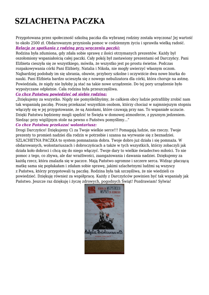 SZLACHETNA PACZKA Przygotowana przez społeczność szkolną paczka dla wybranej rodziny została wręczona! Jej wartość to około 2500 zł. Obdarowanym przyniosła pomoc w codziennym życiu i sprawiła wielką radość. Relacja ze spotkania z rodziną przy wręczeniu paczki: Rodzina była zdumiona, gdy zdała sobie sprawę z ilości otrzymanych prezentów. Każdy był oszołomiony wspaniałością całej paczki. Cały pokój był zastawiony prezentami od Darczyńcy. Pani Elżbieta cieszyła się ze wszystkiego, mówiła, że wszystko jest po prostu świetne. Podczas rozpakowywania córki Pani Elżbiety, Natalia i Nikola, nie mogły uwierzyć własnym oczom. Najbardziej podobały im się ubrania, obuwie, przybory szkolne i oczywiście dwa nowe biurka do nauki. Pani Elżbieta bardzo ucieszyła się z nowego nebulizatora dla córki, która choruje na astmę. Powiedziała, że nigdy nie byłoby ją stać na takie nowe urządzenie. Do tej pory urządzenie było wypożyczane odpłatnie. Cała rodzina była przeszczęśliwa. Co chce Państwu powiedzieć od siebie rodzina: „Dziękujemy za wszystko. Nigdy nie pomyślelibyśmy, że całkiem obcy ludzie potrafiliby zrobić nam tak wspaniałą paczkę. Proszę przekazać wszystkim osobom, którzy chociaż w najmniejszym stopniu włączyły się w jej przygotowanie, że są Aniołami, które czuwają przy nas. To wspaniałe uczucie. Dzięki Państwu będziemy mogli spędzić te Święta w domowej atmosferze, z pysznym jedzeniem. Siedząc przy wigilijnym stole na pewno o Państwu pomyślimy...” Co chce Państwu przekazać wolontariusz: Drogi Darczyńco! Dziękujemy Ci za Twoje wielkie serce!!! Pomagają ludzie, nie rzeczy. Twoje prezenty to promień nadziei dla rodzin w potrzebie i szansa na wyrwanie się z beznadziei. SZLACHETNA PACZKA to system pomnażania dobra. Twoje dobro już działa i się pomnaża. W obdarowanych, wolontariuszach i dobroczyńcach a także w tych wszystkich, którzy zobaczyli jak działa koło dobroci i chcą się do niego włączyć. Twoje dary to wielkie świadectwo miłości. To nie pomoc z tego, co zbywa, ale dar wrażliwości, zaangażowania i dawania nadziei. Dziękujemy za każdą rzecz, która znalazła się w paczce. Mają Państwo ogromne i szczere serca. Widząc płaczącą matkę sama się popłakałam i zdałam sobie sprawę, jakimi szlachetnymi ludźmi są wszyscy z Państwa, którzy przygotowali tą paczkę. Rodzina była tak szczęśliwa, że nie wiedzieli co powiedzieć. Dziękuję również za współpracę. Każdy z Darczyńców powinien być tak wspaniały jak Państwo. Jeszcze raz dziękuję i życzę zdrowych, pogodnych Świąt! Pozdrawiam! Sylwia!