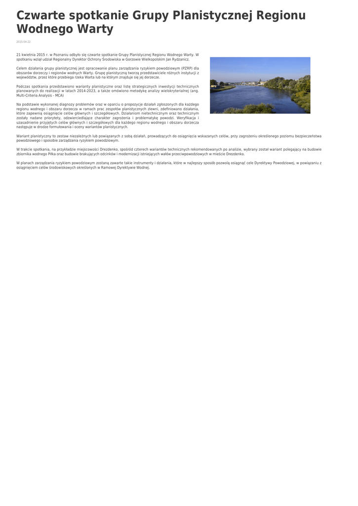 Czwarte spotkanie Grupy Planistycznej Regionu Wodnego Warty 2015-04-22 21 kwietnia 2015 r. w Poznaniu odbyło się czwarte spotkanie Grupy Planistycznej Regionu Wodnego Warty. W spotkaniu wziął udział Regionalny Dyrektor Ochrony Środowiska w Gorzowie Wielkopolskim Jan Rydzanicz. Celem działania grupy planistycznej jest opracowanie planu zarządzania ryzykiem powodziowym (PZRP) dla obszarów dorzeczy i regionów wodnych Warty. Grupę planistyczną tworzą przedstawiciele różnych instytucji z województw, przez które przebiega rzeka Warta lub na którym znajduje się jej dorzecze. Podczas spotkania przedstawiono warianty planistyczne oraz listę strategicznych inwestycji technicznych planowanych do realizacji w latach 2014-2023, a także omówiono metodykę analizy wielokryterialnej (ang. Multi-Criteria Analysis - MCA) Na podstawie wykonanej diagnozy problemów oraz w oparciu o propozycje działań zgłoszonych dla każdego regionu wodnego i obszaru dorzecza w ramach prac zespołów planistycznych zlewni, zdefiniowano działania, które zapewnią osiągnięcie celów głównych i szczegółowych. Działaniom nietechnicznym oraz technicznym zostały nadane priorytety, odzwierciedlające charakter zagrożenia i problematykę powodzi. Weryfikacja i uzasadnienie przyjętych celów głównych i szczegółowych dla każdego regionu wodnego i obszaru dorzecza następuje w drodze formułowania i oceny wariantów planistycznych. Wariant planistyczny to zestaw niezależnych lub powiązanych z sobą działań, prowadzących do osiągnięcia wskazanych celów, przy zagrożeniu określonego poziomu bezpieczeństwa powodziowego i sposobie zarządzania ryzykiem powodziowym. W trakcie spotkania, na przykładzie miejscowości Drezdenko, spośród czterech wariantów technicznych rekomendowanych po analizie, wybrany został wariant polegający na budowie zbiornika wodnego Piłka oraz budowie brakujących odcinków i modernizacji istniejących wałów przeciwpowodziowych w mieście Drezdenko. W planach zarządzania ryzykiem powodziowym zostaną zawarte takie instrumenty i działania, które w najlepszy sposób pozwolą osiągnąć cele Dyrektywy Powodziowej, w powiązaniu z osiągnięciem celów środowiskowych określonych w Ramowej Dyrektywie Wodnej.