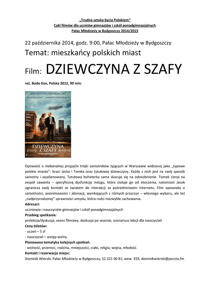 „Trudna sztuka bycia Polakiem” Cykl filmów dla uczniów gimnazjów i szkół ponadgimnazjalnych Pałac Młodzieży w Bydgoszczy 2014/2015 22 października 2014, godz. 9:00, Pałac Młodzieży w Bydgoszczy Temat: mieszkańcy polskich miast Film: DZIEWCZYNA Z SZAFY reż. Bodo Kox, Polska 2012, 90 min. Opowieść o niebanalnej przyjaźni trójki samotników żyjących w Warszawie widzianej jako „typowe polskie miasto”: braci Jacka i Tomka oraz tytułowej dziewczyny. Każdy z nich jest na swój sposób samotny i wyalienowany. Tytułowa bohaterka sama skazuje się na odosobnienie. Tomek cierpi na zespół sawanta – specyficzną dysfunkcję mózgu, która izoluje go od otoczenia, natomiast Jacek ogranicza swój kontakt ze światem do interakcji za pośrednictwem Internetu. Film opowiada o samotności, anonimowości i alienacji, wynikających z różnych przyczyn – własnego wyboru, ale też „nadprzyrodzonej” sprawności umysłu, która rodzi niezwykłe zachowania. Adresaci: uczniowie i nauczyciele gimnazjów i szkół ponadgimnazjalnych Przebieg spotkania: prelekcja/dyskusja, seans filmowy, dyskusja po seansie, scenariusz lekcji dla nauczycieli Ceny biletów: - uczeń – 5 zł - nauczyciel – wstęp wolny Planowana tematyka kolejnych spotkań: - wolność, przemoc, rodzina, mniejszości, ciało, religia, wojna, młodość. Kontakt i rezerwacja miejsc: Dominik Wierski, Pałac Młodzieży w Bydgoszczy, 52 321 00 81, wew. 359, [email protected]