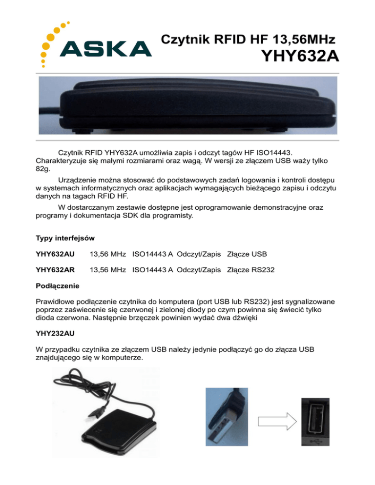 Czytnik RFID HF 13,56MHz YHY632A Czytnik RFID YHY632A umożliwia zapis i odczyt tagów HF ISO14443. Charakteryzuje się małymi rozmiarami oraz wagą. W wersji ze złączem USB waży tylko 82g. Urządzenie można stosować do podstawowych zadań logowania i kontroli dostępu w systemach informatycznych oraz aplikacjach wymagających bieżącego zapisu i odczytu danych na tagach RFID HF. W dostarczanym zestawie dostępne jest oprogramowanie demonstracyjne oraz programy i dokumentacja SDK dla programisty. Typy interfejsów YHY632AU 13,56 MHz ISO14443 A Odczyt/Zapis Złącze USB YHY632AR 13,56 MHz ISO14443 A Odczyt/Zapis Złącze RS232 Podłączenie Prawidłowe podłączenie czytnika do komputera (port USB lub RS232) jest sygnalizowane poprzez zaświecenie się czerwonej i zielonej diody po czym powinna się świecić tylko dioda czerwona. Następnie brzęczek powinien wydać dwa dźwięki YHY232AU W przypadku czytnika ze złączem USB należy jedynie podłączyć go do złącza USB znajdującego się w komputerze. YHY232AR W czytniku ze złączem RS232 do komputera należy podłączyć złącze RS232 oraz USB (w celu zapewnienia zasilania). Specyfikacja techniczna Częstotliwość pracy Obsługiwane karty 13,56 MHz TypeA: Mifare One (S50/70) / UltraLight / Mifare ProX Złącza USB lub RS232 Minimalna Szybkość transmisji [b/s] Typowa USB 11520 RS232 9600 11520 Czas zapisu i odczytu karty <100 ms Zasięg odczytu 0-70 mm Napięcie zasilania [V] Zakres temperatur pracy [oC] Typowe Maksymalne 4,5 5 5,5 Minimalna Typowa Maksymalna 0 25 60 - 25 ~ 80oC Wymiary 95 x 75 x 18 mm YHY232AU YHY232AR 82g 152g Długość kabla Sygnalizacja 11520 Minimalne Zakres temperatur magazynowania Waga Maksymalna 1,5m Dwie diody LED oraz brzęczyk (sterowane oprogramowaniem) Dopuszczalna wilgotność otoczenia <90% ASKA ul. Wędkarska 2A/B1, 04-869 Warszawa tel. 22 4985908/9, fax 22 6177020 e-mail: [email protected] www.kodykreskowe.com