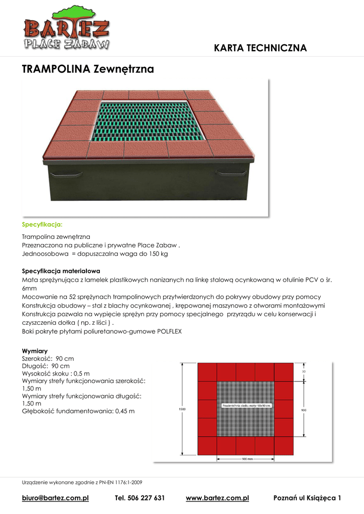 KARTA TECHNICZNA TRAMPOLINA Zewnętrzna Specyfikacja: Trampolina zewnętrzna Przeznaczona na publiczne i prywatne Place Zabaw . Jednoosobowa = dopuszczalna waga do 150 kg Specyfikacja materiałowa Mata sprężynująca z lamelek plastikowych nanizanych na linkę stalową ocynkowaną w otulinie PCV o śr. 6mm Mocowanie na 52 sprężynach trampolinowych przytwierdzonych do pokrywy obudowy przy pomocy Konstrukcja obudowy – stal z blachy ocynkowanej , krępowanej maszynowo z otworami montażowymi Konstrukcja pozwala na wypięcie sprężyn przy pomocy specjalnego przyrządu w celu konserwacji i czyszczenia dołka ( np. z liści ) . Boki pokryte płytami poliuretanowo-gumowe POLFLEX Wymiary Szerokość: 90 cm Długość: 90 cm Wysokość skoku : 0,5 m Wymiary strefy funkcjonowania szerokość: 1,50 m Wymiary strefy funkcjonowania długość: 1,50 m Głębokość fundamentowania: 0,45 m Urządzenie wykonane zgodnie z PN-EN 1176:1-2009 [email protected] Tel. 506 227 631 www.bartez.com.pl Poznań ul Książęca 1