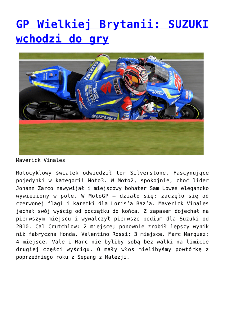 GP Wielkiej Brytanii: SUZUKI wchodzi do gry Maverick Vinales Motocyklowy światek odwiedził tor Silverstone. Fascynujące pojedynki w kategorii Moto3. W Moto2, spokojnie, choć lider Johann Zarco nawywijał i miejscowy bohater Sam Lowes elegancko wywieziony w pole. W MotoGP – działo się; zaczęło się od czerwonej flagi i karetki dla Loris’a Baz’a. Maverick Vinales jechał swój wyścig od początku do końca. Z zapasem dojechał na pierwszym miejscu i wywalczył pierwsze podium dla Suzuki od 2010. Cal Crutchlow: 2 miejsce; ponownie zrobił lepszy wynik niż fabryczna Honda. Valentino Rossi: 3 miejsce. Marc Marquez: 4 miejsce. Vale i Marc nie byliby sobą bez walki na limicie drugiej części wyścigu. O mały włos mielibyśmy powtórkę z poprzedniego roku z Sepang z Malezji.