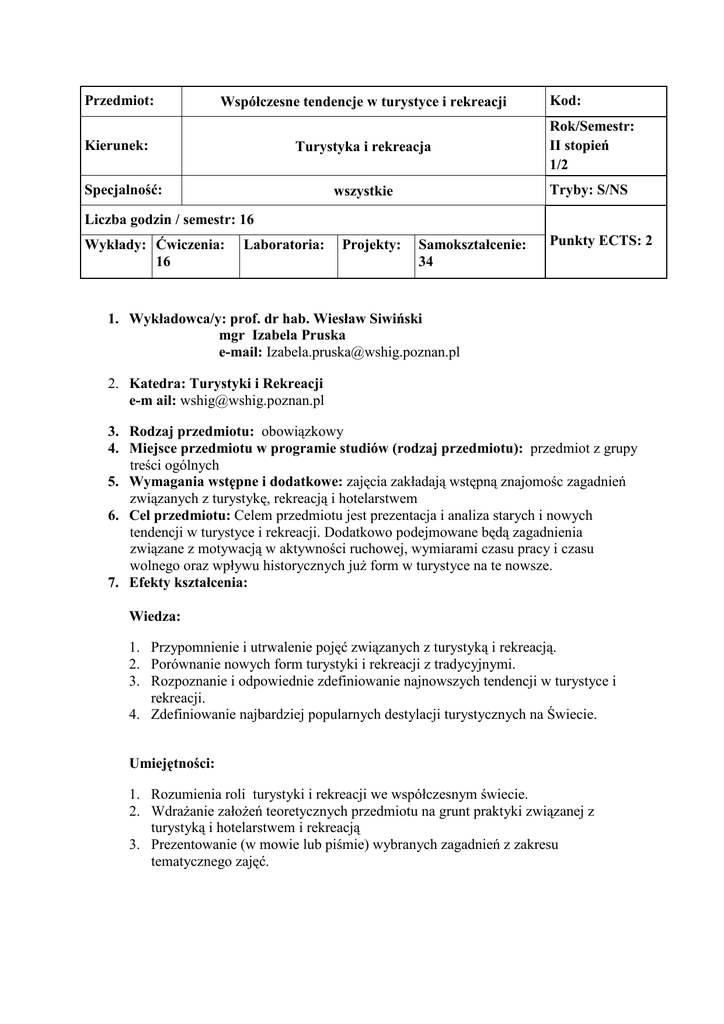Przedmiot: Współczesne tendencje w turystyce i rekreacji Kierunek: Kod: Turystyka i rekreacja Rok/Semestr: II stopień 1/2 wszystkie Tryby: S/NS Specjalność: Liczba godzin / semestr: 16 Wykłady: Ćwiczenia: 16 Laboratoria: Projekty: Samokształcenie: 34 Punkty ECTS: 2 1. Wykładowca/y: prof. dr hab. Wiesław Siwiński mgr Izabela Pruska e-mail: [email protected] 2. Katedra: Turystyki i Rekreacji e-m ail: [email protected] 3. Rodzaj przedmiotu: obowiązkowy 4. Miejsce przedmiotu w programie studiów (rodzaj przedmiotu): przedmiot z grupy treści ogólnych 5. Wymagania wstępne i dodatkowe: zajęcia zakładają wstępną znajomośc zagadnień związanych z turystykę, rekreacją i hotelarstwem 6. Cel przedmiotu: Celem przedmiotu jest prezentacja i analiza starych i nowych tendencji w turystyce i rekreacji. Dodatkowo podejmowane będą zagadnienia związane z motywacją w aktywności ruchowej, wymiarami czasu pracy i czasu wolnego oraz wpływu historycznych juŜ form w turystyce na te nowsze. 7. Efekty kształcenia: Wiedza: 1. Przypomnienie i utrwalenie pojęć związanych z turystyką i rekreacją. 2. Porównanie nowych form turystyki i rekreacji z tradycyjnymi. 3. Rozpoznanie i odpowiednie zdefiniowanie najnowszych tendencji w turystyce i rekreacji. 4. Zdefiniowanie najbardziej popularnych destylacji turystycznych na Świecie. Umiejętności: 1. Rozumienia roli turystyki i rekreacji we współczesnym świecie. 2. WdraŜanie załoŜeń teoretycznych przedmiotu na grunt praktyki związanej z turystyką i hotelarstwem i rekreacją 3. Prezentowanie (w mowie lub piśmie) wybranych zagadnień z zakresu tematycznego zajęć. Inne kompetencje (personalne i społeczne) 1. Aktywna postawa wobec róŜnorodności tematyki związanej z turystyką i rekreacją. 2. Dbałość o zachowanie równowagi w środowisku w zakresie ekspansji turystycznej. 3. Popularyzowanie aktywnych (nowatorskich) form wypoczynku i rekreacji w powiązaniu ze zdrowym stylem Ŝycia. 4. Kształtowanie otwartości postaw w stosunku do rekreacji osób niepełnosprawnych. 8. Metody dydaktyczne: dyskusja dydaktyczna dotycząca przedmiotu oraz poprawności przeprowadzonej analizy, prezentacje multimedialne. 9. Forma i warunki zaliczenia przedmiotu, w tym zasady dopuszczenia do egzaminu, zaliczenia z przedmiotu, a takŜe formę i warunki zaliczenia poszczególnych form zajęć wchodzących w zakres danego przedmiotu: samodzielne przygotowanie przez studenta prezentacji na temat współczesnych tendencji w turystyce lub rekreacji, aktywność, obecność. 10. Elementy składowe oceny końcowej: aktywność w dyskusji-25%, prezentacja multimedialna – 25%, kolokwium semestralne 50% 11. Całkowity nakład pracy studenta potrzebny do osiągnięcia efektów w godzinach: Ćwiczenia - 16, czas na lektury i przygotowanie się do zajęć - 10, przygotowanie prezentacji – 6, praca semestralna – 18 . Razem 34 godzin 12. Treści merytoryczne przedmiotu: 1. Wprowadzenie do zagadnień związanych z turystyką i rekreacją oraz jej nowymi trendami. 2. Przyrodnicze oraz geograficzno-przestrzenne aspekty współczesnej turystyki. 3. Uwarunkowania społeczno-ekonomiczne współczesnej turystyki. 4. Socjologiczne-psychologiczne mechanizmy nowych tendencji w turystyce i rekreacji. 5. Postęp techniczny a nowe tendencje w turystyce i rekreacji. 6. Marketing siłą napędową zmian w turystyce i rekreacji. 7. Uczestnictwo wybranych grup społecznych w turystyce i rekreacji (aktywność dzieci i młodzieŜy, współczesnej rodziny, osób starszych i niepełnosprawnych) 8. Współczesne rodzaje turystyki i rekreacji (turystyka ekologiczna, biznesowa, religijna, ekstremalna, kosmiczna, historyczno-militarna, ekskluzywna, zdrowotna) 9. PodróŜe ekscentryczne (podróŜe ze smakiem, adrenaliną, przygodą) 10. Europejskie Parki Rozrywki 13. Wykaz literatury podstawowej i uzupełniającej, obowiązującej do zaliczenia danego przedmiotu: Literatura obowiązkowa: 1. Turystyka i rekreacja we współczesnym świecie. L. Wojtasik, R.D. Tauber. WSHiG, Poznań 2011 2. Nowe tendencje w kulturze fizycznej i turystyce w kontekście Hotelarstwa i gastronomi. W. Siwiński, R.D. Tauber, E. Mucha-Szajek. WSHiG, Poznań 2007 3. Współczesne problemy hotelarstwa, gastronomii, turystyki i rekreacji, W. Siwiński, R.D. Tauber, E. Mucha-Szajek. WSHiG, Poznań 2008 4. Syntetyczne podstawy rekreacji i turystyki. M. Duricek, K. Obodyński. WURz, Rzeszów 2006 5. Podstawy rekreacji i turystyki. [red.] S. Toczek – Werner. AWF Wrocław 2005 Literatura uzupełniająca: 1. Wspólczesne tendencje w turystyce i rekreacji, Wyrzykowski J., Klementowski K., AWF Wrocław 2004 2. Współczesne tendencje w rozwoju form rekreacyjnych i turystycznych, A.P. Lubowiecki-Viku, M. Paczyńska-Jędrycka M, Poznań 2010 3. Turystyka – Władysław Gaworecki, Polskie Wydawnictwo Ekonomiczne, Warszawa 2007 14. Język wykładowy: polski 15. Praktyki zawodowe w ramach przedmiotu: nie dotyczy