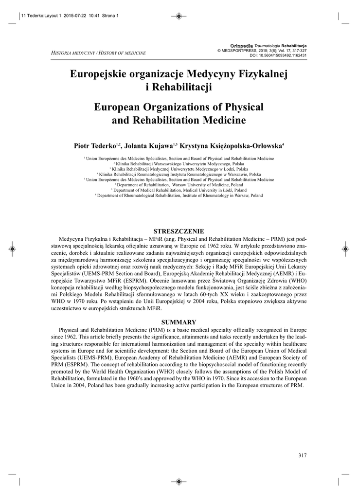 11 Tederko:Layout 1 2015-07-22 10:41 Strona 1 O r t o p e d i a Traumatologia Rehabilitacja © MEDSPORTPRESS, 2015; 3(6); Vol. 17, 317-327 DOI: 10.5604/15093492.1162431 HISTORIA MEDYCYNY / HISTORY OF MEDICINE Europejskie organizacje Medycyny Fizykalnej i Rehabilitacji European Organizations of Physical and Rehabilitation Medicine Piotr Tederko1,2, Jolanta Kujawa1,3 Krystyna Księżopolska-Orłowska4 1 Union Européenne des Médecins Spécialistes, Section and Board of Physical and Rehabilitation Medicine 2 Klinika Rehabilitacji Warszawskiego Uniwersytetu Medycznego, Polska 3 Klinika Rehabilitacji Medycznej Uniwersytetu Medycznego w Łodzi, Polska 4 Klinika Rehabilitacji Reumatologicznej Instytutu Reumatologicznego w Warszawie, Polska 1 Union Européenne des Médecins Spécialistes, Section and Board of Physical and Rehabilitation Medicine 2 Department of Rehabilitation, Warsaw University of Medicine, Poland 3 Department of Medical Rehabilitation, Medical University in Łódź, Poland 4 Department of Rheumatological Rehabilitation, Institute of Rheumatology in Warsaw, Poland STRESZCZENIE Medycyna Fizykalna i Rehabilitacja – MFiR (ang. Physical and Rehabilitation Medicine – PRM) jest podstawową specjalnością lekarską oficjalnie uznawaną w Europie od 1962 roku. W artykule przedstawiono znaczenie, dorobek i aktualnie realizowane zadania najważniejszych organizacji europejskich odpowiedzialnych za międzynarodową harmonizację szkolenia specjalizacyjnego i organizację specjalności we współczesnych systemach opieki zdrowotnej oraz rozwój nauk medycznych: Sekcję i Radę MFiR Europejskiej Unii Lekarzy Specjalistów (UEMS-PRM Section and Board), Europejską Akademię Rehabilitacji Medycznej (AEMR) i Europejskie Towarzystwo MFiR (ESPRM). Obecnie lansowana przez Światową Organizację Zdrowia (WHO) koncepcja rehabilitacji według biopsychospołecznego modelu funkcjonowania, jest ściśle zbieżna z założeniami Polskiego Modelu Rehabilitacji sformułowanego w latach 60-tych XX wieku i zaakceptowanego przez WHO w 1970 roku. Po wstąpieniu do Unii Europejskiej w 2004 roku, Polska stopniowo zwiększa aktywne uczestnictwo w europejskich strukturach MFiR. SUMMARY Physical and Rehabilitation Medicine (PRM) is a basic medical specialty officially recognized in Europe since 1962. This article briefly presents the significance, attainments and tasks recently undertaken by the leading structures responsible for international harmonization and management of the specialty within healthcare systems in Europe and for scientific development: the Section and Board of the European Union of Medical Specialists (UEMS-PRM), European Academy of Rehabilitation Medicine (AEMR) and European Society of PRM (ESPRM). The concept of rehabilitation according to the biopsychosocial model of functioning recently promoted by the World Health Organization (WHO) closely follows the assumptions of the Polish Model of Rehabilitation, formulated in the 1960’s and approved by the WHO in 1970. Since its accession to the European Union in 2004, Poland has been gradually increasing active participation in the European structures of PRM. 317 11 Tederko:Layout 1 2015-07-22 10:41 Strona 2 Tederko P. i wsp. Europejskie organizacje Medycyny Fizykalnej i Rehabilitacji Physical Medicine and Rehabilitation (PRM) – medycyna fizykalna i rehabilitacja (MFiR) – to oficjalne europejskie określenie rehabilitacji medycznej – podstawowej specjalizacji lekarskiej rozpoznawanej we wszystkich państwach Europy oprócz Danii i Malty. Europejska Unia Lekarzy Specjalistów – Union Européenne des Médecins Spécialistes (UEMS), to założone 20 czerwca 1958 roku przedstawicielstwo specjalności lekarskich wobec Komisji Europejskiej. UEMS odpowiada przed Stałym Komitetem Lekarzy, w którym uczestniczą krajowe zawodowe organizacje lekarskie. Obecnym prezydentem UEMS jest prof. Romuald Krajewski z Warszawy. Tworzenie sekcji w UEMS przysługuje specjalizacjom uznawanym w przynajmniej dwóch trzecich państw członkowskich. Sekcję Medycyny Fizykalnej i Rehabilitacji UEMS (UEMS-PRM) powołano w 1962 roku jako strukturę statutową odpowiedzialną przed Europejskim Komisarzem do spraw Zdrowia i jako jedyne oficjalne przedstawicielstwo MFiR w strukturach administracyjnych Unii Europejskiej (UE). UEMS-PRM jest organizacją typu non-profit. Delegaci za swą prace nie otrzymują wynagrodzeń. Źródłem finansowania działalności statutowej są roczne opłaty członkowskie uzależnione od ilości aktywnych członków krajowych stowarzyszeń lekarzy MFiR. Wynoszą one 1,5 Euro od członka krajowego stowarzyszenia w państwach z pełnoprawnym członkostwem i 1 Euro w przypadku krajów stowarzyszonych. Inne źródła dochodów to opłaty egzaminacyjne i związane z certyfikacją europejskich ośrodków szkolących oraz wpłaty za akredytację programów opieki zdrowotnej. Obecnie w skład UEMS jako pełnoprawni członkowie wchodzą państwa UE, Islandia, Norwegia i Szwajcaria zaś Azerbejdżan, Bośna i Hercegowina, Czarnogóra, Gruzja, Liban, Macedonia, Maroko, Rosja, Serbia i Turcja mają status obserwatorów. Prezydentem sekcji UEMS-PRM jest prof. Nicolas Christodoulou z Cypru. W 1989 roku UEMS-PRM wraz z Europejską Akademią Rehabilitacji Medycznej (AERM) i Międzynarodowym Towarzystwem Medycyny Fizykalnej i Rehabilitacji (ISPRM) opracowały pierwsze wydanie Białej Księgi Medycyny Fizykalnej i Rehabilitacji w Europie (White Book on Physical and Rehabilitation Medicine – zbioru wytycznych w zakresie kompetencji lekarza MFiR i relacji MFiR w odniesieniu do innych medycznych dyscyplin. Od tego czasu ukazało się kilka aktualizacji Białej Księgi oraz wydania w 9 europejskich językach [1]. Polskie tłumaczenie Białej Księgi opublikowano w 2014 roku [2]. Według definicji podanej w Białej Księdze, MFiR jest specjalnością medyczną uwzględniającą rehabilitację jako podstawową strategię zdrowia. Jej działania obejmują dia