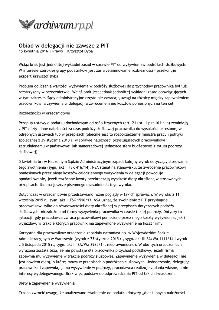 Obiad w delegacji nie zawsze z PIT 15 kwietnia 2016 | Prawo | Krzysztof Dyba Wciąż brak jest jednolitej wykładni zasad w sprawie PIT od wyżywieniaw podróżach służbowych. W interesie szerokiej grupy podatników jest zaś wyeliminowanie rozbieżności – przekonuje ekspert Krzysztof Dyba. Problem doliczania wartości wyżywienia w podróży służbowej do przychodów pracownika był już rozstrzygany w orzecznictwie. Wciąż brak jest jednak jednolitej wykładni zasad obowiązujących w tym zakresie. Sądy administracyjne często nie zwracają uwagi na różnicę między zapewnieniem pracownikowi wyżywienia w delegacji a zwróceniem mu kosztów poniesionych na ten cel. Rozbieżności w orzecznictwie Przepisy ustawy o podatku dochodowym od osób fizycznych (art. 21 ust. 1 pkt 16 lit. a) zwalniają z PIT diety i inne należności za czas podróży służbowej pracownika do wysokości określonej w odrębnych ustawach lub w przepisach (obecnie jest to rozporządzenie ministra pracy i polityki społecznej z 29 stycznia 2013 r. w sprawie należności przysługujących pracownikowi zatrudnionemu w państwowej lub samorządowej jednostce sfery budżetowej z tytułu podróży służbowej). 5 kwietnia br. w Naczelnym Sądzie Administracyjnym zapadł kolejny wyrok dotyczący stosowania tego zwolnienia (sygn. akt II FSK 416/14). NSA stanął na stanowisku, że zwrócenie pracownikowi poniesionych przez niego kosztów całodziennego wyżywienia w delegacji powoduje opodatkowanie, jeżeli zwrócone kwoty przekraczają wysokość diety określoną w stosowanych przepisach. Nie ma jeszcze pisemnego uzasadnienia tego wyroku. Dotychczas w orzecznictwie przedstawiano różne poglądy w takich sprawach. W wyroku z 11 września 2015 r., sygn. akt II FSK 1516/13, NSA uznał, że zwolnienie z PIT przysługuje pracownikowi tylko do równowartości diety określonej w przepisach dotyczących podróży służbowych, niezależnie od formy wyżywienia pracownika w czasie takiej podróży. Dotyczy to sytuacji, gdy pracodawca zwraca pracownikowi poniesione przez niego koszty wyżywienia, jak i wyjazdów, w trakcie których pracownik ma zapewnione wyżywienie na koszt firmy. Korzystne dla pracowników orzeczenia zapadały natomiast np. w Wojewódzkim Sądzie Administracyjnym w Warszawie (wyrok z 23 stycznia 2015 r., sygn. akt III SA/Wa 1111/14 i wyrok z 5 listopada 2015 r., sygn. akt III SA/Wa 3985/14, nieprawomocne). W obu tych orzeczeniach wyrażona została teza, że nie powstaje dla pracownika przychód podatkowy, jeżeli firma zapewnia mu wyżywienie w trakcie podróży służbowej. Zapewnienie wyżywienia w delegacji nie jest bowiem dietą, o której mowa w przepisach o podróżach służbowych. Jednocześnie, delegując pracownika i zapewniając mu wyżywienie w podróży, pracodawca realizuje zadania własne, a nie interesy wydelegowanego. Brak więc podstaw do odprowadzania PIT od takich świadczeń. Diety a zapewnienie wyżywienia Trzeba zwrócić uwagę, że analizowane zwolnienie od podatku dotyczy „diet i innych należności za czas podróży służbowej pracownika". W orzecznictwie niedostatecznie akcentuje się, że należności te obejmują jedynie świadczenia o charakterze pieniężnym dokonywane przez pracodawcę na rzecz pracownika w związku z kosztami poniesionymi w delegacji. Takie świadczenia stanowią przychód pracownika korzystający ze zwolnienia z PIT, jeżeli nie przekraczają limitów określonych w przepisach o podróżach służbowych. Czym innym jest natomiast zapewnienie pracownikowi wyżywienia w delegacji. Nie jest to ani dieta, ani inna należność określona w powołanych przepisach. Jest to jedynie okoliczność wyłączająca obowiązek wypłaty diety przez pracodawcę. To pracodawca decyduje, czy zapewni pracownikowi wyżywienie, czy też wypłaci mu należności pokrywające dodatkowe koszty związane z podróżą. Pracownik może z takiego wyżywienia zrezygnować, ale poniesie wtedy wydatki na własne wyżywienie bez prawa do diety. Z tego względu powołane zwolnienie z PIT nie ma zastosowania do delegacji, w trakcie których pracownikowi zapewniono posiłki. Nie dochodzi bowiem do wypłaty na rzecz pracownika diet ani innych należności, o których mowa w przepisach o podróżach służbowych. Brak przychodu Powstaje pytanie, czy zapewnienie przez firmę wyżywienia pracownikowi odbywającemu podróż służbową powoduje dla niego powstanie przychodu podatkowego. Przekonującą odpowiedź daje w tym zakresie powołane wyżej orzecznictwo WSA w Warszawie, według którego nie można w takiej sytuacji mówić o powstaniu przychodu, gdyż świadczenie związane z zapewnieniem pracownikowi wyżywienia wynika przede wszystkim z realizacji zadań pracodawcy. Teza ta nawiązuje bezpośrednio do wyroku Trybunału Konstytucyjnego z 8 lipca 2014 r., sygn. akt K 7/13, w którym określono kryteria uznania świadczenia ponoszonego na rzecz pracownika za nieodpłatne świadczenie stanowiące przychód podatkowy. Po pierwsze, świadczenie takie musi być spełnione za zgodą pracownika, co nie ma miejsca w sytuacji, gdy pracodawca decyduje o zapewnieniu pracownikowi wyżywienia w delegacji zamiast wypłacania mu diet. Po drugie, musi ono zostać spełnione w jego interesie i przynosić mu korzyść w postaci powiększenia aktywów lub uniknięcia wydatku, który musiałby ponieść. Wprawdzie pracownik musiałby ponieść wydatek na własne wyżywienie, nie będąc w podróży, jednak nie musi to być wydatek tej samej wielkości co wartość wyżywienia zapewnionego przez pracodawcę. Skoro z rozstrzygnięcia Trybunału wynika, że przychodem pracownika nie jest wyżywienie zapewnione mu w trakcie tzw. spotkań integracyjnych, gdyż nie są to świadczenia, na które pracownik dobrowolnie poniósłby wydatek, to tym bardziej przychodem takim nie może być wyżywienie zapewnione pracownikowi w czasie podróży służbowej. Celem takiej podróży jest realizacja interes