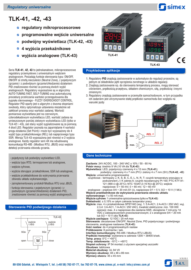 Regulatory uniwersalne TLK-41, -42, -43 regulatory mikroprocesorowe programowalne wejście uniwersalne podwójny wyświetlacz (TLK-42, -43) 4 wyjścia przekaźnikowe wyjścia analogowe (TLK-43) TLK-41 TLK-43 - pojedynczy lub podwójny wyświetlacz LED, - wejścia typu RTD, termoparowe lub analogowe, - wejście cyfrowe, - wyjścia sterujące: przekaźnikowe, SSR lub analogowe, - wejście przekładnikowe do wykrywania przerwania obwodu układu wykonawczego, - zaimplementowany protokół Modbus RTU oraz JBUS, - funkcja sterowania z pojedynczym (grzanie) i z podwójnym (grzanie/chłodzenie) działaniem PID, zrealizowane również za pomocą wyjść analogowych, Sterowanie PID podwójnego działania TLK-43 wyjście 1.rEG wyjście 2.rEG SQo open SQc M close Przykładowe aplikacje 1. Regulatory PID znajdują zastosowanie w automatyce do regulacji procesów, są jednym ze składników pętli sprzężenia zwrotnego w układzie regulacji. 2. Znajdują zastosowanie np. do sterowania temperaturą procesu, mogą sterować ciśnieniem, prędkością przepływu, składem chemicznym, siłą, prędkością i innymi zmiennymi. 3. Regulatory znajdują zastosowanie w przemyśle samochodowym, w tym przypadku ich zadaniem jest utrzymywanie stałej prędkości samochodu bez względu na warunki jazdy sygnalizatory Seria TLK-41, 42, 43 to jednokanałowe, mikroprocesorowe regulatory przemysłowe z uniwersalnym wejściem analogowym. Posiadają funkcje sterowania typu: ON/OFF, ON/OFF ze strefą nieczułości (Neutral Zone), z pojedynczym (grzanie) i z podwójnym (grzanie/chłodzenie) działaniem PID zrealizowane również za pomocą dwóch wyjść analogowych. Regulatory wyposażone są w algorytmy AUTO-TUNING FAST, SELF-TUNING oraz automatyczną procedurę przeliczania wartości przeregulowania dla sygnału sterowanego - FUZZY OVERSCHOOT CONTROL. Regulator PID oparty jest o algorytm z dwoma stopniami swobody, który optymalizuje ustawienia niezależnie od zakłóceń procesu oraz wartości zadanej. Wartość pomiarowa wyświetlana jest na czerwonym, czterodekadowym wyświetlaczu LED, wartość zadana na umieszczonym poniżej zielonym wyświetlaczu LED (tylko w TLK-42 i -43), zaś stany wyjść sygnalizowane są za pomocą 4 diod LED. Regulator pozwala na zapamiętanie 4 wartości progu działania (Set Point) i może być wyposażony do 4 wyjść typu przekaźnikowego (REL) lub napięciowego typu SSR. Wersja TLK-43 wyposażona jest również w 2 wyjścia analogowe. Każdy regulator serii 4X ma wbudowaną komunikację RS-485 (Modbus RTU, JBUS) oraz wejście detekcji przerwania obwodu grzania. min. REL 1 max. REL 2 Dane techniczne Zasilanie: 24V AC/DC, 100 - 240 VAC ± 10% / 50 - 60 Hz Pobór mocy: średnio 9 VA (10 VA dla TLK-43) Wyświetlacz: LED, pojedynczy czerwony 4 x 12 mm (TLK-41); podwójny: czerwony 4 x 7 mm (PV) i zielony 4 x 7 mm (SV) (TLK-42, -43) Wejścia: uniwersalne programowalne czujnikowe - termopary J, K, S, B, C, E, L, N, R, T; czujnik temperatury pracujący w podczerwieni J i K zakres A; czujnik rezystancyjny Pt 100; PTC KTY 81121 (990 W @ 25°C); NTC 103AT-2 (10 KW @ 25°C); wejście napięciowe: 0 ÷ 50 mV, 0 ÷ 60 mV, 12 ÷ 60 mV analogowe - prądowe 0/4 ÷ 20 mA (51 W ) , napięciowe 0/1 ÷ 5 V, 0/2 ÷ 10 V (1 MW ) Wejście przekładnikowe do wykrywania przerwania obwodu układu wykonawczego: 1 x 50 mA max. Wejście cyfrowe: 1 uniwersalne optoizolowane (tylko w TLK-43) Dokładność: ± 0,15% w całym zakresie temperatur pracy Wyjścia: max. 4 x przekaźnikowe SPST-NO (wyj. 1: 5 A-AC1, 2 A-AC3 / 250 VAC; wyj. 2,3,4: 3 A-AC1, 1 A-AC3 / 250 VAC), trwałość elektryczna: min. 100 000 operacji; max. 4 x napięciowe dla zasilania SSR, obciążenie 7 mA przy 14 VDC z zabezpieczeniem przeciwzwarciowym; 2 x analogowe 0/4 ÷ 20 mA lub 0/2 ÷ 10 V (dla TLK-43) Wyjście zasilające: 12 VDC / 20 mA max Sterowanie: dwustanowe ON/OFF, Neutral Zone, PID pojedynczego i podwójnego sterowania, analogowe nastawne (TLK-43) Ilość nastaw: do 4 programowalnych nastaw Próbkowanie: 8 pomiarów / sek. Interfejs komunikacyjny: RS-485 / Modbus RTU (JBUS) Prędkość transmisji: wybierana w zakresie 1200 ÷ 38400 b/sek. Temp. pracy: 0°C ÷ +50°C Temp. składowania: -10°C ÷ +60°C Stopień ochrony: IP 54 montaż z użyciem specjalnej uszczelki Obudowa: tablicowa Materiał obudowy: UL 94 V0 Wymiary obudowy: 48 x 48 x 89 mm Wymiary otworu: 45 x 45 mm V.10.10.1 80-556 Gdańsk, ul. Wielopole 7, tel. (+48 58) 762-07-77, fax 762-07-70, www.simex.pl, e-mail: [email protected] 1.4.1. Regulatory uniwersalne Zakresy pomiarowe Zakres 4 cyfry Zakres 4 cyfry + kropka dz. -160 ÷ 1000°C -100 ÷ 1370°C 0 ÷ 1760°C 72 ÷ 1820°C -150 ÷ 750°C -150 ÷ 900°C -250 ÷ 1300°C -50 ÷ 1760°C -250 ÷ 400°C 0 ÷ 2320°C -160.0 ÷ 999.9°C -100.0 ÷ 999.9°C 0.0 ÷ 999.9°C 72.0 ÷ 999.9°C -150.0 ÷ 750.0°C -150.0 ÷ 900.0°C -199.9 ÷ 999.9°C -50.0 ÷ 999.9°C -199.9 ÷ 400.0°C 0.0 ÷ 999.9°C -46 ÷ -200 ÷ -55 ÷ -50 ÷ -46.0 ÷ 785.0°C -199.9 ÷ 850.0°C -55.0 ÷ 150.0°C -50.0 ÷ 110.0°C Czujnik termopara J termopara K termopara S termopara B termopara E termopara L termopara N termopara R termopara T termopara C czujnik pracujący w podczerwieni Pt 100 PTC NTC 785°C 850°C 150°C 110°C Czujnik Zakres 4 cyfry Zakres 4 cyfry + kropka dz. 0 - 20 mA -1999 ÷ 9999 4 - 20 mA -1999 ÷ 9999 0 - 50 mV -1999 ÷ 9999 0 - 60 mV -1999 ÷ 9999 12 - 60 mV -1999 ÷ 9999 0-5V -1999 ÷ 9999 1-5V -1999 ÷ 9999 0 - 10 V -1999 ÷ 9999 2 - 10 V -1999 ÷ 9999 -199.9 ÷ 999.9 -19.99 ÷ 99.99 -1.999 ÷ 9.999 -199.9 ÷ 999.9 -19.99 ÷ 99.99 -1.999 ÷ 9.999 -199.9 ÷ 999.9 -19.99 ÷ 99.99 -1.999 ÷ 9.999 -199.9 ÷ 999.9 -19.99 ÷ 99.99 -1.999 ÷ 9.999 -199.9 ÷ 999.9 -19.99 ÷ 99.99 -1.999 ÷ 9.999 -199.9 ÷ 999.9 -19.99 ÷ 99.99 -1.999 ÷ 9.999 -199.9 ÷ 999.9 -19.99 ÷ 99.99 -1.999 ÷ 9.999 -199.9 ÷ 999.9 -19.99 ÷ 99.99 -1.999 ÷ 9.999 -199.9 ÷ 999.9 -19.99 ÷ 99.99 -1.999 ÷ 9.999 Przykładowy sposób podłączenia SSR: 7mA/14VDC Analogow