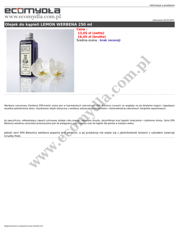 Informacje o produkcie Utworzono 03-03-2017 Olejek do kąpieli LEMON WERBENA 250 ml Cena : 13,05 zł (netto) 16,05 zł (brutto) m yd la . co m .p l Średnia ocena : brak recenzji Werbena cytrynowa (Verbena Officinalis) użyta jest w kosmetykach naturalnych SPA Botanico Lavea® ze względu na jej działanie kojące i łagodzące wszelkie podrażnienia skóry. Uzyskiwany olejek eteryczny z werbeny odznacza się bogactwem i różnorodnością naturalnych związków zapachowych. co Jej specyficzny, odświeżający zapach cytrusowy dodaje ciału energii, odświeża zmysły, dezynfekuje oraz łagodzi zmęczenie i codzienne stresy. Seria SPA Botanico werbena cytrynowa przeznaczona jest do pielęgnacji ciała i twarzy oraz do kąpieli dla panów w każdym wieku. w w w .e Jakość serii SPA Botanico werbena poparta jest atestem, a jej produkcja nie wiąże się z jakimikolwiek testami z udziałem zwierząt (cruelty-free). Wygenerowano w programie www.oscGold.com