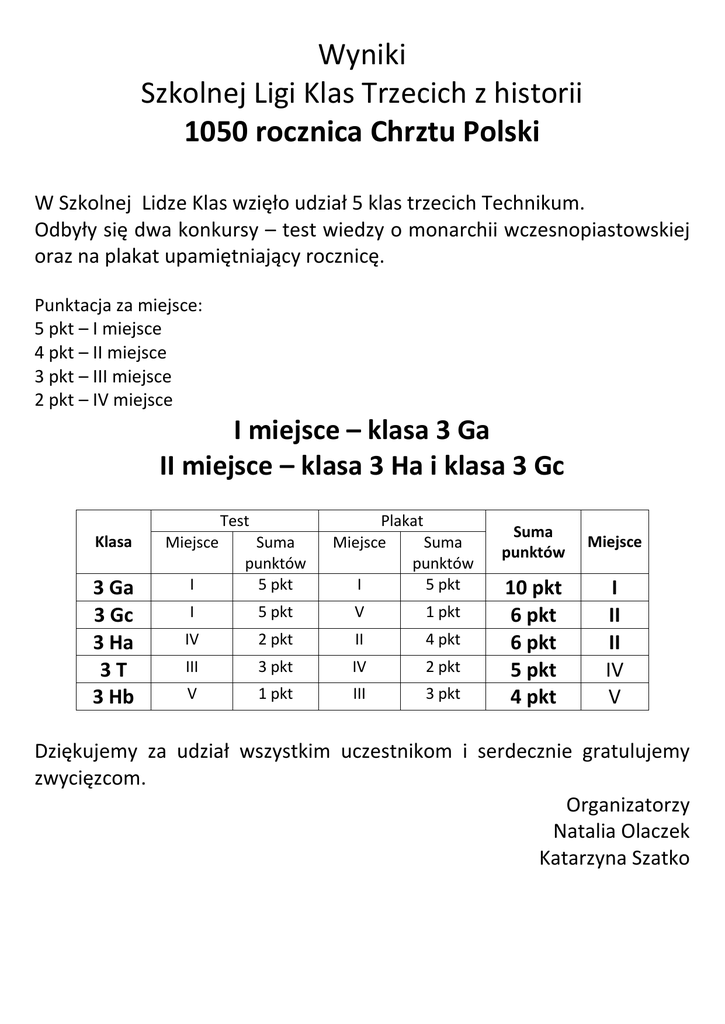 Wyniki Szkolnej Ligi Klas Trzecich z historii 1050 rocznica Chrztu Polski W Szkolnej Lidze Klas wzięło udział 5 klas trzecich Technikum. Odbyły się dwa konkursy – test wiedzy o monarchii wczesnopiastowskiej oraz na plakat upamiętniający rocznicę. Punktacja za miejsce: 5 pkt – I miejsce 4 pkt – II miejsce 3 pkt – III miejsce 2 pkt – IV miejsce I miejsce – klasa 3 Ga II miejsce – klasa 3 Ha i klasa 3 Gc Test Plakat Miejsce Suma punktów I 5 pkt Klasa Miejsce 3 Ga 3 Gc 3 Ha 3T 3 Hb I Suma punktów 5 pkt I 5 pkt V 1 pkt IV 2 pkt II 4 pkt III 3 pkt IV 2 pkt V 1 pkt III 3 pkt Suma punktów Miejsce 10 pkt 6 pkt 6 pkt 5 pkt 4 pkt I II II IV V Dziękujemy za udział wszystkim uczestnikom i serdecznie gratulujemy zwycięzcom. Organizatorzy Natalia Olaczek Katarzyna Szatko