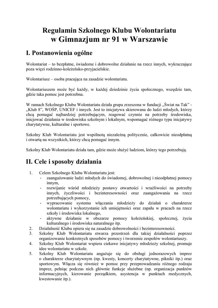 Regulamin Szkolnego Klubu Wolontariatu w Gimnazjum nr 91 w Warszawie I. Postanowienia ogólne Wolontariat – to bezpłatne, świadome i dobrowolne działanie na rzecz innych, wykraczające poza więzi rodzinno-koleżeńsko-przyjacielskie. Wolontariusz – osoba pracująca na zasadzie wolontariatu. Wolontariuszem może być każdy, w każdej dziedzinie życia społecznego, wszędzie tam, gdzie taka pomoc jest potrzebna. W ramach Szkolnego Klubu Wolontariatu działa grupa zrzeszona w fundacji „Świat na Tak” „Klub 8”, WOŚP, UNICEF i innych. Jest to inicjatywa skierowana do ludzi młodych, którzy chcą pomagać najbardziej potrzebującym, reagować czynnie na potrzeby środowiska, inicjować działania w środowisku szkolnym i lokalnym, wspomagać różnego typu inicjatywy charytatywne, kulturalne i sportowe. Szkolny Klub Wolontariatu jest wspólnotą niezależną politycznie, całkowicie nieodpłatną i otwartą na wszystkich, którzy chcą pomagać innym. Szkolny Klub Wolontariatu działa tam, gdzie może służyć ludziom, którzy tego potrzebują. II. Cele i sposoby działania 1. 2. 3. 4. 5. Celem Szkolnego Klubu Wolontariatu jest: - zaangażowanie ludzi młodych do świadomej, dobrowolnej i nieodpłatnej pomocy innym, - rozwijanie wśród młodzieży postawy otwartości i wrażliwości na potrzeby innych, życzliwości i bezinteresowności oraz zaangażowania na rzecz potrzebujących pomocy, - wypracowanie systemu włączania młodzieży do działań o charakterze wolontariatu i wykorzystanie ich umiejętności oraz zapału w pracach na rzecz szkoły i środowiska lokalnego, - aktywne działanie w obszarze pomocy koleżeńskiej, społecznej, życia kulturalnego i środowiska naturalnego itp. Działalność Klubu opiera się na zasadzie dobrowolności i bezinteresowności. Szkolny Klub Wolontariatu stwarza przestrzeń dla takiej działalności poprzez organizowanie konkretnych sposobów pomocy i tworzenie zespołów wolontariuszy. Szkolny Klub Wolontariat wspiera ciekawe inicjatywy młodzieży szkolnej, promuje idee wolontariatu w szkole. Szkolny Klub Wolontariatu angażuje się do obsługi jednorazowych imprez o charakterze charytatywnym (np. kwesty, koncerty charytatywne, pikniki itp.) oraz sportowym. Włącza się również w pomoc przy przeprowadzaniu różnego rodzaju imprez, pełniąc podczas nich głównie funkcje służebne (np. organizacja punktów informacyjnych, kierowanie porządkiem, asystencja w punktach medycznych, kwestowanie itp.). 6. 7. Angażowanie ludzi młodych do działań w wolontariacie może odbywać się poprzez wzajemne kontakty przyjacielskie i rówieśnicze, organizowanie spotkań informacyjnych o „Klubie 8”, przekazywanie informacji o Szkolny Klubie Wolontariatu za pośrednictwem wydawnictw oraz stałych kontaktów z mediami (np. gazety lokalne, strona internetowa). Miejscem organizacji działania wolontariatu jest Gimnazjum nr 91 w Warszawie. III. Wolontariusze 1. 2. 3. 4. 5. 6. 7. 8. 9. 10. Wolontariuszem może zostać każdy, kto pragnie służyć innym. Członkiem Szkolnego Klubu Wolontariatu może być młodzież szkolna, respektująca zasady Klubu, po uprzednim przedstawieniu opiekunowi Klubu pisemnej zgody rodziców na działalność wolontariacką. Członkowie Klubu mogą podejmować pracę w wymiarze, który nie utrudni im nauki i pomocy w domu. Zgłoszenia do wolontariatu odbywają się do końca września każdego roku szkolnego. Aby otrzymać na świadectwie ukończenia gimnazjum wpis o aktywnym działaniu w wolontariacie szkolnym, należy w ciągu trzech lat nauki w gimnazjum wziąć udział w co najmniej 15. akcjach organizowanych przez Szkolny Klub Wolontariatu lub przepracować jako wolontariusz minimum 50 godzin poza szkołą i wziąć udział w co najmniej 5. akcjach szkolnych. Zaświadczenia o odbytym wolontariacie poza szkołą należy złożyć do koordynatora wolontariatu na terenie gimnazjum do końca maja każdego roku. Członek Klubu kieruje się bezinteresownością, życzliwością, chęcią niesienia pomocy i troską o innych. Każdy członek Klubu: - zobowiązuje się do godnego reprezentowania szkoły poprzez swoją sumienną pracę i odpowiedzialność w trakcie wykonywania zadań wolontariusza, - aktywnie włącza się w działalność Klubu, zgłaszając własne propozycje i inicjatywy, wykorzystując swoje zdolności i doświadczenie, - swoim postępowaniem stara się promować ideę wolontariatu, być przykładem dla innych, - przestrzega zasad zawartych w regulaminie. Opiekun Szkolnego Klubu Wolontariatu może w uzasadnionych przypadkach (np. problemy wychowawcze z uczniem, brak odpowiedzialności, nieumiejętność pracy w grupie, niewykonywanie poleceń itp.) odmówić uczniowi udziału w akcjach wolontariatu. W razie konieczności, w akcjach Szkolnego Klubu Wolontariatu mogą wziąć udział również uczniowie niezrzeszeni. Członek Szkolnego Klubu Wolontariatu może uzyskać tytuł „Wolontariusz roku” zgodnie z odrębnym regulaminem. Regulamin zatwierdzono na Radzie Pedagogicznej w dniu 19.09.2016r.
