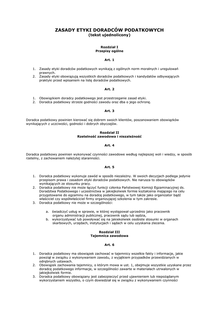 ZASADY ETYKI DORADCÓW PODATKOWYCH (tekst ujednolicony) Rozdział I Przepisy ogólne Art. 1 1. 2. Zasady etyki doradców podatkowych wynikają z ogólnych norm moralnych i uregulowań prawnych. Zasady etyki obowiązują wszystkich doradców podatkowych i kandydatów odbywających praktyki przed wpisaniem na listę doradców podatkowych. Art. 2 1. 2. Obowiązkiem doradcy podatkowego jest przestrzeganie zasad etyki. Doradca podatkowy strzeże godności zawodu oraz dba o jego ochronę. Art. 3 Doradca podatkowy powinien kierować się dobrem swoich klientów, poszanowaniem obowiązków wynikających z uczciwości, godności i dobrych obyczajów. Rozdział II Rzetelność zawodowa i niezależność Art. 4 Doradca podatkowy powinien wykonywać czynności zawodowe według najlepszej woli i wiedzy, w sposób rzetelny, z zachowaniem należytej staranności. Art. 5 1. 2. 3. Doradca podatkowy wykonuje zawód w sposób niezależny. W swoich decyzjach podlega jedynie przepisom prawa i zasadom etyki doradców podatkowych. Nie narusza to obowiązków wynikających ze stosunku pracy. Doradca podatkowy nie może łączyć funkcji członka Państwowej Komisji Egzaminacyjnej ds. Doradztwa Podatkowego i uczestnictwa w jakiejkolwiek formie kształcenia mającego na celu przygotowanie do egzaminu na doradcę podatkowego, w tym także jako organizator bądź właściciel czy współwłaściciel firmy organizującej szkolenia w tym zakresie. Doradca podatkowy nie może w szczególności: a. świadczyć usług w sprawie, w której występował uprzednio jako pracownik organu administracji publicznej, pracownik sądu lub sędzia, b. wykorzystywać lub powoływać się na jakiekolwiek osobiste stosunki w organach skarbowych, urzędach, instytucjach i sądach w celu uzyskania zlecenia. Rozdział III Tajemnica zawodowa Art. 6 1. 2. 3. Doradca podatkowy ma obowiązek zachować w tajemnicy wszelkie fakty i informacje, jakie powziął w związku z wykonywaniem zawodu, z wyjątkiem przypadków przewidzianych w odrębnych ustawach. Obowiązek zachowania tajemnicy, o którym mowa w ust. 1, obejmuje wszystkie uzyskane przez doradcę podatkowego informacje, w szczególności zawarte w materiałach utrwalonych w jakiejkolwiek formie. Doradca podatkowy obowiązany jest zabezpieczyć przed ujawnieniem lub niepożądanym wykorzystaniem wszystko, o czym dowiedział się w związku z wykonywaniem czynności 4. zawodowych. Doradca podatkowy jest zobowiązany do stosowania procedur chroniących dane w każdej postaci, w tym również elektronicznej, przed zniszczeniem, zmianą lub dostępem osób niepowołanych. Art. 7 1. 2. 3. 4. 5. Obowiązek zachowania tajemnicy zawodowej jest nieograniczony w czasie i trwa także po ustaniu stosunku prawnego, na podstawie którego doradca podatkowy wykonywał czynności zawodowe. Obowiązek zachowania tajemnicy obowiązuje również po zaprzestaniu wykonywania zawodu doradcy podatkowego albo skreśleniu z listy doradców podatkowych. Wszelkie dokumenty w postaci papierowej, elektronicznej, magnetycznej lub innej, stanowiące akta sprawy, objęte są tajemnicą zawodową. Doradca podatkowy zobowiązany jest zażądać od swoich współpracowników oraz wszystkich osób przez niego zaangażowanych w trakcie świadczenia usług zawodowych przestrzegania tajemnicy, o której mowa w art. 6 ust.1. Doradcy podatkowemu nie wolno powoływać na świadka innego doradcy podatkowego w celu ujawnienia wiadomości uzyskanych w związku z wykonywaniem zawodu w przypadku, gdy nie uzyskał uprzednio pisemnej zgody tego doradcy podatkowego. Art. 8 W przypadku przeszukania w lokalu, w którym doradca podatkowy wykonuje zawód lub w mieszkaniu prywatnym doradcy podatkowego, jest on obowiązany żądać uczestniczenia w tej czynności przedstawiciela samorządu doradców podatkowych. Rozdział IV Informacja i reklama Art. 9 1. 2. 3. 4. 5. Doradca podatkowy może informować o świadczonych przez siebie usługach. Przekazywane informacje powinny być obiektywne, rzetelne i wyważone, a także nie naruszać norm estetyki i dobrych obyczajów oraz godności zawodu. Informacjami, o których mowa w ust. 1 są w szczególności: adresy pocztowe, adresy poczty elektronicznej, numery telefonów, faksów, liczba zatrudnionych doradców, informacje o przebiegu kariery i tytułach naukowych, publikacjach, informacje o zakresie działalności doradcy lub spółki doradztwa podatkowego, w tym o planowanej działalności, organizacji lub udziale w szkoleniach lub konferencjach o tematyce podatkowej, prawnej, ekonomicznej lub rachunkowej, z wyjątkiem zakazanej reklamy. Prezentowanie informacji o doradcy podatkowym lub spółce doradztwa podatkowego, jeżeli informacja ta ma charakter wartościujący, zawiera porównania, element zachęty, nakłaniania, obiecywania lub gwarantowania skuteczności, jest zakazaną reklamą. Przy okazji wystąpień publicznych lub w publikacjach o charakterze profesjonalnym lub naukowym dozwolone jest podawanie tytułu "doradca podatkowy", informacji o karierze zawodowej lub naukowej, a także o firmach, z którymi doradca podatkowy współpracuje lub funkcji, którą pełni lub pełnił w samorządzie doradców. Doradca podatkowy lub spółka doradztwa podatkowego nie może korzystać z pośrednictwa w zakresie reklamy, jeśli służy to obejściu zakazu reklamy. Rozdział V Konflikt interesów Art. 10 1. 2. Doradca podatkowy nie podejmuje działań w sprawach, w których przypuszczalne jest wystąpienie konfliktu interesów. Konflikt interesów może występować w szczególności, gdy: a. doradca podatkowy lub jego spółka doradztwa podatkowego występuje w charakterze doradcy podatkowego dla stron tej samej transakcji mających przeciwstawne interesy, chyba że strony pisemnie zaakceptują ten stan rzeczy, b. sytuacja procesowa reprezentowanych przez doradcę podatkowego podmiotów jest tak powiązana, że sukces jednego z nich może oznaczać porażkę drugiego, chyba że strony pisemnie zaakc