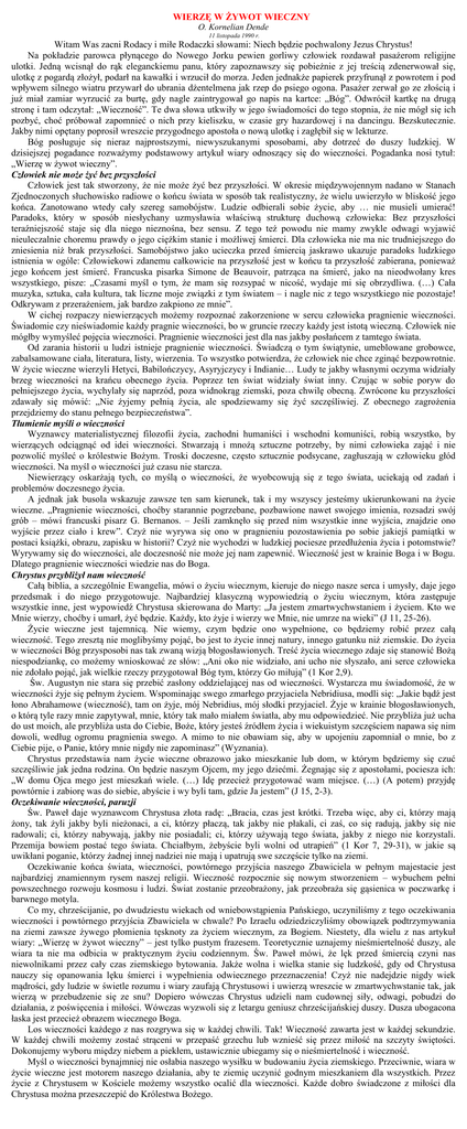 WIERZĘ W ŻYWOT WIECZNY O. Kornelian Dende 11 listopada 1990 r. Witam Was zacni Rodacy i miłe Rodaczki słowami: Niech będzie pochwalony Jezus Chrystus! Na pokładzie parowca płynącego do Nowego Jorku pewien gorliwy człowiek rozdawał pasażerom religijne ulotki. Jedną wcisnął do rąk eleganckiemu panu, który zapoznawszy się pobieżnie z jej treścią zdenerwował się, ulotkę z pogardą złożył, podarł na kawałki i wrzucił do morza. Jeden jednakże papierek przyfrunął z powrotem i pod wpływem silnego wiatru przywarł do ubrania dżentelmena jak rzep do psiego ogona. Pasażer zerwał go ze złością i już miał zamiar wyrzucić za burtę, gdy nagle zaintrygował go napis na kartce: „Bóg”. Odwrócił kartkę na drugą stronę i tam odczytał: „Wieczność”. Te dwa słowa utkwiły w jego świadomości do tego stopnia, że nie mógł się ich pozbyć, choć próbował zapomnieć o nich przy kieliszku, w czasie gry hazardowej i na dancingu. Bezskutecznie. Jakby nimi opętany poprosił wreszcie przygodnego apostoła o nową ulotkę i zagłębił się w lekturze. Bóg posługuje się nieraz najprostszymi, niewyszukanymi sposobami, aby dotrzeć do duszy ludzkiej. W dzisiejszej pogadance rozważymy podstawowy artykuł wiary odnoszący się do wieczności. Pogadanka nosi tytuł: „Wierzę w żywot wieczny”. Człowiek nie może żyć bez przyszłości Człowiek jest tak stworzony, że nie może żyć bez przyszłości. W okresie międzywojennym nadano w Stanach Zjednoczonych słuchowisko radiowe o końcu świata w sposób tak realistyczny, że wielu uwierzyło w bliskość jego końca. Zanotowano wtedy cały szereg samobójstw. Ludzie odbierali sobie życie, aby … nie musieli umierać! Paradoks, który w sposób niesłychany uzmysławia właściwą strukturę duchową człowieka: Bez przyszłości teraźniejszość staje się dla niego nieznośna, bez sensu. Z tego też powodu nie mamy zwykle odwagi wyjawić nieuleczalnie choremu prawdy o jego ciężkim stanie i możliwej śmierci. Dla człowieka nie ma nic trudniejszego do zniesienia niż brak przyszłości. Samobójstwo jako ucieczka przed śmiercią jaskrawo ukazuje paradoks ludzkiego istnienia w ogóle: Człowiekowi zdanemu całkowicie na przyszłość jest w końcu ta przyszłość zabierana, ponieważ jego końcem jest śmierć. Francuska pisarka Simone de Beauvoir, patrząca na śmierć, jako na nieodwołany kres wszystkiego, pisze: „Czasami myśl o tym, że mam się rozsypać w nicość, wydaje mi się obrzydliwa. (…) Cała muzyka, sztuka, cała kultura, tak liczne moje związki z tym światem – i nagle nic z tego wszystkiego nie pozostaje! Odkrywam z przerażeniem, jak bardzo zakpiono ze mnie”. W cichej rozpaczy niewierzących możemy rozpoznać zakorzenione w sercu człowieka pragnienie wieczności. Świadomie czy nieświadomie każdy pragnie wieczności, bo w gruncie rzeczy każdy jest istotą wieczną. Człowiek nie mógłby wymyśleć pojęcia wieczności. Pragnienie wieczności jest dla nas jakby posłańcem z tamtego świata. Od zarania historii u ludzi istnieje pragnienie wieczności. Świadczą o tym świątynie, umeblowane grobowce, zabalsamowane ciała, literatura, listy, wierzenia. To wszystko potwierdza, że człowiek nie chce zginąć bezpowrotnie. W życie wieczne wierzyli Hetyci, Babilończycy, Asyryjczycy i Indianie… Ludy te jakby własnymi oczyma widziały brzeg wieczności na krańcu obecnego życia. Poprzez ten świat widziały świat inny. Czując w sobie poryw do pełniejszego życia, wychylały się naprzód, poza widnokrąg ziemski, poza chwilę obecną. Zwrócone ku przyszłości zdawały się mówić: „Nie żyjemy pełnią życia, ale spodziewamy się żyć szczęśliwiej. Z obecnego zagrożenia przejdziemy do stanu pełnego bezpieczeństwa”. Tłumienie myśli o wieczności Wyznawcy materialistycznej filozofii życia, zachodni humaniści i wschodni komuniści, robią wszystko, by wierzących odciągnąć od idei wieczności. Stwarzają i mnożą sztuczne potrzeby, by nimi człowieka zająć i nie pozwolić myśleć o królestwie Bożym. Troski doczesne, często sztucznie podsycane, zagłuszają w człowieku głód wieczności. Na myśl o wieczności już czasu nie starcza. Niewierzący oskarżają tych, co myślą o wieczności, że wyobcowują się z tego świata, uciekają od zadań i problemów doczesnego życia. A jednak jak busola wskazuje zawsze ten sam kierunek, tak i my wszyscy jesteśmy ukierunkowani na życie wieczne. „Pragnienie wieczności, choćby starannie pogrzebane, pozbawione nawet swojego imienia, rozsadzi swój grób – mówi francuski pisarz G. Bernanos. – Jeśli zamknęło się przed nim wszystkie inne wyjścia, znajdzie ono wyjście przez ciało i krew”. Czyż nie wyrywa się ono w pragnieniu pozostawienia po sobie jakiejś pamiątki w postaci książki, obrazu, zapisku w historii? Czyż nie wychodzi w ludzkiej pociesze przedłużenia życia i potomstwie? Wyrywamy się do wieczności, ale doczesność nie może jej nam zapewnić. Wieczność jest w krainie Boga i w Bogu. Dlatego pragnienie wieczności wiedzie nas do Boga. Chrystus przybliżył nam wieczność Całą biblia, a szczególnie Ewangelia, mówi o życiu wiecznym, kieruje do niego nasze serca i umysły, daje jego przedsmak i do niego przygotowuje. Najbardziej klasyczną wypowiedzią o życiu wiecznym, która zastępuje wszystkie inne, jest wypowiedź Chrystusa skierowana do Marty: „Ja jestem zmartwychwstaniem i życiem. Kto we Mnie wierzy, choćby i umarł, żyć będzie. Każdy, kto żyje i wierzy we Mnie, nie umrze na wieki” (J 11, 25-26). Życie wieczne jest tajemnicą. Nie wiemy, czym będzie ono wypełnione, co będziemy robić przez całą wieczność. Tego zresztą nie moglibyśmy pojąć, bo jest to życie innej natury, innego gatunku niż ziemskie. Do życia w wieczności Bóg przysposobi nas tak zwaną wizją błogosławionych. Treść życia wiecznego zdaje się