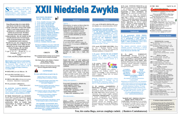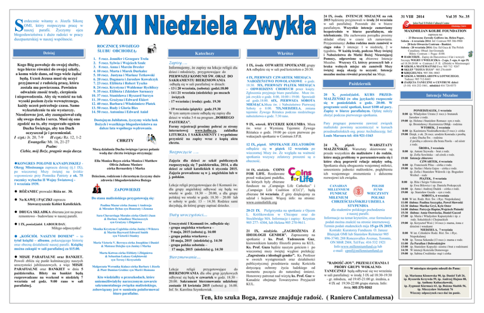 erdecznie witamy o. Józefa Sikorę OMI, który rozpoczyna pracę w naszej parafii. Życzymy ojcu błogosławieństwa i dużo radości w pracy duszpasterskiej w naszej wspólnocie. S Dzisiaj Kogo Bóg powołuje do swojej służby, tego bierze również do swojej szkoły, a komu wiele dano, od tego wiele żądać będą. Uczeń Jezusa musi się uczyć przyjmować z radością pracę, która została mu powierzona. Powinien odważnie znosić trudy, cierpienia i niepowodzenia. Aby się wznieść na tak wysoki poziom życia wewnętrznego, każdy uczeń potrzebuje czasu. Samo wykształcenie tu nie wystarczy. Nieodzowne jest, aby zaangażował całą siłę swego ducha i serca. Musi się ono zgodzić na to, aby rozgorzało ogniem Ducha Świętego, aby ten Duch oczyszczał je i przemieniał. I czyt.: Jr. 20, 7-9 II czyt.: Rz. 12, 1-2 Ewangelia: Mt. 16, 21-27 Psalm: Ciebie, mój Boże, pragnie moja dusza. KONGRES POLONII KANADYJSKIEJ Okręg Mississauga zaprasza dzisiaj (tj.1 IX), po wieczornej Mszy świętej na krótkie wspomnienie przy Pomniku Patrioty z ok. 75 rocznicy wybuchu II Wojny Światowej 1 września 1939. RÓŻANIEC prowadzi Róża nr. 30. Na KAWĘ i PĄCZKI zaprasza Stowarzyszenie Kobiet Katolickich. DRUGA SKŁADKA zbierana jest na prace remontowo - budowlane w naszej parafii. 1 IX, poniedziałek. LABOUR DAY. Miłego odpoczynku! „KOŚCIÓŁ NASZYM DOMEM” – to tytuł książki – albumu, pokazującego historię oraz obecną działalność naszej parafii. Książkę można zakupić w sali parafialnej za $15.00. MISJE PARAFIALNE oraz BANKIET. Powoli zbliża się punkt kulminacyjny naszych uroczystości jubileuszowych, a więc MISJE PARAFIALNE oraz BANKIET w dniu 5 października. Bilety na bankiet będą rozprowadzane na weekend w niedzielę 7 września od godz. 9:00 rano w sali parafialnej. ROCZNICĘ SWOJEGO ŚLUBU OBCHODZĄ: 1. 5 rocz. Jennifer i Grzegorz Trela 2. 5 rocz. Sylwia i Wojciech Szulc 3. 8 rocz. Anna i Marcin Dresler 4. 10 rocz. Marta i Marek Durkalec 5. 10 rocz. Justyna i Mariusz Tetkowski 6. 20 rocz. Dagmara i Jarosław Kowalczyk 7. 23 rocz. Elżbieta i Robert Tyszko 8. 24 rocz. Krystyna i Waldemar Rychliccy 9. 35 rocz. Elżbieta i Zdzisław Sarnaccy 10. 37 rocz. Stanisława i Ryszard Surzyn 11. 39 rocz. Grażyna i Edward Ekiert 12. 40 rocz. Barbara i Włodzimierz Płatek 13. 50 rocz. Rudy i Gloria Bies 14. 50 rocz. Antonina i Edward Anioł Dostojnym Jubilatom, życzymy wielu łask Bożych i wszelkiego błogosławieństwa na dalsze lata wspólnego wędrowania. CHRZTY Mocą działania Ducha świętego i przez polanie wodą dar chrztu świętego otrzymają: Ella Monica Boyes córka Monica i Matthew Olivia Juliana Masiarz córka Bernardety i Marka Dzieciom, rodzicom i chrzestnym życzymy dużo zdrowia i błogosławieństwa Bożego ZAPOWIEDZI Do stanu małżeńskiego przygotowują się: Paulina Mazur córka Joanny i Andrzeja & Mirosław Dybas syn Honoraty i Zenona Sara Chavarriaga Morales córka Glorii i Juan & Dariusz Arkadiusz Maciaszczyk syn Grażyny i Zbigniewa Monika Krystyna Cegielska córka Janiny i Wiktora & Martin Hayward Edward Smith syn Victorii i Stanley Maria Victoria V. Berroya córka Josephine i Daniel & Mateusz Dziejko syn Janiny i Marka Marta Kotwas córka Elżbiety i Zbigniewa & Sebastian Łukasz Gołębiowski syn Teresy i Krzysztofa Małgorzata Weronika Kulacz córka Barbary i Józefa & Piotr Damian Grabiec syn Marii i Romana Kto wiedziałby o przeszkodach, które uniemożliwiałyby narzeczonym zawarcie sakramentalnego związku małżeńskiego, zobowiązany jest w sumieniu poinformować biuro parafialne. Katechezy Zapisy….. Informujemy, że zapisy na lekcje religii dla dzieci i młodzieży, przygotowujące do PIERWSZEJ KOMUNII ŚW. ORAZ DO SAKRAMENTU BIERZMOWANIA odbędą się w sali parafialnej w dniach: - 13 i 20 września, (sobota): godzi.18.00 - 14 i 21 września (niedziela): po mszach świętych - 17 września ( środa): godz. 19.30 - 19 września (piątek): godz.19.30 W tym samym czasie odbędą się zapisy dla dzieci w wieku 3-6 na program „DOBREGO PASTERZA”. Formy rejestracji prosimy pobrać ze strony internetowej www.kolbe.ca, zakładka LITURGIA I SAKRAMENTY i wypełnione przynieść na zapisy wraz z kopią aktu chrztu. Rozpoczęcie ….. Zajęcia dla dzieci ze szkół publicznych rozpoczynają się 7 października, 2014, a dla dzieci ze szkół katolickich 6 stycznia 2015. Zajęcia prowadzone są w j. angielskim lub w j. polskim. Lekcje religii przygotowujące do I Komunii św. dla grupy angielskiej odbywać się będą we wtorki w godz. 18.30 – 20.00, a dla grupy polskiej we wtorki w godz. 18.30 – 20.00 lub w soboty w godz. 13 – 14.30. Rodzice sami decydują, do której grupy zapisać dziecko. Daty uroczystości.... Uroczystość I Komunii św. odbędzie się: - grupa angielska wtorkowa – 9 maja, 2015 (sobota) g. 16:00 - grupa polska wtorkowa – 10 maja, 2015 (niedziela) g. 14:30 - grupa polska sobotnia – 17 maja, 2015 (niedziela) g. 14:30 Bierzmowanie.... Lekcje religii przygotowujące do BIERZMOWANIA dla obu grup językowych odbywać się będą w czwartek w godz. 18.30 – 20.00. Sakrament bierzmowania udzielony zostanie 18 kwietnia 2015 (sobota) g. 16.00. Inf. Sr. Karolina Szymkowiak. Wkrótce 1 IX, środa. OTWARTE SPOTKANIE grupy AA odbędzie się w sali pod kościołem o 20:30. 4 IX, PIERWSZY CZWARTEK MIESIĄCA NABOŻEŃSTWO POWOŁANIOWE o godz. 18:30. 5IX, PIERWSZY PIĄTEK MIESIĄCA – ODWIEDZINY CHORYCH przez księży. Zgłoszenia przyjmuje biuro parafialne. Msze św. jak zwykle o godz. 8:00, 10:00 i 19:00. Spowiedź od godz.18:00. 6IX, PIERWSZA SOBOTA MIESIĄCA.Msza św. i Nabożeństwo Pierwszej Soboty o 8:00. 7IX,NIEDZIELA, zmiana tajemnic Żywego Różańca podczas niedzielnego nabożeństwa o godz. 7:30 rano. 24 IX, środa. INTENCJE MSZALNE na rok 2015 będziemy przyjmowali w środę 24 września w sali parafialnej. Pozostałe dni w biurze parafialnym. Wszystkie intencje zamawiamy bezpośrednio w biurze parafi