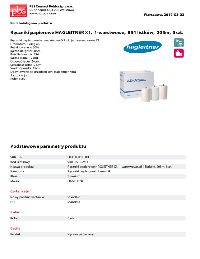PBS Connect Polska Sp. z o.o. ul. Annopol 3, 03-236 Warszawa www.pbspolska.eu Warszawa, 2017-03-03 Karta katalogowa produktu: Ręczniki papierowe HAGLEITNER X1, 1-warstwowe, 854 listków, 205m, 5szt. Ręczniki papierowe dwuwarstwowe X2 lub jednowarstwowe X1 Gramatura: 1x40gsm Recyklowane w 60% łączna długość: 205m Ilość listków: ok. 854 łączna waga: 1750g Długość listka: 24cm Szerokość listka: 21cm Średnica wałka: 18cm Dedykowane do urządzeń serii Hagleitner Xibu 5 sztuk w j.s. Kolor biały Podstawowe parametry produktu SKU PBS H411090110000 Kod kreskowy 900835305981 Nazwa produktu Ręczniki papierowe HAGLEITNER X1, 1-warstwowe, 854 listków, 205m, 5szt. Kategoria Ręczniki papierowe i dozowniki Klasa Premium Marka HAGLEITNER Certyfikaty Nowy produkt w ofercie Standard Hit Standard Kolor Kolor Biały Cecha Produkt Ręcznik papierowy PBS Connect Polska Sp. z o.o. ul. Annopol 3, 03-236 Warszawa www.pbspolska.eu Warszawa, 2017-03-03 Karta katalogowa produktu cd. Ręczniki papierowe HAGLEITNER X1, 1-warstwowe, 854 listków, 205m, 5szt. Podstawowe parametry produktu Typ 1-warstwowy Rodzaj XIBU Towel Materiał B.d. W ofercie od 2014-04 Wymiary Gramatura (g/m2) 40 Rozmiar 1warstwowy Wymiary (mm) 210x240 Wspólny słownik zamówień CPV 33763000-6 Jednostki logistyczne Opakowanie 1 40 szt