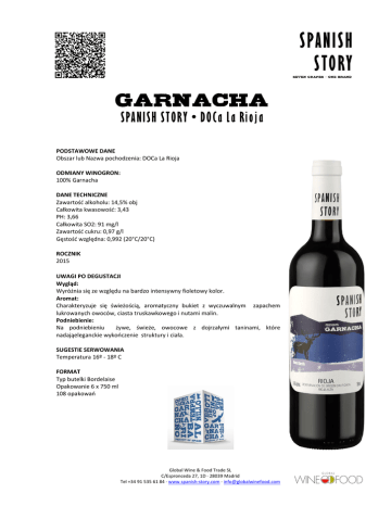 SPANISH STORY • DOCa La Rioja PODSTAWOWE DANE Obszar lub Nazwa pochodzenia: DOCa La Rioja ODMIANY WINOGRON: 100% Garnacha DANE TECHNICZNE Zawartość alkoholu: 14,5% obj Całkowita kwasowość: 3,43 PH: 3,66 Całkowita SO2: 91 mg/l Zawartość cukru: 0,97 g/l Gęstość względna: 0,992 (20°C/20°C) ROCZNIK 2015 UWAGI PO DEGUSTACJI Wygląd: Wyróżnia się ze względu na bardzo intensywny fioletowy kolor. Aromat: Charakteryzuje się świeżością, aromatyczny bukiet z wyczuwalnym zapachem lukrowanych owoców, ciasta truskawkowego i nutami malin. Podniebienie: Na podniebieniu żywe, świeże, owocowe z dojrzałymi taninami, które nadająeleganckie wykończenie struktury i ciała. SUGESTIE SERWOWANIA Temperatura 16º - 18º C FORMAT Typ butelki Bordelaise Opakowanie 6 x 750 ml 108 opakowań Global Wine & Food Trade SL C/Espronceda 27, 1D · 28039 Madrid Tel +34 91 535 61 84 · www.spanish-story.com · [email protected] NAGRODY - Gold Medal San Francisco Wine Label Competition 2015 Vintage 2013 - 86 points Guía Peñin 2016 - Silver Medal Catavinum 2016 - Silver Medal Sakura Awards, Japan 2016 - Silver Medal ·89 points· San Diego International Wine Competition 2015 Vintage 2012 - 86 points Peñín Guide 2014 5 stars Peñín Guide 2014 - Commended on the International Wine Challenge 2015 Global Wine & Food Trade SL C/Espronceda 27, 1D · 28039 Madrid Tel +34 91 535 61 84 · www.spanish-story.com · [email protected]