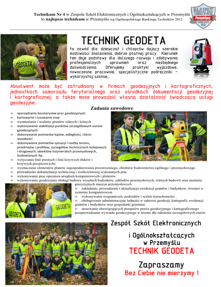 Technikum Nr 4 w Zespole Szkół Elektronicznych i Ogólnokształcących Ogólnokształcących w Przemyślu Przemy to najlepsze technikum w Przemyślu wg Ogólnopolskiego Rankingu Techników 2012 201 TECHNIK GEODETA to zawód dla dziewcząt i chłopców dający szerokie możliwości znalezienia dobrze płatnej pracy. Kierunek ten daje podstawy dla dalszego rozwoju i zdobywania profesjonalnych uprawnień oraz niezbędnego doświadczenia. Oferujemy praktyki wyjazdowe, nowoczesne pracownie, specjalistyczne podręczniki wykorzystaj szansę... Absolwent może być zatrudniony w firmach geodezyjnych i kartograficznych, kartogr jednostkach samorządu terytorialnego oraz ośrodkach dokumentacji geodezyjnej i kartograficznej, a także może prowadzić własną działalność świadczącą usługi geodezyjne. Zadania zawodowe • • • • • • • • • • • sporządzanie kosztorysów prac geodezyjnych kartowanie i rysowanie map wymienianie i scalanie gruntów rolnych i leśnych leś wykonywanie stabilizacji punktów szczegółowych osnów geodezyjnych dokonywanie pomiarów kątów, odległości, różnic wysokości dokonywanie pomiarów sytuacji i rzeźby terenu, przekrojów ojów i profilów, szczegółów technicznych kolejowych i drogowych, obiektów inżynierskich przemysłowych, budowlanych itp. wytyczanie linii prostych i linii krzywych (łuków i krzywych przejściowych) wyznaczanie elementów planów zagospodarowania przestrzennego, przestrzennego, obiektów budownictwa ogólnego i przemysłowego prowadzenie dokumentacji technicznej i rozliczeniowej wykonanych prac wykonywanie prac operatora urządzeń ą ń komputerowych i ploterów wykonywanie geodezyjnej obsługi budowy wysokich budynków, zakładów przemysłowych, różnych ró róż budowli oraz montażu precyzyjnych maszyn przemysłowych • zakładanie, prowadzenie i aktualizacja ewidencji gruntów i budynków, również równie w systemie komputerowym • wykonywanie rozgraniczeń, podziałów i scaleńń nieruchomości nieruchomo • obsługiwanie administracyjne ludności ci w zakresie geodezji, kartografii, ewidencji gruntów i budynków oraz gospodarki gruntami • stosowanie obowiązujących cych przepisów prawa geodezyjnego i kartograficznego przeprowadzanie zeprowadzanie wywiadu geodezyjnego w terenie dla dla założenia założ szczegółowych osnów Zespół Szkół Elektronicznych i Ogólnokształcących w Przemyślu TECHNIK GEODETA Zapraszamy Bez Ciebie nie mierzymy !