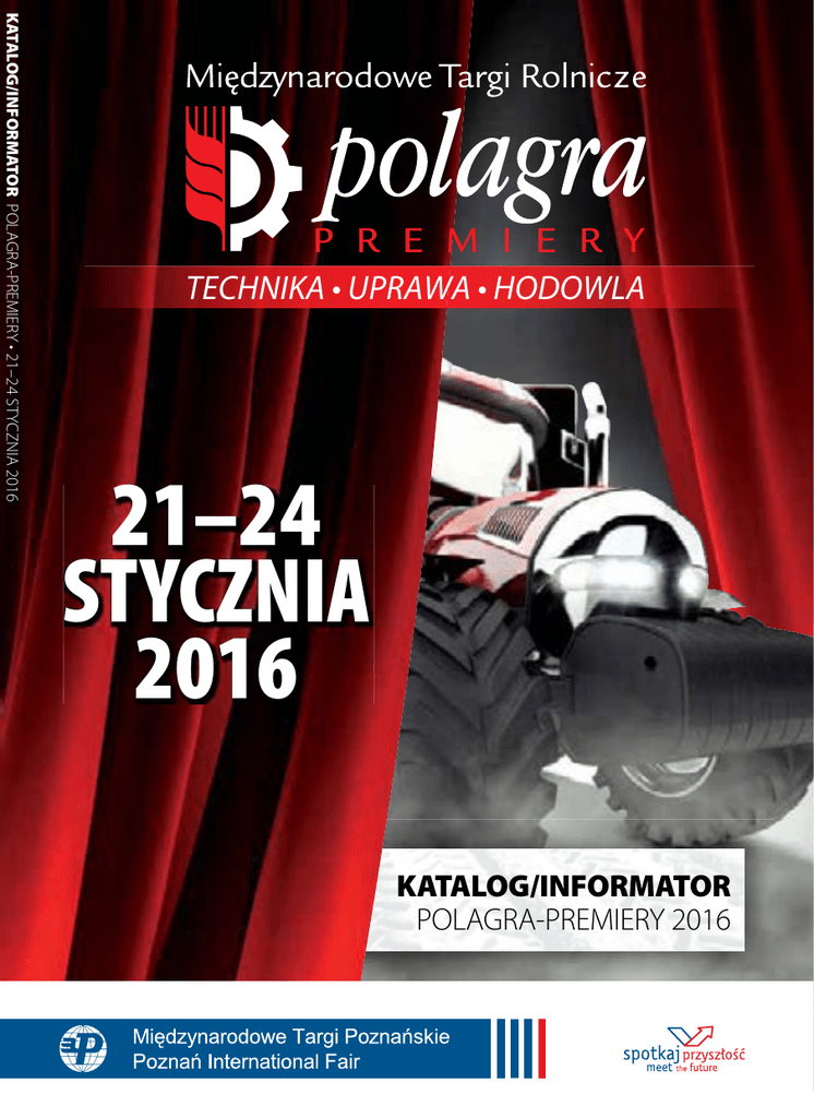 KATALOG/INFORMATOR POLAGRA-PREMIERY • 21–24 STYCZNIA 2016 TECHNIKA • UPRAWA • HODOWLA 21–24 STYCZNIA 2016 KATALOG/INFORMATOR POLAGRA-PREMIERY 2016 1-3 WRZEŚNIA 2016 JANÓW LUBELSKI TARGI GOSPODARKI LEŚNEJ, PRZEMYSŁU DRZEWNEGO I OCHRONY ŚRODOWISKA NOWA LOKALIZACJA! JANÓW NÓW LUBELSKI ELSKI NAJWIĘKSZE SPOTKANIE BRANŻY LEŚNEJ W EUROPIE ŚRODKOWO-WSCHODNIEJ www.ekolas.mtp.pl Partner strategiczny Organizator Krzysztof Jurgiel Minister Rolnictwa i Rozwoju Wsi Szanowni Państwo! Styczniowe Międzynarodowe Targi Rolnicze POLAGRA-PREMIERY otwierają sezon targów rolnych. Pora zimowa to dobry czas na zaprezentowanie nowości w dziedzinie techniki, uprawy i hodowli. Zainteresowani rolnicy, niezależnie od wielkości swoich gospodarstw, znajdą tutaj najlepsze rozwiązania pomagające efektywnie prowadzić produkcję. Współczesne gospodarstwa rolne wymagają nie tylko rzetelnej i fachowej wiedzy, ale także znajomości najnowszej techniki oraz technologii. Obecna perspektywa finansowa lat 2014–2020 ukierunkowana jest na innowacyjność, a co za tym idzie – ściślejsza musi być współpraca w zakresie nowych rozwiązań i przenoszenia zdobyczy współczesnej wiedzy do praktyki. Wyjściem naprzeciw tym oczekiwaniom jest cały szereg wydarzeń towarzyszących – seminariów, wykładów, konferencji, pokazów. Doświadczenia lat ubiegłych pokazują, że taka formuła się sprawdza, co widać po liczbie rolników odwiedzających tereny targowe. Jestem przekonany, że odpowiednie powiązanie nauki, techniki, wiedzy i rozwiązań systemowych pozwoli na zrealizowanie głównego celu wprowadzanych zmian, czyli podniesienie poziomu życia na terenach wiejskich tak, aby stały się one atrakcyjnym miejscem do pracy, zamieszkania i wypoczynku. Różnorodne funkcje, jakie powinny pełnić te obszary, mogą być zrealizowane przy kompleksowym podejściu łączącym środki w ramach funduszy pochodzących z mechanizmów Wspólnej Polityki Rolnej, funduszy spójności i wsparcia krajowego. Międzynarodowe Targi Rolnicze POLAGRA-PREMIERY oprócz podstawowego celu zaprezentowania nowości w dziedzinie techniki, uprawy i hodowli są także doskonałą okazją do spotkań biznesowych, wymiany doświadczeń i pomysłów na dalszy rozwój polskiego rolnictwa. Życzę Państwu, aby czas pobytu na Międzynarodowych Targach Rolniczych POLAGRA-PREMIERY był czasem mile i pożytecznie spędzonym. 3 TECHNIKA • UPRAWA • HODOWLA 3 Słowa wstępu 6 POLAGRA-PREMIERY w obiektywie mediów 8 Informacje dla zwiedzających 10 Partnerzy współpracujący 12 Czego szuka rolnik? 14 Skrócony program wydarzeń 18 Co z rynkiem ciągników w Polsce? 20 Złote Medale 2016 32 Nowości produktowe Polagra-Premiery 2016 52 Alfabetyczny spis wystawców 68 Plany pawilonów i lokalizacje 82 Co warto zobaczyć? 84 Katalog wystawców Tomasz Kobierski Wiceprezes Międzynarodowych Targów Poznańskich Polska w nowej perspektywie finansowej na lata 2014–2020 otrzyma łącznie z budżetu Unii Europejskiej co najmniej 114,6 mld euro. Środki bezpośrednio skierowane dla rolnictwa i wsi stanowić będą aż 28% ogółu budżetu. Otrzymane dotychczas fundusze umożliwiły dynamiczny rozwój polskiego rolnictwa. Zwiększeniu uległa nie tylko wydajność systemów produkcyjnych w gospodarstwach rolnych, ale i efektywność pracy. Perspektywa dalszych dotacji motywuje rolników do poszukiwania coraz to nowszych rozwiązań z zakresu techniki rolniczej. Odpowiedzią na ich potrzeby są Targi POLAGRA-PREMIERY. Europejskim centrum innowacji i prekursorskich rozwiązań w nowoczesnym zarządzaniu gospodarstwem po raz kolejny staną się Międzynarodowe Targi Rolnicze POLAGRA-PREMIERY, które nie bez powodu odbywają się zaledwie 3 miesiące po największych światowych targach techniki rolniczej – AGRITECHNICE w Hanowerze. Termin jest idealny, by zaprezentować nowatorskie pomysły na 2016, które pierwszy raz na polskim rynku ujrzą światło dzienne właśnie w Poznaniu. Stolica Wielkopolski stanie się więc mekką technologicznych nowinek prezentowanych tuż przed rozpoczęciem sezonu prac polowych. Szósta odsłona Targów POLAGRA-PREMIERY zaskoczy licznymi nowościami w postaci innowacyjnych maszyn i funkcjonalnych PATRONAT HONOROWY GŁÓWNY PATRON TELEWIZYJNY PARTNER GŁÓWNY PATRON RADIOWY narzędzi rolniczych. W pierwszej kolejności zobaczyć należy produkty nagrodzone Złotym Medalem Międzynarodowych Targów Poznańskich. Aż 38 najnowszych propozycji otrzymało to prestiżowe wyróżnienie, które potwierdza ich unikatowość, najwyższą klasę i znakomitą jakość. Nowością dla przedstawicieli branży rolniczej będą dwie niespotykane dotąd strefy – Serwisu Rolniczego oraz Precyzyjnego Rolnictwa. Pierwsza z nich umożliwi zapoznanie się z najnowocześniejszymi maszynami, narzędziami, materiałami eksploatacyjnymi, akcesoriami i produktami służącymi jako wyposażenie punktów serwisowych. Strefa Serwisu Rolniczego to także okazja do uzyskania porad w zakresie elektromechaniki czy diagnostyki. Strefie Precyzyjnego Rolnictwa przyświeca idea prezentacji rozwiązań z zakresu nowych technologii – specjalistycznego oprogramowania, innowacyjnych akcesoriów czy nowoczesnych rozwiązań informatycznych, które uczynią pracę w gospodarstwie wydajniejszą. W imieniu Partnerów, Wystawców i Patronów serdecznie zapraszam do udziału w uroczystym otwarciu sezonu spotkań dla rolników. Targi POLAGRA-PREMIERY to najlepszy sposób, aby przygotować się do zbliżającego się sezonu i porównać produkty pod względem innowacyjności, a także konkurencyjności na rynku. PARTNER MERYTORYCZNY GŁÓWNY PATRON MEDIALNY GŁÓWNY PATRON INTERNETOWY 5 PREMIERY OCZAMI MEDIÓW POLAGRA-PREMIERY w obiektywie mediów Bogactwo oferty maszyn i ciągników rolniczych, trendy, inspiracje na nadchodzący sezon 2016, seminaria i konferencje na poziomie eksperckim, czas dla biznesmena, młodego ucznia, rolników z rodzinam
