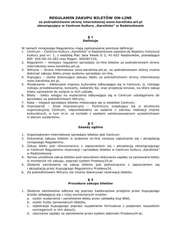 REGULAMIN ZAKUPU BILETÓW ON-LINE za pośrednictwem strony internetowej www.karolinka.art.pl obowiązujący w Centrum Kultury „Karolinka” w Radzionkowie §1 Definicje W ramach niniejszego Regulaminu mają zastosowanie poniższe definicje: 1. Centrum – Centrum Kultury „Karolinka” w Radzionkowie wpisane do Rejestru Instytucji Kultury pod nr: 1, z siedzibą Plac Jana Pawła II 2, 41-922 Radzionków, posiadające NIP: 626-00-10-263 oraz Regon: 000287125, 2. Regulamin – niniejszy regulamin sprzedaży on-line biletów za pośrednictwem strony internetowej www.karolinka.art.pl, 3. Witryna – strona internetowa www.karolinka.art.pl, za pośrednictwem której można dokonać zakupu biletu przez systemu sprzedaży on-line, 4. Kupujący – osoba dokonująca zakupu biletu za pośrednictwem strony internetowej www.karolinka.art.pl, 5. Wydarzenie – biletowane imprezy kulturalne odbywające się w Centrum, tj. różnego rodzaju przedstawienia, koncerty, kabarety itp. oraz projekcje kinowe, na które zakup biletu upoważnia do wzięcia w nich udziału. 6. Bilety - bilety wstępu na wydarzenia odbywające się w Centrum udostępnione do sprzedaży za pośrednictwem Witryny, 7. Kasa – miejsce sprzedaży biletów mieszczące się w siedzibie Centrum, 8. Impresariat – Dział Impresaryjno – Techniczny znajdujący się w strukturze organizacyjnej Centrum, odpowiedzialny za zadania z zakresu realizacji imprez kulturalnych, w tym m.in. za kontakt z osobami zainteresowanymi uczestnictwem w danym wydarzeniu. §2 Zasady ogólne 1. Organizatorem internetowej sprzedaży biletów jest Centrum. 2. Dokonanie zakupu biletów w systemie on-line oznacza zapoznanie się i akceptację niniejszego Regulaminu. 3. Zakup biletu jest równoznaczny z zapoznaniem się i akceptacją obowiązującego w Centrum Regulaminu rezerwacji i sprzedaży biletów w Centrum Kultury „Karolinka” w Radzionkowie. 4. Serwis umożliwia zakup biletów pod warunkiem dokonania zapłaty za zamawiane bilety w momencie ich zakupu, poprzez system Przelewy24.pl. 5. Złożenie zamówienia na zakup biletów jest jednoznaczne z zapoznaniem się i akceptacją przez Kupującego Regulaminu Przelewy24. 6. Za pośrednictwem Witryny nie można dokonywać rezerwacji biletów. §3 Procedura zakupu biletów 1. Złożenie zamówienia odbywa się poprzez każdorazowe przejście przez Kupującego ścieżki składającej się z niżej wymienionych kroków: a. wybór wydarzenia i zamówienie biletu przez zakładkę Kup Bilet, b. wybór liczby zamawianych biletów, c. rejestracja Kupującego poprzez wypełnienie formularza z podaniem wszystkich wymaganych w nim danych, d. uiszczenie zapłaty za zamówienie przez system płatności Przelewy24.pl, 2. 3. 4. 5. 6. 7. 8. e. otrzymanie przez Kupującego potwierdzenia realizacji transakcji na wskazany przez niego adres email. W przypadku zadeklarowania chęci otrzymania faktury VAT, Kupujący zobowiązany jest podczas zamawiania zaznaczyć opcję faktura i podać wszystkie poprawne dane, niezbędne do jej wystawienia. Fakturę, o której mowa w ust. 2 można odebrać osobiście w Impresariacie Centrum po uprzednim: a. wskazaniu numeru zamówienia, który Kupujący otrzymał drogą elektroniczną w momencie dokonania zakupu przez Witrynę, b. przedstawienia dokumentu potwierdzającego tożsamość Kupującego lub osoby wskazanej przez Kupującego do odebrania faktury. Centrum zastrzega sobie możliwość zakończenia sprzedaży w każdej chwili bez podania przyczyn, a także ustalania innego terminu zakończenia sprzedaży online i/lub wprowadzenie sprzedaży biletów na daną imprezę tylko w kasie. Sprzedaż biletów poprzez Witrynę kończy się 3 godziny przed godziną rozpoczęcia wydarzenia. Brak możliwości zakupu biletów za pośrednictwem Witryny nie oznacza braku biletów w kasie Centrum. Za pośrednictwem Witryny można jednorazowo kupić do 10-ciu biletów na jedno wydarzenie. W celu zakupienia: a. biletu po zamknięciu sprzedaży przez Witrynę b. większej ilości biletów, niż została określona w ust. 7, prosimy o kontakt telefoniczny z Impresariatem lub z kasą Centrum. §4 Płatność i dostawa 1. Płatności za bilety obsługiwane są przez PayPro S.A., z siedzibą w Poznaniu za pośrednictwem serwisu Przelewy24.pl. 2. Bilety pozostają własnością Centrum do momentu odnotowania przez Centrum potwierdzenia dokonania zapłaty przez bank Kupującego. 3. Zamówienie nieopłacone w ciągu czasu podanego na etapie przyjmowania zlecenia, zostaje automatycznie anulowane. Prosimy o sprawdzenie prawidłowości przeprowadzonej transakcji. 4. Zapłata za zamówienie niepotwierdzona przez bank Kupującego w ciągu 2 godzin od momentu zamówienia, powoduje automatyczne anulowania zamówienia. 5. Brak bankowego potwierdzenia, o którym mowa w ust. 4 powoduje, iż pieniądze pobrane przez operatora płatności mogą być wykorzystane przy kolejnym zakupie lub zwrócone na konto bankowe Kupującego. O sposobie postępowania w takiej sytuacji Kupujący zostanie poinformowany mailowo przez operatora płatności firmę PayPro S.A. 6. Podane ceny biletów zawierają podatek VAT. 7. Do ceny biletu doliczana jest opłata manipulacyjna serwisu Przelewy24.pl. 8. Osoby dokonujące płatności za pośrednictwem banku zagranicznego powinny uwzględnić koszty pośrednictwa bankowego, ponieważ tylko pełna zapłata w wyznaczonym terminie gwarantuje realizacje zamówienia przez Centrum. 9. Udostępnienie biletów Kupującemu następuje po potwierdzeniu przyjęcia płatności poprzez wysłanie na podany przez Kupującego adres poczty elektronicznej załącznika z biletem elektronicznym do samodzielnego wydruku lub zapisania go na telefonie komórkowym lub innym urządzeniu z możliwością odczytania wszystkich danych zawartych na bilecie. 10. Kupujący – w razie wybrania odpowiedniej opcji – może odebrać bilety w kasie Centrum. 11. Odbiór biletu, o którym mowa w ust. 10 następuje na podstawie numeru za
