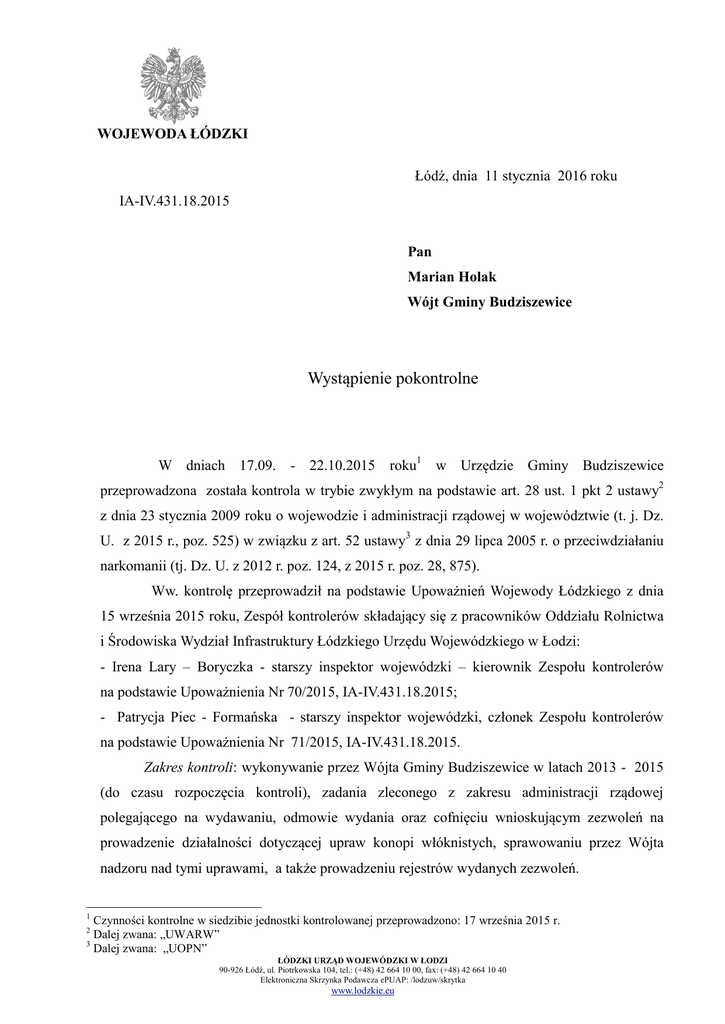 WOJEWODA ŁÓDZKI Łódź, dnia 11 stycznia 2016 roku IA-IV.431.18.2015 Pan Marian Holak Wójt Gminy Budziszewice Wystąpienie pokontrolne W dniach 17.09. - 22.10.2015 roku1 w Urzędzie Gminy Budziszewice przeprowadzona została kontrola w trybie zwykłym na podstawie art. 28 ust. 1 pkt 2 ustawy2 z dnia 23 stycznia 2009 roku o wojewodzie i administracji rządowej w województwie (t. j. Dz. U. z 2015 r., poz. 525) w związku z art. 52 ustawy3 z dnia 29 lipca 2005 r. o przeciwdziałaniu narkomanii (tj. Dz. U. z 2012 r. poz. 124, z 2015 r. poz. 28, 875). Ww. kontrolę przeprowadził na podstawie Upoważnień Wojewody Łódzkiego z dnia 15 września 2015 roku, Zespół kontrolerów składający się z pracowników Oddziału Rolnictwa i Środowiska Wydział Infrastruktury Łódzkiego Urzędu Wojewódzkiego w Łodzi: - Irena Lary – Boryczka - starszy inspektor wojewódzki – kierownik Zespołu kontrolerów na podstawie Upoważnienia Nr 70/2015, IA-IV.431.18.2015; - Patrycja Piec - Formańska - starszy inspektor wojewódzki, członek Zespołu kontrolerów na podstawie Upoważnienia Nr 71/2015, IA-IV.431.18.2015. Zakres kontroli: wykonywanie przez Wójta Gminy Budziszewice w latach 2013 - 2015 (do czasu rozpoczęcia kontroli), zadania zleconego z zakresu administracji rządowej polegającego na wydawaniu, odmowie wydania oraz cofnięciu wnioskującym zezwoleń na prowadzenie działalności dotyczącej upraw konopi włóknistych, sprawowaniu przez Wójta nadzoru nad tymi uprawami, a także prowadzeniu rejestrów wydanych zezwoleń. 1 Czynności kontrolne w siedzibie jednostki kontrolowanej przeprowadzono: 17 września 2015 r. Dalej zwana: „UWARW” 3 Dalej zwana: „UOPN” 2 ŁÓDZKI URZĄD WOJEWÓDZKI W ŁODZI 90-926 Łódź, ul. Piotrkowska 104, tel.: (+48) 42 664 10 00, fax: (+48) 42 664 10 40 Elektroniczna Skrzynka Podawcza ePUAP: /lodzuw/skrytka www.lodzkie.eu W okresie objętym kontrolą Kierownikiem Jednostki kontrolowanej jest Pan Marian Holak, który na stanowisko Wójta Gminy Budziszewice został wybrany w wyborach 4, które odbyły się dnia 21 listopada 2010 roku a także, w wyborach 5, które odbyły się dnia 16 listopada 2014 roku. Sekretarzem Gminy Budziszewice jest Pani Alicja Jarecka, która na stanowisko Sekretarza Gminy została powołana6 Uchwałą Nr II(10)92 Rady Gminy w Budziszewicach z dnia 12 marca 1992 r. w sprawie powołania Sekretarza Gminy. Następnie w związku z wejściem w życie ustawy z dnia 21 listopada 2008 roku o pracownikach samorządowych (Dz. U z 2008 r. nr 223 poz. 1458) pismem7 Wójta Gminy z dnia 5 stycznia 2009 r. dotychczasowy stosunek pracy tj. zatrudnienie na podstawie powołania został przekształcony w stosunek pracy na podstawie umowy o pracę na czas nieokreślony. Zadania przewidziane do kontroli z ww. zakresu prowadzone są w Urzędzie Gminy w Budziszewicach zgodnie z Regulaminem Organizacyjnym Urzędu Gminy w Budziszewicach (nadanym Zarządzeniem Nr 3/2011 Wójta Gminy Budziszewice z dnia 25 stycznia 2011 r.,) na stanowisku ds. Rozwoju gospodarczego i ochrony środowiska. Nad wykonaniem zadań objętych kontrolą sprawuje bezpośredni nadzór8 Sekretarz Gminy - Pani Alicja Jarecka Poza powszechnie obowiązującymi przepisami prawa, związanymi z udzielaniem zezwoleń przez Wójta Gminy Budziszewice na prowadzenie przez wnioskujących działalności w ww. zakresie, znaczenie mają również przepisy prawa miejscowego: Sejmik Województwa Łódzkiego podjął w tym zakresie: * Uchwałę9 Nr VIII/92/15 Sejmiku Województwa Łódzkiego z dnia 31 marca 2015 r. w sprawie określenia ogólnej powierzchni przeznaczonej pod uprawy maku i konopi włóknistych oraz rejonizacji tych upraw w 2015 roku na terenie województwa łódzkiego. Okres objęty kontrolą: lata 2013 - 2015 rok ( do czasu rozpoczęcia kontroli). Na podstawie niżej opisanych ustaleń, wykonanie przez Wójta Gminy Budziszewice zadania zleconego z zakresu administracji rządowej polegającego na wydawaniu, odmowie wydania oraz cofnięciu wnioskującym zezwolenia na prowadzenie działalności dotyczącej 4 [Dowód – akta kontroli, str. 11] – Zaświadczenie o wyborach Gminnej Komisji Wyborczej w Budziszewicach; [Dowód – akta kontroli, str. 12] – jw.; 6 [Dowód – akta kontroli, str. 13]; 7 [Dowód – akta kontroli, str. 14]; 8 zgodnie z Regulaminem Organizacyjnym Urzędu Gminy w Budziszewicach nadanym Zarządzeniem Nr 3/2011 Wójta Gminy Budziszewice z dnia 25 stycznia 2011 r.. 9 [Dowód – akta kontroli, str. 18 - 19]; 5 2 upraw konopi włóknistych, sprawowaniu przez Wójta nadzoru nad tymi uprawami, a także prowadzeniu rejestrów wydanych zezwoleń, ocenia się pozytywnie z nieprawidłowościami: Ustalenia kontroli: A. Kontrola wydanych zezwoleń w zakresie prowadzenia upraw konopi włóknistych. Z dokumentów przedstawionych kontrolującym wynika, że: 1. do Wójta Gminy Budziszewice w dniu 27.04.2015 roku wpłynął wniosek10 o wydanie zezwolenia na prowadzenie działalności w zakresie prowadzenia upraw konopi włóknistych od wnioskodawcy – (….), 2. Wniosek zawiera wymogi określone art. 47 ust 2 pkt 1- 3 i 5 UOPN, 3. Wójt Gminy Budziszewice na ww. wniosek wydał zezwolenie - Decyzję11 z dnia 4 maja 2015 roku, znak RG.6180.1.2016.ZR, która zawiera elementy określone art. 47 ust 3 pkt 1 – 7 UOPN. 4. Decyzja (zezwolenie) wydana przez Wójta Gminy Budziszewice w dniu 4 maja 2015 roku, znak RG.6180.1.2016.ZR, zawiera elementy o których mowa w art. 107 § 1 ustawy12 z dnia 14. 06. 1960 roku – Kodeks postępowania administracyjnego (tj. Dz. U. z 2013 r., poz. 267, z 2014 poz. 183, 1195, z 2015 poz. 211, poz. 702 i 1274); 5. W postępowaniu administracyjnym przy wydawaniu ww. Decyzji zostały też spełnione wymagania k.p.a. w zakresie: a) dochowania terminowości załatwienia spraw administracyjnych, b) przestrzegania zasady szybkości postępowania - nie miała miejsca przewlekłość postępowania; 6. Zgodnie z art. 1 ust 1 pkt 1) lit. c) ustawy z dnia