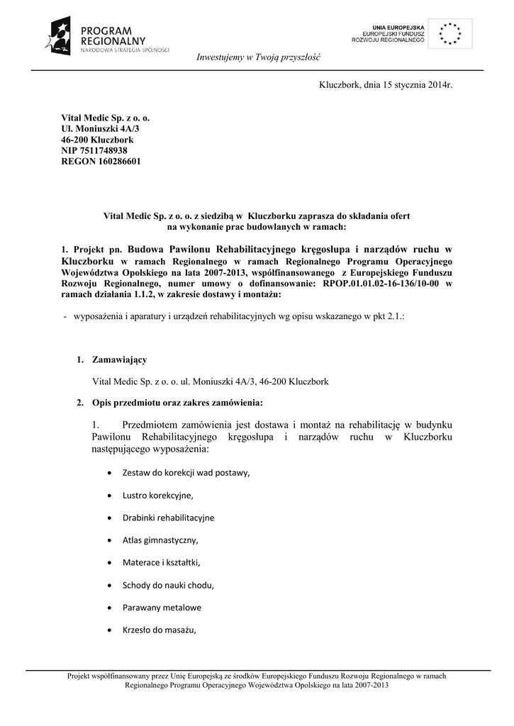 Inwestujemy w Twoją przyszłość Kluczbork, dnia 15 stycznia 2014r. Vital Medic Sp. z o. o. Ul. Moniuszki 4A/3 46-200 Kluczbork NIP 7511748938 REGON 160286601 Vital Medic Sp. z o. o. z siedzibą w Kluczborku zaprasza do składania ofert na wykonanie prac budowlanych w ramach: 1. Projekt pn. Budowa Pawilonu Rehabilitacyjnego kręgosłupa i narządów ruchu w Kluczborku w ramach Regionalnego w ramach Regionalnego Programu Operacyjnego Województwa Opolskiego na lata 2007-2013, współfinansowanego z Europejskiego Funduszu Rozwoju Regionalnego, numer umowy o dofinansowanie: RPOP.01.01.02-16-136/10-00 w ramach działania 1.1.2, w zakresie dostawy i montażu: - wyposażenia i aparatury i urządzeń rehabilitacyjnych wg opisu wskazanego w pkt 2.1.: 1. Zamawiający Vital Medic Sp. z o. o. ul. Moniuszki 4A/3, 46-200 Kluczbork 2. Opis przedmiotu oraz zakres zamówienia: 1. Przedmiotem zamówienia jest dostawa i montaż na rehabilitację w budynku Pawilonu Rehabilitacyjnego kręgosłupa i narządów ruchu w Kluczborku następującego wyposażenia: Zestaw do korekcji wad postawy, Lustro korekcyjne, Drabinki rehabilitacyjne Atlas gimnastyczny, Materace i kształtki, Schody do nauki chodu, Parawany metalowe Krzesło do masażu, Projekt współfinansowany przez Unię Europejską ze środków Europejskiego Funduszu Rozwoju Regionalnego w ramach Regionalnego Programu Operacyjnego Województwa Opolskiego na lata 2007-2013 Inwestujemy w Twoją przyszłość Zestaw 45 kamieni z pogrzewaczem, Stoły rehabilitacyjne z elektryczną zmianą wysokości, Uniwersalny Gabinet Usprawniania Leczniczego z osprzętem, Kolumna przyścienna do ćwiczeń oporowych, Stół rehabilitacyjny dziecięcy z ręczną zmianą wysokości, Rotor zespolony do ćwiczeń kończyn górnych i dolnych, Stół pionizacyjny, Fotel wielofunkcyjny Zestaw urządzeń do ćwiczeń stawu skokowego, Tor do nauki chodzenia, Elektryczny podnośnik jezdny, Urządzenie do trakcji odcinka lędźwiowego kręgosłupa, Urządzenie do trakcji odcinka szyjnego kręgosłupa, Aparat do elektroterapii typu Multitronic, Aparat do laseroterapii i biostymulacji typu Lasertronic, Lampa do wykonywania zabiegów nagrzewania tkanek skórnych za pomocą energii cieplnej promieniowania podczerwonego typu Sollux, Aparat do magnetoterapii typu Magnetronic, Aparat do krioterapii R26 z ciekłym azotem, Stoły rehabilitacyjne z elektryczną zmianą wysokości, Wanna do hydromasażu, Wanna do kąpieli wirowej kończyn dolnych i kręgosłupa, Wanna do kąpieli solankowych i kwasowęglowych, Wanna do kąpieli solankowych, Stoły rehabilitacyjne, Wanna do masażu kończyn górnych, Projekt współfinansowany przez Unię Europejską ze środków Europejskiego Funduszu Rozwoju Regionalnego w ramach Regionalnego Programu Operacyjnego Województwa Opolskiego na lata 2007-2013 Inwestujemy w Twoją przyszłość Urządzenie do terapii falą uderzeniową, Leżanka drewniana, Na żądanie oferenta zamawiający udostępni szczegółowe specyfikacje techniczne przedmiotu zamówienia dla w/w sprzętu. 3. Rodzaje i opis kryteriów, którymi zamawiający będzie się kierował przy wyborze oferty, wraz z podaniem znaczenia tych kryteriów i sposobu oceny ofert oraz opis sposobu obliczenia ceny. Przy wyborze ofert zamawiający będzie się kierował następującymi formalnymi kryteriami dostępu: 1. Oferent musi posiadać wystarczający potencjał techniczny i finansowy oraz posiadać wszelkie wymagane uprawnienia do realizacji przedmiotowego zamówienia udokumentowany stosownymi referencjami w postaci potwierdzenia realizacji warunków dostawy. 2. Oferent oświadczy, że udzieli w ramach należytego wykonania zakresu prac na dostawę i montaż wyposażenia objętego niniejszym zamówieniem gwarancji na okres 2 lat od daty odbioru końcowego. 3. Oferent oświadczy, że akceptuje sposób rozliczenia z zamawiającym należnych mu kwot z tytułu realizacji zamówienia polegający na rozliczeniach cząstkowych, obejmujących całościowo zamknięte etapy robót, które po ich zakończeniu i dokonaniu odbioru przez przedstawiciela Vital Medic Sp. z o.o. zostaną zafakturowane zamawiającemu i opatrzone terminem zapłaty nie krótszym niż 45 dni. 4. Oferent oświadczy, że jego oferta opiera się na jego własnej ocenie zakresu zamawianych prac budowlano-instalacyjnych i swoją ofertę oparł o stan faktyczny zawarty w udostępnionych na żądanie oferenta projektach wykonawczych dotyczących zamówienia. Spełnienie powyższych formalnych kryteriów dostępu dopuszcza ofertę do oceny merytorycznej w której jedynym kryterium będzie cena netto za prace budowlanoinstalacyjne objęte przedmiotowym zamówieniem. 1. Kryterium merytoryczne : cena netto - waga 100% Sposób oceny ofert: Zamawiający wybierze najtańszą ofertę spośród ofert zawierających całkowitą cenę netto. Projekt współfinansowany przez Unię Europejską ze środków Europejskiego Funduszu Rozwoju Regionalnego w ramach Regionalnego Programu Operacyjnego Województwa Opolskiego na lata 2007-2013 Inwestujemy w Twoją przyszłość 4. Termin realizacji zamówienia Do dnia 15.03.2013. 5. Miejsce, sposób i termin składania ofert Oferty powinny zostać doręczone do siedziby zamawiającego: Vital Medic Sp. z o.o. 46-200 Kluczbork, ul. Moniuszki 4A/3. Oferty należy złożyć w terminie do dnia 22.01.2014. do godz. 10:00. 6. Opis warunków udziału w postępowaniu: Oferta musi zawierać minimum takie informacje jak: - dane oferenta, - dane zamawiającego, do którego skierowana jest oferta, - całkowitą cenę netto i brutto, - oświadczenia i referencje wymagane kryteriami formalnymi, - datę realizacji zamówienia, - datę ważności oferty nie krótszą niż 30 dni od daty sporządzenia oferty, - datę sporządzenia oferty, - podpis i pieczęć oferenta, - KRS lub wypis z rejestru ewidencji gospodarczej oferenta. 7. Rozstrzygniecie postępowania i zlecenie realizacji zamówienia Postępowanie ofertowe zostanie rozstrzygni