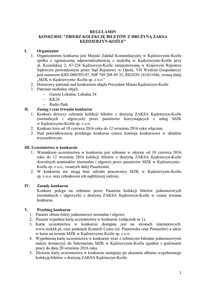 REGULAMIN KONKURSU ”ZBIERZ KOLEKCJĘ BILETÓW Z DRUŻYNĄ ZAKSA KĘDZIERZYN-KOŹLE” I. 1. 2. 3. II. 1. 2. 3. Organizator Organizatorem konkursu jest Miejski Zakład Komunikacyjny w Kędzierzynie-Koźlu spółka z ograniczoną odpowiedzialnością z siedzibą w Kędzierzynie-Koźlu przy ul. Kozielskiej 2, 47-224 Kędzierzyn-Koźle zarejestrowaną w Krajowym Rejestrze Sądowym prowadzonym przez Sąd Rejonowy w Opolu, VII Wydział Gospodarczy pod numerem KRS 000395147, NIP 749 208 69 32, REGON 161411646, zwaną dalej „MZK w Kędzierzynie–Koźlu sp. z o.o.” Honorowy patronat nad konkursem objęła Prezydent Miasta Kędzierzyn-Koźle Patronat medialny objęli: Gazeta Lokalna, Lokalna 24 KK24 Radio Park Zasięg i czas trwania konkursu Konkurs dotyczy zebrania kolekcji biletów z drużyną ZAKSA Kędzierzyn-Koźle (normalnych i ulgowych) przez pasażerów korzystających z usług MZK w Kędzierzynie-Koźlu sp. z o.o. Konkurs trwa od 10 czerwca 2016 roku do 12 września 2016 roku włącznie. Nad prawidłowością przebiegu konkursu czuwa komisja konkursowa w składzie trzyosobowym. III. Uczestnictwo w konkursie 1. Warunkiem uczestnictwa w konkursie jest zebranie w okresie od 10 czerwca 2016 roku do 12 września 2016 kolekcji biletów z drużyną ZAKSA Kędzierzyn-Koźle dowolnych nominałów (normalne i ulgowe) przez pasażerów MZK w Kędzierzynie– Koźlu sp. z o.o., zwanych dalej Pasażerami. 2. W konkursie nie mogą brać udziału pracownicy MZK w Kędzierzynie-Koźlu sp. z o.o. oraz członkowie ich najbliższej rodziny. IV. V. Zasady konkursu Konkurs polega na zebraniu przez Pasażera kolekcji biletów jednorazowych (normalnych i ulgowych) z drużyną ZAKSA Kędzierzyn-Koźle w czasie trwania konkursu. Przebieg konkursu 1. Pasażer zbiera bilety jednorazowe normalne i ulgowe. 2. Pasażer wypełnia kartę uczestnictwa w konkursie (załącznik nr 1), 3. Karta uczestnictwa w konkursie dostępna jest na stronach internetowych: www.mzkkk.pl, oraz punktach Kontroli Czasu (ul. Piastowska oraz Pionierów) a także w kasie na terenie MZK w Kędzierzynie-Koźlu sp. z o.o. 4. Wypełnioną kartę uczestnictwa w konkursie wraz z zebranymi biletami jednorazowymi należy dostarczyć do Sekretariatu MZK w Kędzierzynie-Koźlu zgodnie z godzinami pracy do dnia 20 września 2016 roku. 5. Złożenie karty uczestnictwa w konkursie następuje po okazaniu albumu wypełnionego kolekcją biletów z drużyną ZAKSA Kędzierzyn-Koźle. 1 6. Album, o którym mowa w pkt 5 będzie do nabycia w punktach Kontroli Czasu (ul. Piastowska oraz Pionierów) a także w kasie na terenie MZK w Kędzierzynie-Koźlu sp. z o.o. Cena albumu 1,23 zł ( w tym 23%VAT). 7. Karta uczestnictwa w konkursie powinna być wypełniona starannie bez żadnych skreśleń lub poprawek. Karta uczestnictwa w konkursie wypełniona nieczytelnie nie będzie brała udziału w konkursie. 8. Karty uczestnictwa w konkursie, które nie będą spełniały regulaminowych wymagań uznane zostaną za nieważne. 9. Komisja konkursowa w dniu 22 września 2016 roku wylosuje trzech zwycięzców konkursu. 10. O wynikach konkursu zwycięzcy zostaną poinformowani telefonicznie przez przedstawiciela komisji konkursowej. 11. W przypadku braku możliwości skontaktowania się ze zwycięzcą konkursu w ciągu 2 dni roboczych nagroda przepada, wówczas zostanie wylosowana kolejna osoba spełniająca warunki uczestnictwa w konkursie. VI. 1. 2. 3. 4. 5. 6. 7. Nagrody Fundatorem nagród jest MZK w Kędzierzynie-Koźlu sp. z o.o. oraz ZAKSA Kędzierzyn-Koźle Nagrodami głównymi w konkursie są: okresowe bilety MZK Kędzierzyn – Koźle na cały rok gadżety ZAKSA Kędzierzyn-Koźle nagrody rzeczowe. Nagrody nie podlegają zamianie na inne nagrody lub równowartość pieniężną. Każdy Pasażer wyłoniony przez komisję konkursową osobiście odbiera nagrodę w siedzibie MZK w Kędzierzynie-Koźlu sp. z o.o. Odbiór nagrody i jej pisemne potwierdzenie (załącznik nr 2) następuje do 30 września 2016 roku w sekretariacie MZK w Kędzierzynie-Koźlu sp. z o.o. w dniach od poniedziałku do piątku w godzinach 700-1500 za okazaniem dowodu tożsamości. Osoby niepełnoletnie nagrodę odbierają w obecności opiekuna prawnego. Jeżeli z jakichkolwiek przyczyn nagroda nie zostanie odebrana w terminie określonym w ust 5, nagroda przepada. VII. Ochrona danych osobowych 1. MZK w Kędzierzynie-Koźlu sp. z o.o. jest administratorem danych osobowych w rozumieniu ustawy z dnia 29 sierpnia 1997 roku o ochronie danych osobowych (DZ. U. z 2015 roku poz. 2135 z późn. zm). 2. Cel i zakres zbierania danych – dane osobowe będą przetwarzane w celu przeprowadzenia konkursu i wyłonienia jego zwycięzców. 3. Dane osobowe będą zbierane od osoby, której dotyczą. 4. Podanie danych osobowych jest dobrowolne ale niezbędne w celu uczestniczenia w konkursie. 5. Przystępując do konkursu Pasażerowie wyrażają pisemną zgodę na przetwarzanie danych osobowych, w rozumieniu ustawy z dnia 29 sierpnia 1997 roku o ochronie danych osobowych (DZ. U. z 2015 roku poz. 2135 z późn. zm) na potrzeby konkursu. 6. Zwycięzcy konkursu wyrażają zgodę na publikację imienia i nazwiska oraz wizerunku. 7. Uczestnikom konkursu przysługuje prawo dostępu i kontroli do treści swoich danych oraz ich poprawiania i ich uzupełniania. 2 8. MZK w Kędzierzynie-Koźlu sp. z o.o. ponosi pełną odpowiedzialność za naruszenie ustawy o ochronie danych osobowych lub ich przetwarzanie dla celów innych niż określone postanowieniami niniejszego Regulaminu. 9. MZK w Kędzierzynie-Koźlu sp. z o.o. zapewni przestrzeganie zasad poufności poprzez nałożenie stosownych zobowiązań na własnych pracowników i przedstawicieli partnerów uczestniczących w komisji, którym udostępni zastrzeżone informacje i dane w związku z powierzeniem wykonania przewidzianych niniejszym Regulaminem czynności konkursowych. VIII. Postanowienia końcowe 1. Prawo składania reklamacji przysługuje każdemu Pasażerowi