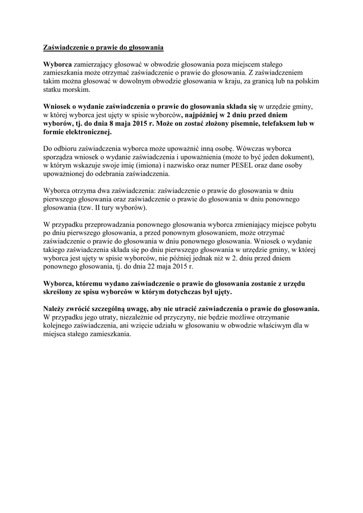 Zaświadczenie o prawie do głosowania Wyborca zamierzający głosować w obwodzie głosowania poza miejscem stałego zamieszkania może otrzymać zaświadczenie o prawie do głosowania. Z zaświadczeniem takim można głosować w dowolnym obwodzie głosowania w kraju, za granicą lub na polskim statku morskim. Wniosek o wydanie zaświadczenia o prawie do głosowania składa się w urzędzie gminy, w której wyborca jest ujęty w spisie wyborców, najpóźniej w 2 dniu przed dniem wyborów, tj. do dnia 8 maja 2015 r. Może on zostać złożony pisemnie, telefaksem lub w formie elektronicznej. Do odbioru zaświadczenia wyborca może upoważnić inną osobę. Wówczas wyborca sporządza wniosek o wydanie zaświadczenia i upoważnienia (może to być jeden dokument), w którym wskazuje swoje imię (imiona) i nazwisko oraz numer PESEL oraz dane osoby upoważnionej do odebrania zaświadczenia. Wyborca otrzyma dwa zaświadczenia: zaświadczenie o prawie do głosowania w dniu pierwszego głosowania oraz zaświadczenie o prawie do głosowania w dniu ponownego głosowania (tzw. II tury wyborów). W przypadku przeprowadzania ponownego głosowania wyborca zmieniający miejsce pobytu po dniu pierwszego głosowania, a przed ponownym głosowaniem, może otrzymać zaświadczenie o prawie do głosowania w dniu ponownego głosowania. Wniosek o wydanie takiego zaświadczenia składa się po dniu pierwszego głosowania w urzędzie gminy, w której wyborca jest ujęty w spisie wyborców, nie później jednak niż w 2. dniu przed dniem ponownego głosowania, tj. do dnia 22 maja 2015 r. Wyborca, któremu wydano zaświadczenie o prawie do głosowania zostanie z urzędu skreślony ze spisu wyborców w którym dotychczas był ujęty. Należy zwrócić szczególną uwagę, aby nie utracić zaświadczenia o prawie do głosowania. W przypadku jego utraty, niezależnie od przyczyny, nie będzie możliwe otrzymanie kolejnego zaświadczenia, ani wzięcie udziału w głosowaniu w obwodzie właściwym dla w miejsca stałego zamieszkania. Burmistrz Tarczyna Ul. Juliana Stępkowskiego 17 05-555 Tarczyn Wniosek o wydanie zaświadczenia o prawie do głosowania DANE WNIOSKODAWCY (WYBORCY) Imię,Imiona................................................................................................................................ Nazwisko................................................................................................................................... PESEL Adres………….......................................................................................................................... Wnoszę o wydanie zaświadczenia o prawie do głosowania w wyborach Prezydenta Rzeczypospolitej Polskiej zarządzonych na dzień 10 maja 2015 r. Jednocześnie załączam / nie załączam* do wniosku upoważnienie/a do odbioru zaświadczenia. ................................................. (miejscowość, data) Odebrałem/am dnia ……………………………….. ……………………………………………………… (czytelny podpis) ................................................. (podpis wnioskodawcy) * Dotyczy przypadku odbioru zaświadczenia przez upoważnioną osobę.