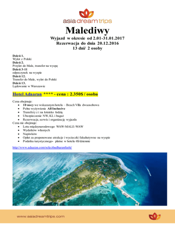 Malediwy Wyjazd w okresie od 2.01-31.01.2017 Rezerwacja do dnia 20.12.2016 13 dni/ 2 osoby Dzień 1. Wylot z Polski Dzień 2. Przylot do Male, transfer na wyspę Dzień 3-11 odpoczynek na wyspie Dzień 12. Transfer do Male, wylot do Polski Dzień 13. Lądowanie w Warszawie Hotel Adaaran **** - cena : 2.350$ / osoba Cena obejmuje: 10 nocy we wskazanym hotelu – Beach Villa dwuosobowa Pełne wyżywienie All Inclusive Transfery z i na lotnisko łodzią Ubezpieczenie NW, KL i bagaż Rezerwacje, serwis i organizację wyjazdu Cena nie obejmuje: Lotu międzynarodowego WAW-MALE-WAW Wydatków własnych Napiwków Opłat za proponowane atrakcje i wycieczki fakultatywne na wyspie Podatku turystycznego- płatne w hotelu 6$/dziennie http://www.adaaran.com/selecthudhuranfushi/ Malediwy Wyjazd w okresie od 2.01-31.01.2017 Rezerwacja do dnia 28.11.2016 13 dni/ 2 osoby Dzień 1. Wylot z Polski Dzień 2. Przylot do Male, transfer na wyspę Dzień 3-11 odpoczynek na wyspie Dzień 12. Transfer do Male, wylot do Polski Dzień 13. Lądowanie w Warszawie Hotel Ranveli Village **** - cena : 2.490$ / osoba Cena obejmuje: 10 nocy we wskazanym hotelu – Superior Room Pełne wyżywienie Full Board (śniadanie, obiad, kolacja) Transfery z i na lotnisko samolotem i łodzią Ubezpieczenie NW, KL i bagaż Rezerwacje, serwis i organizację wyjazdu Cena nie obejmuje: Lotu międzynarodowego WAW-MALE-WAW Wydatków własnych Napiwków Opłat za proponowane atrakcje i wycieczki fakultatywne na wyspie Podatku turystycznego – opłata w hotelu 6$/dziennie http://www.ranveliislandresort.com/