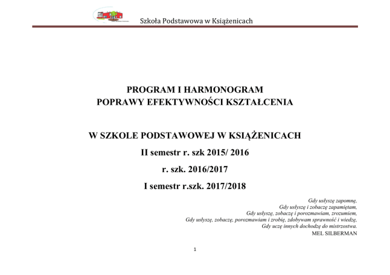 Szkoła Podstawowa w Książenicach PROGRAM I HARMONOGRAM POPRAWY EFEKTYWNOŚCI KSZTAŁCENIA W SZKOLE PODSTAWOWEJ W KSIĄŻENICACH II semestr r. szk 2015/ 2016 r. szk. 2016/2017 I semestr r.szk. 2017/2018 Gdy usłyszę zapomnę, Gdy usłyszę i zobaczę zapamiętam, Gdy usłyszę, zobaczę i porozmawiam, zrozumiem, Gdy usłyszę, zobaczę, porozmawiam i zrobię, zdobywam sprawność i wiedzę, Gdy uczę innych dochodzę do mistrzostwa. MEL SILBERMAN 1 Szkoła Podstawowa w Książenicach Spis treści: 1. 2. 3. 4. 5. 6. Uzasadnienie opracowania programu i harmonogramu poprawy efektywności kształcenia w Szkole Podstawowej w Książenicach. Cele opracowania programu i harmonogramu poprawy efektywności kształcenia. Program i harmonogram poprawy efektywności kształcenia. Metody ewaluacji programu i harmonogramu poprawy efektywności kształcenia. Projekt ewaluacji. Bibliografia. 1. Uzasadnienie opracowania i realizacji programu W Szkole Podstawowej w Książenicach w dniach 15 – 27 września 2015r. została przeprowadzona ewaluacja zewnętrzna. Na podstawie ewaluacji zewnętrznej ustalono niespełnienie wymagania „Procesy edukacyjne są zorganizowane w sposób sprzyjający uczeniu się”. W związku z tym Mazowiecki Kurator Oświaty wydał dyrektorowi SP w Książenicach polecenie opracowania „Programu i harmonogramu poprawy efektywności kształcenia”. Opracowanie programu ma wpłynąć na większe poczucie decyzyjności u uczniów w zakresie planowania procesów edukacyjnych, wzrost mobilizacji do nauki, poczucia sukcesu edukacyjnego, zwiększenie udziału uczniów w tym procesie, doskonalenie umiejętności nauczycieli w zakresie motywowania uczniów, udzielania im informacji zwrotnej z uwzględnieniem poczynionych postępów edukacyjnych oraz sposobów osiągania sukcesu dydaktycznego i sferę najbliższego rozwoju. Ważnym elementem programu jest doskonalenie organizacji pracy nauczycieli oraz wykorzystania diagnoz pedagogicznych w planowaniu procesów dydaktycznych i wychowawczych. Program uwzględnia zadania i konkretne działania, mające na celu poprawienie procesów ukierunkowanych na rozwój każdego ucznia. 2. Cele opracowania programu i harmonogramu poprawy efektywności kształcenia. Cel główny: Poprawa efektywności kształcenia w szkole. 2 Szkoła Podstawowa w Książenicach Cele szczegółowe: 1. Skorelowanie działań nauczycieli w procesie planowania procesu edukacyjnego i skutecznej realizacji wyznaczonych zadań. 2. Dostosowanie metod i form pracy oraz oceny jej efektów do indywidualnych potrzeb i możliwości uczniów. 3. Podniesienie u uczniów poziomu umiejętności uczenia się. 4. Doskonalenie kompetencji nauczycieli i rodziców w zakresie motywowania uczniów w oparciu o najnowszą wiedzę pedagogiczną. 5. Poprawa skuteczności informowania uczniów i rodziców o postępach w nauce. 6. Zwiększenie wpływu uczniów i rodziców na sposób organizowania procesu edukacyjnego. 7. Uświadamianie uczniom celowości zajęć edukacyjnych w dążeniach do integrowania wiedzy z różnych dziedzin i jej wykorzystania w praktyce. 8. Zwiększenie motywacji uczniów do zdobywania wiedzy i do brania odpowiedzialności za własny rozwój. 9. Stosowanie metod i form pracy na lekcji sprzyjających współpracy i uczeniu się od siebie. 10. Uświadomienie uczniom i ich rodzicom, że nauczyciele sprawiedliwie oceniają i równo traktują wszystkich uczniów. 3. Program i harmonogram poprawy efektywności kształcenia. OBSZAR ZADANIA Planowanie procesów edukacyjnych w szkole lub placówce służy rozwojowi a nauczyciele stosują różne metody pracy Stworzenie systemu wdrażania wniosków z nadzoru pedagogicznego. Udoskonalanie szkolnego systemu badania osiągnięć DZIAŁANIA/FORMY I SPOSOBY REALIZACJI TERMIN REALIZACJI Stworzenie planu nadzoru pedago- VIII – IX gicznego adekwatnego do prioryte2016 tów szkoły i państwa na dany rok szkolny. Powołanie zespołu i opracowanie systemu wdrażania wniosków, realizacja wyznaczonych zadań. 3 II-VI 2016 ODPOWIEDZIALNI dyrektor dyrektor, zespół ds. wdrażania wniosków PRZEWIDYWANE OSIĄGNIĘCIA Dyrektor i nauczyciele systemowo planują swoją pracę na podstawie priorytetowych wniosków z nadzoru. Nauczyciele sumiennie i terminowo realizują i dokumentują wyznaczone zadania. Nauczyciele planują proces nau- Szkoła Podstawowa w Książenicach dostosowane do uczniów i planowapotrzeb ucznia, nia procesu nauczagrupy, oddziału nia i uczenia się. Planowanie i wdrożenie innowacji pedagogicznych i nowatorskich rozwiązań. Powołanie zespołów: humanistycznego, matematycznoprzyrodniczego, języków obcych i edukacji wczesnoszkolnej. Współdziałanie nauczycieli w ramach powołanych zespołów nad opracowywaniem wyników badań edukacyjnych wewnętrznych i zewnętrznych i wdrażania wniosków II 2016 dyrektor każdy rok szkolny liderzy zespołów rady klasyfikacyjne śródroczne i roczne Wskazywanie uczniom mocnych na bieżąi słabych stron pracy w celu placo nowania dalszej nauki. wychowawcy, dyrektor, liderzy zespołów Prezentacja analiz wyników uczniom, rodzicom i radzie pedagogicznej. Doskonalenie nauczycieli w zakre- zgodnie sie umiejętności projektowania, z planem wdrażania innowacji pedagogicz- nadzoru nych i nowatorskich rozwiązań programowych. Wspieranie nauczycieli w podej- na bieżąmowaniu i realizacji innowacji. co 4 wszyscy nauczyciel, rodzice dyrektor, nauczyciele dyrektor, wicedyrektorzy czania i uczenia się uczniów współpracując z innymi nauczycielami. Nauczyciele dzielą odpowiedzialność za kształtowanie podstawowych umiejętności uczniów z innymi nauczycielami. Uczniowie znają wyniki diagnozy, wiedzą nad czym mają pracować. Rodzice są świadomi współodpowiedzialności za rzeczywisty poziom nabytych przez dziecko wiadomości i umiejętności. Uczniowie i rodzice znajdują w nauczycielach grupę współpracujących ze sobą osób wspierających rozwój dzieci Szkoła Podstawow