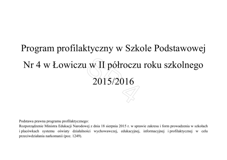 Program profilaktyczny w Szkole Podstawowej Nr 4 w Łowiczu w II półroczu roku szkolnego 2015/2016 Podstawa prawna programu profilaktycznego: Rozporządzenie Ministra Edukacji Narodowej z dnia 18 sierpnia 2015 r. w sprawie zakresu i form prowadzenia w szkołach i placówkach systemu oświaty działalności wychowawczej, edukacyjnej, informacyjnej i profilaktycznej w celu przeciwdziałania narkomanii (poz. 1249). WSTĘP Wyniki wywiadu dotyczącego działań profilaktycznych na terenie szkoły: Wywiad udzielany był przez rodziców klas 4 – 6 w trakcie zebrań w dniach 16 i 17 września 2015 roku. Wyniki przeprowadzonego wywiadu wskazują, że rodzice uznali, że najważniejszymi sprawami z zakresu profilaktyki, które powinny być omówione z uczniami to: - Rozwój osobisty ucznia. - Idealny nauczyciel, idealny uczeń. - Jak sobie radzić z agresywnym zachowaniem? - Co to są emocje, jak nad nimi zapanować? - Zachowanie uczniów wobec siebie. - Rozmowy na temat poniżania ludzi (dzieci). - Pogadanki o narkotykach, dopalaczach. W związku z ostatnim tematem w szkole odbyły się warsztaty profilaktyczne „Dopalacze – zakamuflowana śmierć” w dniu 16 grudnia 2015 roku w klasach 5 – 6. Korzystając z materiałów wypracowanych przez uczniów i osobę prowadzącą warsztaty przeprowadzono diagnozę. Wyniki diagnozy: Uczniowie w trakcie warsztatów odpowiadali na następujące pytania: „Co rozumiesz pod pojęciem uzależnienie oraz z czym kojarzy Ci słowo dopalacze?” oraz „Dlaczego młodzi ludzie sięgają po dopalacze?” 2 Pojęcie uzależnienie zostało zrozumiane przez uczniów przede wszystkim jako uzależnienie od czegoś, więc jako palenie, papierosy, alkohol, tabletki, leki, kofeina, energetyki, narkotyki, dopalacze, komputer, gry np.: minecraft, telefon, sex, filmy erotyczne, hazard, Facebook, słodycze, ale także jako problem czyli nałóg, , nieświadomość, złość, agresja, samotność, choroba, kradzież, chce się więcej, szkodzenie zdrowiu i życiu, utrata cennych rzeczy (przyjaźni), utrata wolności, utrata wszystkiego, jeśli chcesz przestać to nie możesz, powtarzanie czynności, siedzenie w zamknięciu, odcięcie się od świata, zachowania psychiczne, dziwne zachowania, samobójstwo, starzenie się, zabieranie czasu, (osoba uzależniona) nie chce pomocy, (potrzebna jest) terapia. Na pytanie o dopalaczach uczniowie wpisywali następujące stwierdzenia zioła, tabletki, prochy, środki chemiczne, mocarz, muchomor, trucizna, myśli samobójcze, samobójstwo, choroby, cmentarz, morderca świata, (zakamuflowana) śmierć, ukryta śmierć, utrata życia, szkodzi zdrowiu, paraliż, uzależnienie, depresja, zwidy, zawroty głowy, agresja, złość, smutek, głupota, głupie pomysły, kradzież, „menelstwo”, marionetka, więzienie, długi, diler, tajemnica, nieodpowiedzialność, niebezpieczeństwo, szkoła tvn, psycholog, „odstresowywują”, kokaina, LSD i alkohol, marihuana. Na pytanie „Dlaczego młodzi ludzie sięgają po dopalacze?” uczniowie odpowiadali następująco: - bo chcą się popisać, dla frajdy, żeby być „kool”, gdy chcą zaimponować, - chcą uciec od problemów, żeby rozwiązać problem, bo sobie nie radzą z problemami i stresem, żeby sobie radzić w trudnych sytuacjach, - bo są głupi i nie myślą, są lekkomyślni, z głupoty, mają nierówno pod sufitem, - bo są ciekawi, z ciekawości, - chcą zobaczyć jak to działa, bo chcą spróbować jak to działa, - chcą spróbować innego życia, chcą być lepsi, gdy czują się gorsi, - za namową ludzi, bo ulegają rówieśnikom, dlatego bo wpadają w złe towarzystwo, bo są namawiani, bo ktoś się z nich śmieje, - chcą „odlotu”, gdy chcą się zabawić, bo chcą eksperymentować, 3 - bo widzą to w filmach i nic się nie dzieje, - nie znają zagrożenia, - są uzależnieni, - gdy się z kimś pokłóci, - chcą mieć więcej pomysłów na wybryki, bo chcą zabłysnąć przed kolegami, - gdy chcą mieć większe wsparcie, bo nie maja wsparcia, bo szukają pomocy, -gdy są samotni i bez rodziców, - gdy czują depresje, bo są smutni, - ponieważ chcą dorównać innym. W dwóch grupach warsztatowych uczniowie otrzymali jeszcze dwa zagadnienia do rozwiązania: „Co zrobić żeby się uchronić przed dopalaczami?/Jak uchronić się przed dopalaczami?” oraz „Stop dopalaczom! Jak zatrzymać branie dopalaczy?” Na pierwsze padały następujące odpowiedzi: - być rozsądnym, być asertywnym, - posiadać wiedzę o dopalaczach (jak trujące są dopalacze), - iść do terapeuty jeżeli ma się problem, - dobierać odpowiednie towarzystwo, - nie dawać się namawiać innym, - walczyć ze słabościami, - mieć silny charakter, - nie poddawać się, - rozwiązywać problemy (rozmowa), - poradzić się osób doświadczonych, 4 - mieć marzenia, - znaleźć jakieś zajęcie, - mieć własne zdanie, - mieć kontakt z naturą. Na drugie zagadnienie uczniowie wpisali takie sformułowania: - powstrzymać osoby, które chcą wziąć, - nie kupować dopalaczy, - sprzedawać tylko dorosłym, - przestać brać, - nie brać na imprezach, - pomagać osobom uzależnionym, - organizować zajęcia o dopalaczach, - powiadomić policje, - silna wola, „nie tańcz jak Ci zagrają”, - dobre towarzystwo, - psycholog, - radzenie sobie ze stresem, - terapia, - wiedza, ucz się, - własne hobby np. sport, - poświęcaj 2 godziny na komputer, - wpływaj na swoje życie, - traktuj dobrze innych. 5 Działalność profilaktyczna w szkole i placówce polega na realizowaniu działań z zakresu profilaktyki uniwersalnej, selektywnej i wskazującej. Działalność profilaktyczna obejmuje: 1) w przypadku profilaktyki uniwersalnej – wspieranie wszystkich uczniów i wychowanków w prawidłowym rozwoju i zdrowym stylu życia oraz podejmowanie działań, których celem jest ograniczanie zachowań ryzykownych niezależnie od poziomu ryzyka używania przez nich środków i substancji (psychotrop