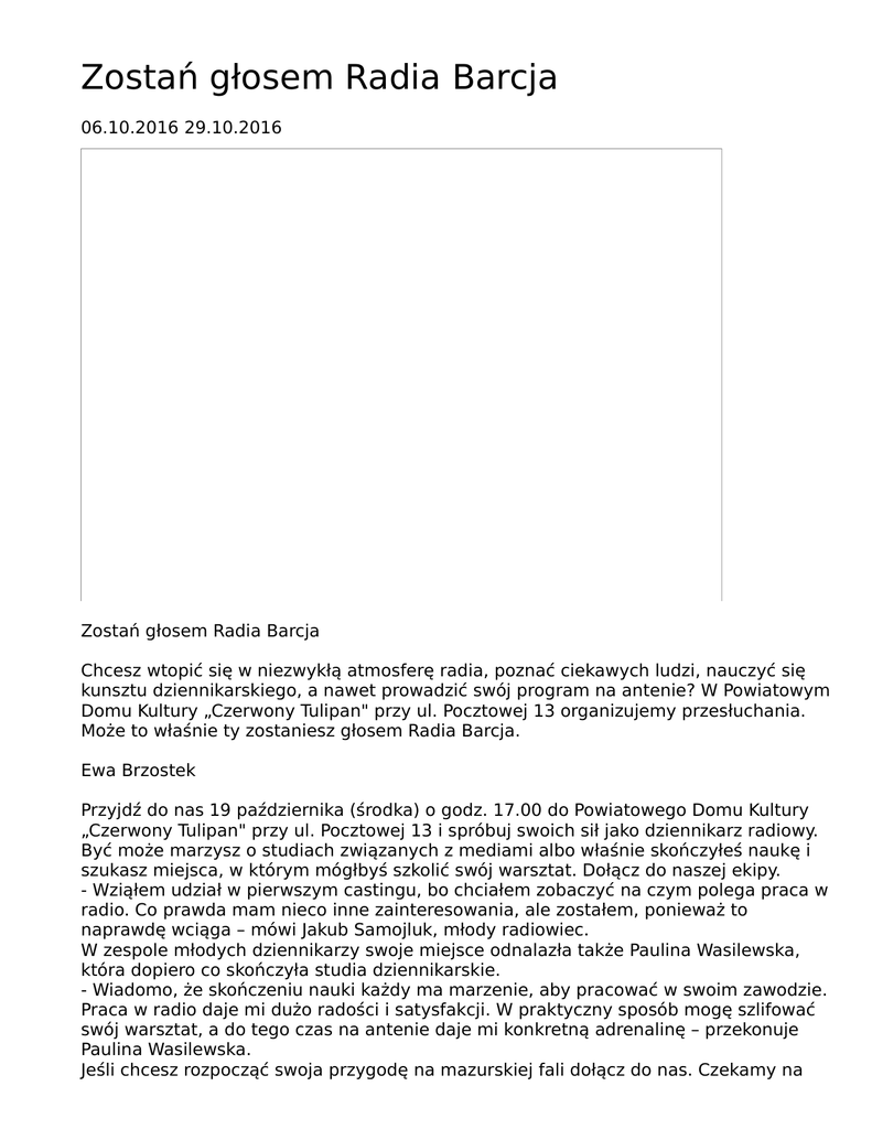 Zostań głosem Radia Barcja 06.10.2016 29.10.2016 Zostań głosem Radia Barcja Chcesz wtopić się w niezwykłą atmosferę radia, poznać ciekawych ludzi, nauczyć się kunsztu dziennikarskiego, a nawet prowadzić swój program na antenie? W Powiatowym Domu Kultury „Czerwony Tulipan" przy ul. Pocztowej 13 organizujemy przesłuchania. Może to właśnie ty zostaniesz głosem Radia Barcja. Ewa Brzostek Przyjdź do nas 19 października (środka) o godz. 17.00 do Powiatowego Domu Kultury „Czerwony Tulipan" przy ul. Pocztowej 13 i spróbuj swoich sił jako dziennikarz radiowy. Być może marzysz o studiach związanych z mediami albo właśnie skończyłeś naukę i szukasz miejsca, w którym mógłbyś szkolić swój warsztat. Dołącz do naszej ekipy. - Wziąłem udział w pierwszym castingu, bo chciałem zobaczyć na czym polega praca w radio. Co prawda mam nieco inne zainteresowania, ale zostałem, ponieważ to naprawdę wciąga – mówi Jakub Samojluk, młody radiowiec. W zespole młodych dziennikarzy swoje miejsce odnalazła także Paulina Wasilewska, która dopiero co skończyła studia dziennikarskie. - Wiadomo, że skończeniu nauki każdy ma marzenie, aby pracować w swoim zawodzie. Praca w radio daje mi dużo radości i satysfakcji. W praktyczny sposób mogę szlifować swój warsztat, a do tego czas na antenie daje mi konkretną adrenalinę – przekonuje Paulina Wasilewska. Jeśli chcesz rozpocząć swoja przygodę na mazurskiej fali dołącz do nas. Czekamy na twój głos 19 października o godz. 17.00 w gościnnym domu kultury.