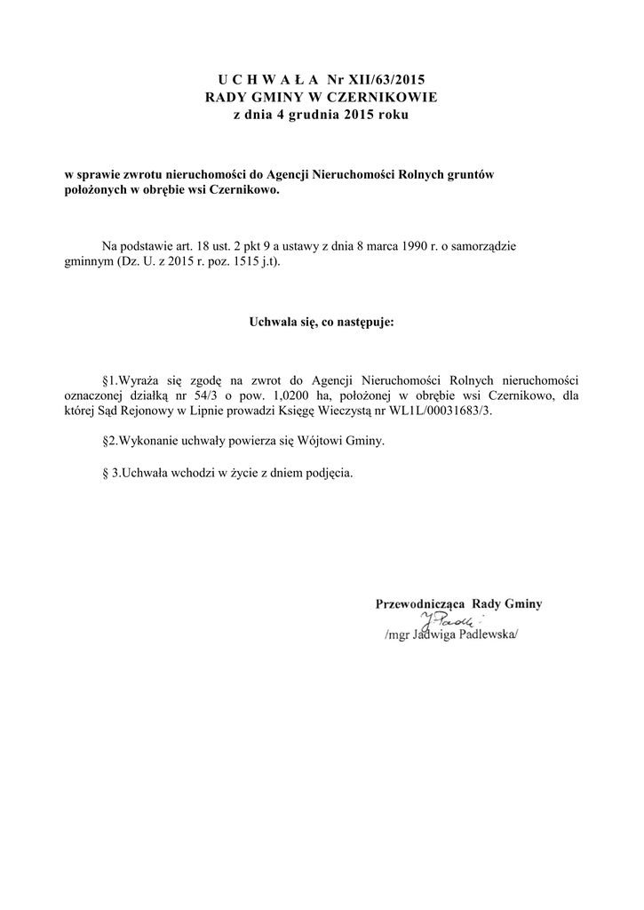 U C H W A Ł A Nr XII/63/2015 RADY GMINY W CZERNIKOWIE z dnia 4 grudnia 2015 roku w sprawie zwrotu nieruchomości do Agencji Nieruchomości Rolnych gruntów położonych w obrębie wsi Czernikowo. Na podstawie art. 18 ust. 2 pkt 9 a ustawy z dnia 8 marca 1990 r. o samorządzie gminnym (Dz. U. z 2015 r. poz. 1515 j.t). Uchwala się, co następuje: §1.Wyraża się zgodę na zwrot do Agencji Nieruchomości Rolnych nieruchomości oznaczonej działką nr 54/3 o pow. 1,0200 ha, położonej w obrębie wsi Czernikowo, dla której Sąd Rejonowy w Lipnie prowadzi Księgę Wieczystą nr WL1L/00031683/3. §2.Wykonanie uchwały powierza się Wójtowi Gminy. § 3.Uchwała wchodzi w życie z dniem podjęcia. Uzasadnienie Zwrot do Agencji Nieruchomości Rolnych działki nr 54/3 o pow. 1,0200 ha, położonej w obrębie Czernikowo, uzasadnia się tym, że Gmina nie zagospodarowała jej zgodnie z umową z dnia 01 lipca 2005 r. Rep. A nr 10024/2005 (tj. zgodnie z przeznaczeniem na cele rekreacyjno-sportowe). Działka przejęta od Agencji Nieruchomości Rolnych planowana była pod budowę drugiego „ORLIKA” w Czernikowie, ale ówczesna Rada Gminy nie podjęła decyzji o budowie „ORLIKA” w Czernikowie, natomiast działkę przejętą od Agencji Nieruchomości Rolnej postanowiono wydzierżawić okolicznym rolnikom w przetargu. Po kontroli przeprowadzonej przez ANR prawidłowości wykorzystania przekazanych gminie gruntów, które w jej ocenie nie zostały zagospodarowane zgodnie z celem ich przejęcia. Agencja Nieruchomości Rolnych zaproponowała zwrot działki nr 54/3 do Zasobu WRSP lub zapłatę przez Gminę na rzecz Agencji aktualnej wartości pieniężnej za kwotę 90.000,00 tyś. zł. określoną przez rzeczoznawcę majątkowego. W związku z tym, że nie jest celowe poniesienie kosztów związanych z jej zakupem za w/w cenę, wnoszę o wyrażenie zgody na zwrot do Zasobu WRSP działki opisanej w projekcie uchwały.