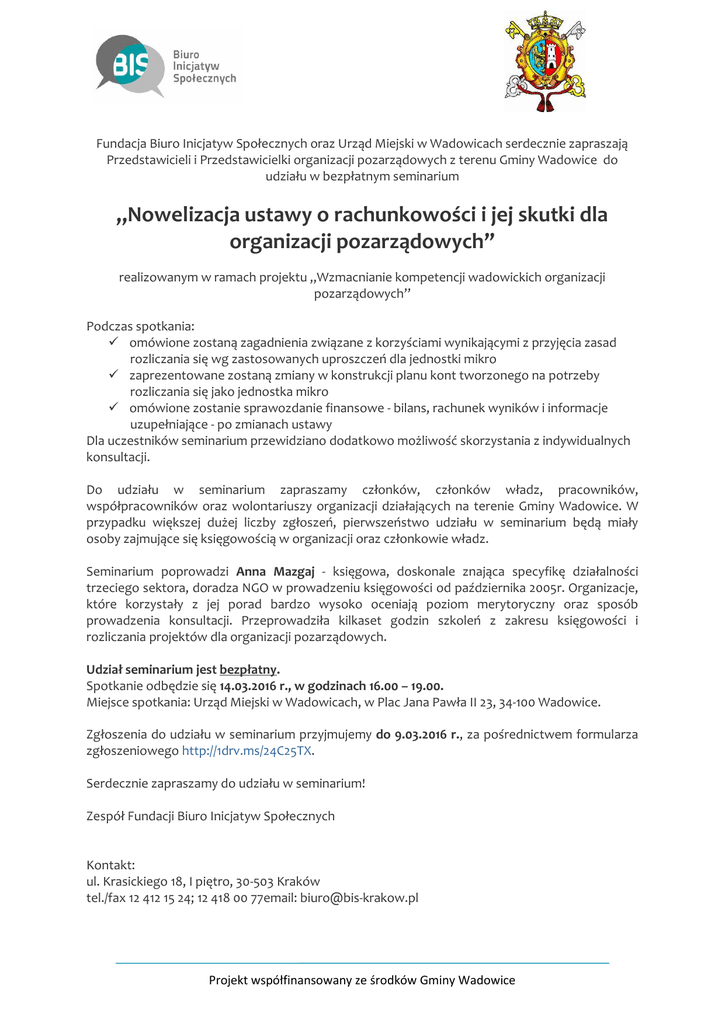 Fundacja Biuro Inicjatyw Społecznych oraz Urząd Miejski w Wadowicach serdecznie zapraszają Przedstawicieli i Przedstawicielki organizacji pozarządowych z terenu Gminy Wadowice do udziału w bezpłatnym seminarium „Nowelizacja ustawy o rachunkowości i jej skutki dla organizacji pozarządowych” realizowanym w ramach projektu „Wzmacnianie kompetencji wadowickich organizacji pozarządowych” Podczas spotkania: omówione zostaną zagadnienia związane z korzyściami wynikającymi z przyjęcia zasad rozliczania się wg zastosowanych uproszczeń dla jednostki mikro zaprezentowane zostaną zmiany w konstrukcji planu kont tworzonego na potrzeby rozliczania się jako jednostka mikro omówione zostanie sprawozdanie finansowe - bilans, rachunek wyników i informacje uzupełniające - po zmianach ustawy Dla uczestników seminarium przewidziano dodatkowo możliwość skorzystania z indywidualnych konsultacji. Do udziału w seminarium zapraszamy członków, członków władz, pracowników, współpracowników oraz wolontariuszy organizacji działających na terenie Gminy Wadowice. W przypadku większej dużej liczby zgłoszeń, pierwszeństwo udziału w seminarium będą miały osoby zajmujące się księgowością w organizacji oraz członkowie władz. Seminarium poprowadzi Anna Mazgaj - księgowa, doskonale znająca specyfikę działalności trzeciego sektora, doradza NGO w prowadzeniu księgowości od października 2005r. Organizacje, które korzystały z jej porad bardzo wysoko oceniają poziom merytoryczny oraz sposób prowadzenia konsultacji. Przeprowadziła kilkaset godzin szkoleń z zakresu księgowości i rozliczania projektów dla organizacji pozarządowych. Udział seminarium jest bezpłatny. Spotkanie odbędzie się 14.03.2016 r., w godzinach 16.00 – 19.00. Miejsce spotkania: Urząd Miejski w Wadowicach, w Plac Jana Pawła II 23, 34-100 Wadowice. Zgłoszenia do udziału w seminarium przyjmujemy do 9.03.2016 r., za pośrednictwem formularza zgłoszeniowego http://1drv.ms/24C25TX. Serdecznie zapraszamy do udziału w seminarium! Zespół Fundacji Biuro Inicjatyw Społecznych Kontakt: ul. Krasickiego 18, I piętro, 30-503 Kraków tel./fax 12 412 15 24; 12 418 00 77email: [email protected] ________________________________________ Projekt współfinansowany ze środków Gminy Wadowice