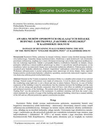XXVI Konferencja Naukowo-Techniczna awarie budowlane 2013 KAZIMIERZ SZULBORSKI, [email protected] Politechnika Warszawska ANNA MAJEWSKA, [email protected] Politechnika Warszawska1 AWARIA MURÓW OPOROWYCH OKALAJĄCYCH DZIAŁKĘ BUDYNKU ZABYTKOWEJ „FAKTORII ANGIELSKIEJ” W KAZIMIERZU DOLNYM DAMAGE OF RETAINING WALLS SURROUNDING THE SITE OF THE MONUMENT “ENGLISH TRADING POST” AT KAZIMIERZ DOLNY Streszczenie Kazimierz Dolny, położony na skarpie wiślanej, stanowi cenny dorobek naszego dziedzictwa kulturowego. Naturalne skarpy kazimierzowskie, zbudowane z opok kredowych i ich zwietrzelin, porośnięte roślinnością, znajdują się w stanie chwiejnej równowagi i przy braku ingerencji (podkopywania) nie wykazują zagrożenia. Jednak w przypadku budowy (rozbudowy) budynku na skarpie, relacje pomiędzy zabudową a stanem podłoża gruntowego są silnie i w specyficzny sposób powiązane, co ma zasadniczy wpływ na stateczność skarpy oraz zachowanie techniczne zabudowy. Podczas prac modernizacyjnych przy budynku zabytkowej „Faktorii Angielskiej” nadrzędnym celem była ochrona zabytku. Wykonano zabezpieczenia w postaci połączonego muru oporowego od strony skarpy, który zapewnił bezpieczeństwo użytkowania budynku i zabudowy sąsiedniej, unormowały stateczność wzgórza i stanowią skuteczną ochronę przed awarią budowlaną. Abstract Situated on the Vistula escarpment, Kazimierz Dolny is a valuable achievement of our national heritage. Natural scarps of Kazimierz were made of cretaceous. Covert by plants and without trenches the weathering scarp right now is not a threat and stay in tottery balance. However, in case of further expansion of the building it must be remembered, that the relations between the buildings and the state of the soil are strong and specifically connected, what will have vital effect on stability of escarpment and technical reactions of the buildings. The primal intent during the reconstruction works of “English Trading Post” was the protection of the monument. It combines retaining wall from the scarp’s side, which maintain the security of usage of the building and adjacent building, which have created stability of the hill and are efficient protection against construction accident Wstęp Kazimierz Dolny dzięki swemu malowniczemu położeniu, znamienitej historii oraz bogactwie renesansowej sztuki budowlanej – murowanej i drewnianej, stanowi cenny zespół urbanistyczno-architektoniczny. Istniejące na terenie miasta zabytkowe obiekty architektoniczne, składają się na dorobek kulturalny całego narodu. Utrzymanie tego dziedzictwa narodowego i zachowania go dla przyszłych pokoleń jest warunkiem tożsamości tego miejsca, jego indywidualności i unikalności. W 1979 r. na terenie miasta i jego otoczenia utworzono Kazimierzowski Park Krajobrazowy. Obszar parku chroniony jest ze względu na wartości 1 Współpraca merytoryczna – prof. dr hab. inż. Lech Wysokiński 434 Szulborski K. i in: Awaria murów oporowych okalających działkę budynku zabytkowej… przyrodnicze, historyczne i kulturowe, lecz w odróżnieniu od innych form chronionych (np. parków narodowych czy obszarów chronionego krajobrazu), celem jest tu nie tylko ochrona, lecz głównie popularyzacja i upowszechnienie zabytkowych i przyrodniczych walorów terenu w warunkach racjonalnego gospodarowania. Możliwe i dopuszczalne są, zatem w tym rejonie działania przywracające historyczne wartości jak i podnoszące walory terenu. Do takich wartości należy wykorzystanie do budowy ścian budynków miejscowego surowca, jakim jest opoka kredowa. Początki budowania z tej skały, powszechnej na Lubelszczyźnie (kamieniołomy w Kazimierzu, Bochotnicy i Nasiłowie), przypadają na wiek XVI i XVII. Do popularności tego materiału przyczyniła się łatwość jego wydobycia ze starej doliny Wisły oraz jego zalety techniczne i właściwości geomechaniczne. Ciężar objętościowy typowej opoki kazimierzowskiej jest niski (1,3÷1,4 T/m3). Cechuje go duża porowatość (46÷52%) i nasiąkliwość (28÷32%) oraz dobra mrozoodporność i wytrzymałość (w stanie powietrzno-suchym ok. Rc = 20 MPa, a w stanie nasyconym ok. Rc = 10 MPa). Anizotropia wytrzymałości jest nieznaczna, co skała zawdzięcza rozproszonemu detrytusowi organicznemu. Dodatkową korzystną cechą jest to, że sezonowane po wydobyciu ze złoża opoki twardnieją i zmniejszają nasiąkliwość. Cechy te uzasadniają, dlaczego surowiec ten stał się od średniowiecza podstawą rozwoju architektury kamiennej w Kazimierzu. Jednym z cenniejszych zabytków Kazimierza jest zbudowany z kazimierzowskiej skały – budynek „Faktorii Angielskiej”. Położony na stoku wysoczyzny (skarpy), biegnącej równolegle do Wisły, znajduje się on w strefie ścisłej ochrony konserwatorskiej układu architektoniczno-krajobrazowego Kazimierza Dolnego. Ta lokalizacja powoduje, że relacje pomiędzy zabudową a stanem podłoża gruntowego są silnie i w specyficzny sposób powiązane, co ma zasadniczy wpływ na stateczność skarpy oraz zachowanie techniczne zabytkowej zabudowy. 2. Położenie i rys historyczny budynku „Faktorii Angielskiej” Historyczny budynek dawnej „Faktorii Angielskiej”, o wyraźnej kamiennej architekturze, zlokalizowany jest w pierzei ulicy Krakowskiej, w odległości ok. 0,5 m od wschodniej granicy z działką sąsiednią. Został częściowo wcięty w skarpę wiślaną. Od strony południowej, wysoczyzna ograniczona była murem z kamienia wapiennego (rys. 1). Rys. 1. Fragment mapy topograficznej Kazimierza Dolnego z zaznaczoną lokalizacją działki Legenda głosi, że obiekt powstał w drugiej połowie XVII wieku i pełnił funkcję konsulatu angielskiego (rezydencja faktora angielskiego), siedziby i miejsca obrad angielskich kupców zbożowych przybywających do Kazimierza po towar. W XVIII w. „Faktoria” należała już do kazimierskiego rodu Kwasków. Budowla nosiła cechy domu mieszkalneg