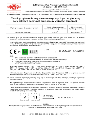 Elektroniczne Wagi Przemysłowe Zdzisław Niewiński ul. Zacna 31 , 80-283 Gdańsk Rok założenia 1991 Autoryzowany przedstawiciel oraz serwis firm: Pfister, S-E-G, Dini Argeo, Rhewa Waagen, Leon Engineering, Ascell Sensor, Sensocar, Soehnle Professional www.ewp.com.pl | [email protected] | 801-000-538 | tel. (058) 340-00-61 | fax (058) 348-51-56 w.13 Terminy zgłoszenia wag nieautomatycznych po raz pierwszy do legalizacji ponownej oraz okresy ważności legalizacji. Wagi wprowadzone do obrotu w terminie Termin zgłoszenia po raz pierwszy do legalizacji ponownej po 07 stycznia 2007 r. 3 lata 1) Okres ważności legalizacji ponownej 25 miesięcy 2) 1) Termin liczy się od dnia pierwszego grudnia roku (dwie ostatnie cyfry przy znaku CE), w którego oznaczenie zostało naniesione na wadze podczas dokonywania oceny zgodności. Legalizacja nowej wagi potwierdzona jest dokumentem „Świadectwo zgodności” (wystawione przez Urząd Miar), „Deklaracją zgodności” (wystawiona przez EWP) oraz plombami zabezpieczającymi i oznaczeniami na tabliczce znamionowej, przykład poniżej: 3 lata Gdzie: do 01.12.2014 r. włącznie Znak CE oznacza zgodność produktu z normami europejskimi „11” oznaczenie roku produkcji (służy do wyznaczania ważności legalizacji) „zielona M” oznaczenie urządzenia metrologicznego z legalizacją „1443” numer jednostki notyfikującej Podstawa prawna: ustawa z dnia 11 maja 2001 r. Prawo o miarach (Dz.U. z 2004 r. Nr 243, poz. 2441, z 2005 r. Nr 163, poz. 1362, Nr 180, poz. 1494, z 2006 r. Nr 170, poz. 1217, Nr 249, poz. 1834, z 2007 r. Nr 176, poz.1238, z 2008 r. Nr 227, poz. 1505, z 2009 r. Nr 18, poz. 97). Akt wykonawczy: Rozporządzenie Ministra Gospodarki z dnia 07 stycznia 2008 r. w sprawie prawnej kontroli metrologicznej przyrządów pomiarowych (Dz.U. z 2008 r. Nr 5, poz. 29). 2) Okres ważności legalizacji ponownej liczy się od pierwszego dnia tego miesiąca, w którym legalizacja została dokonana. Akt wykonawczy: Rozporządzenie Ministra Gospodarki z dnia 07 stycznia 2008 r. w sprawie prawnej kontroli metrologicznej przyrządów pomiarowych (Dz.U. z 2008 r. Nr 5, poz. 29). Cechy legalizacyjne (legalizacja ponowna) naklejone są na wadze w postaci naklejek: miesięczna-rzymska i roczna-dwie cyfry arabskie – przykład poniżej. Po legalizacji ponownej wystawiane jest także polskie świadectwo legalizacji ponownej wagi. IV 11 25 miesięcy do 30.04.2013 r. UWAGA: Na użytkowniku wagi spoczywa należyta dbałość o nieuszkodzenie cech legalizacyjnych oraz zgłaszanie do legalizacji ponownej wagi w odpowiednim czasie. E WP | NI P P L 5 8 3 -2 41 -0 5 -44 | R EG O N P -190 547573