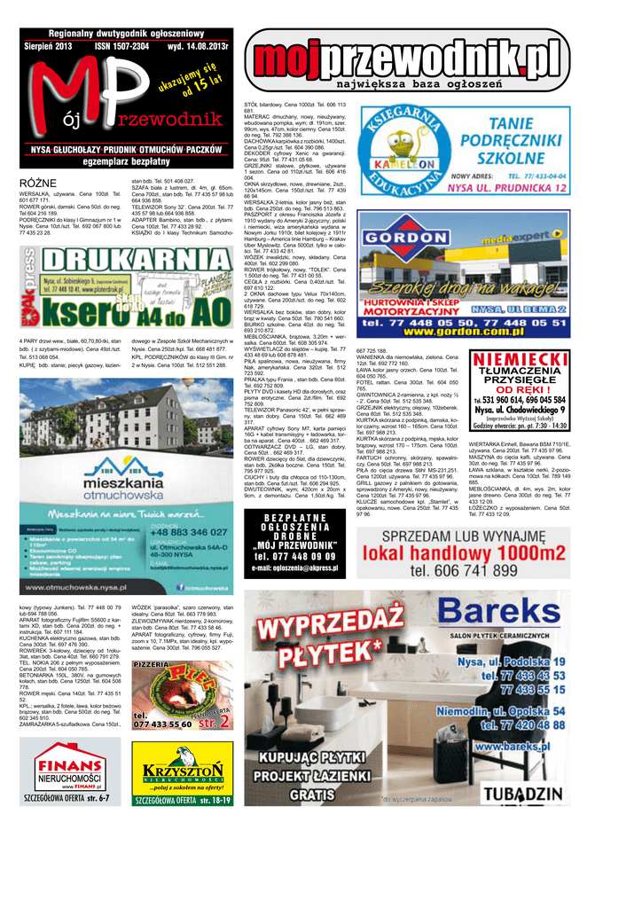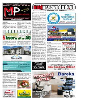 Regionalny dwutygodnik og³oszeniowy Sierpień 2013 ISSN 1507-2304 wyd. 14.08.2013r siê y m uje 5 lat z a k u od 1 NYSA G£UCHO£AZY PRUDNIK OTMUCHÓW PACZKÓW egzemplarz bezp³atny RÓŻNE WERSALKA, używana. Cena 100zł. Tel. 601 677 171. ROWER górski, damski. Cena 50zl. do neg. Tel 604 216 189. PODRĘCZNIKI do klasy I Gimnazjum nr 1 w Nysie. Cena 10zł./szt. Tel. 692 067 800 lub 77 435 23 28. stan bdb. Tel. 501 408 027. SZAFA biała z lustrem, dł. 4m, gł. 65cm. Cena 700zł., stan bdb. Tel. 77 435 57 98 lub 664 936 858. TELEWIZOR Sony 32’. Cena 200zł. Tel. 77 435 57 98 lub 664 936 858. ADAPTER Bambino, stan bdb., z płytami. Cena 100zł. Tel. 77 433 28 92. KSIĄŻKI do I klasy Technikum Samocho- 4 PARY drzwi wew., białe, 60,70,80-tki, stan dowego w Zespole Szkół Mechanicznych w bdb. ( z szybami-miodowe). Cena 49zł./szt. Nysie. Cena 250zł./kpl. Tel. 668 481 877. Tel. 513 068 054. KPL. PODRĘCZNIKÓW do klasy III Gim. nr KUPIĘ bdb. stanie; piecyk gazowy, łazien- 2 w Nysie. Cena 100zł. Tel. 512 551 288. STÓŁ bilardowy. Cena 1000zł. Tel. 606 113 681. MATERAC dmuchany, nowy, nieużywany, wbudowana pompka, wym; dł. 191cm, szer. 99cm, wys. 47cm, kolor ciemny. Cena 150zł. do neg. Tel. 792 388 136. DACHÓWKA karpiówka z rozbiórki, 1400szt. Cena 0,25gr./szt. Tel. 604 390 086. DEKODER cyfrowy Xenic na gwarancji. Cena: 95zł. Tel. 77 431 05 68. GRZEJNIKI stalowe, płytkowe, używane 1 sezon. Cena od 110zł./szt. Tel. 606 416 004. OKNA skrzydłowe, nowe, drewniane, 2szt., 120x145cm. Cena 150zł./szt. Tel. 77 439 66 94. WERSALKA 2-letnia, kolor jasny beż, stan bdb. Cena 250zł. do neg. Tel. 796 513 863. PASZPORT z okresu Franciszka Józefa z 1910 wydany do Ameryki 2-języczny; polski i niemiecki, wiza amerykańska wydana w Nowym Jorku 1910r, bilet kolejowy z 1911r Hamburg – America linie Hamburg – Krakav Uber Myslowitz. Cena 5000zł. tylko w całości. Tel. 77 433 42 81. WÓZEK inwalidzki, nowy, składany. Cena 400zł. Tel. 602 299 080. ROWER trójkołowy, nowy, “TOLEK”. Cena 1.500zł do neg. Tel. 77 431 00 55. CEGŁA z rozbiórki. Cena 0,40zł./szt. Tel. 697 610 122. 2 OKNA dachowe typu Velux 70x140cm, używane. Cena 200zł./szt. do neg. Tel. 602 618 729. WERSALKA bez boków, stan dobry, kolor brąz w kwiaty. Cena 50zł. Tel. 790 541 660. BIURKO szkolne. Cena 40zł. do neg. Tel. 693 210 872. MEBLOŚCIANKA, brązowa, 3,20m + wersalka. Cena 600zł. Tel. 608 305 974. WYŚWIETLACZ do slajdów – kupię. Tel. 77 433 48 69 lub 608 878 481. PIŁA spalinowa, nowa, nieużywana, firmy Nak, amerykańska. Cena 320zł. Tel. 512 723 592. PRALKA typu Frania , stan bdb. Cena 60zł. Tel. 692 752 809. PŁYTY DVD i kasety HD dla dorosłych, oraz pisma erotyczne. Cena 2zł./film. Tel. 692 752 809. TELEWIZOR Panasonic 42’, w pełni sprawny, stan dobry. Cena 150zł. Tel. 662 469 317. APARAT cyfrowy Sony M7, karta pamięci 16G + kabel transmisyjny + ładowarka, torba na aparat . Cena 400zł. . 662 469 317. ODTWARZACZ DVD – LG, stan dobry. Cena 50zł. . 662 469 317. ROWER dziecięcy do 5lat, dla dziewczynki, stan bdb, 2kółka boczne. Cena 150zł. Tel. 795 977 925. CIUCHY i buty dla chłopca od 110-130cm, stan bdb. Cena 5zł./szt. Tel. 606 294 925. DWUTEOWNIK, wym; 420cm x 20cm x 9cm, z demontażu. Cena 1,50zł./kg. Tel. BEZPŁATNE OGŁOSZENIA DROBNE „MÓJ PRZEWODNIK” tel. 077 448 09 09 e-mail: [email protected] kowy (typowy Junkers). Tel. 77 448 00 79 lub 694 788 056. APARAT fotograficzny Fujifilm S5600 z kartami XD, stan bdb. Cena 200zł. do neg. + instrukcja. Tel. 607 111 184. KUCHENKA elektryczno gazowa, stan bdb. Cena 300zł. Tel. 697 476 390. ROWEREK 3-kołowy, dziecięcy od 1roku3lat, stan bdb. Cena 40zł. Tel. 660 791 279. TEL. NOKIA 206 z pełnym wyposażeniem. Cena 200zł. Tel. 604 050 765. BETONIARKA 150L, 380V, na gumowych kołach, stan bdb. Cena 1250zł. Tel. 604 508 778. ROWER męski. Cena 140zł. Tel. 77 435 51 52. KPL.; wersalka, 2 fotele, ława, kolor beżowo brązowy, stan bdb. Cena 500zł. do neg. Tel. 602 345 910. ZAMRAŻARKA 5-szufladkowa. Cena 150zł., SZCZEGÓŁOWA OFERTA str. 6-7 WÓZEK ‘parasolka”, szaro czerwony, stan idealny. Cena 80zł. Tel. 663 778 983. ZLEWOZMYWAK nierdzewny, 2-komorowy, stan bdb. Cena 80zł. Tel. 77 433 58 46. APARAT fotograficzny, cyfrowy, firmy Fuji, zoom x 10, 7.1MPx, stan idealny, kpl. wyposażenie. Cena 300zł. Tel. 796 055 527. SZCZEGÓŁOWA OFERTA str. 18-19 667 725 188. WANIENKA dla niemowlaka, zielona. Cena 12zł. Tel. 692 772 160. ŁAWA kolor jasny orzech. Cena 100zł. Tel. 604 050 765. FOTEL rattan. Cena 300zł. Tel. 604 050 765. GWINTOWNICA 2-ramienna, z kpl. noży ½ - 2’. Cena 50zł. Tel. 512 535 348. GRZEJNIK elektryczny, olejowy, 10żeberek. Cena 80zł. Tel. 512 535 348. KURTKA skórzana z podpinką, damska, kolor czarny, wzrost 160 – 165cm. Cena 100zł. Tel. 697 988 213. KURTKA skórzana z podpinką, męska, kolor brązowy, wzrost 170 – 175cm. Cena 100zł. Tel. 697 988 213. FARTUCH ochronny, skórzany, spawalniczy. Cena 50zł. Tel. 697 988 213. PIŁA do cięcia drzewa Stihl MS-231,251. Cena 1200zł. używana. Tel. 77 435 97 96. GRILL gazowy z palnikiem do gotowania, sprowadzony z Ameryki, nowy, nieużywany. Cena 1200zł. Tel. 77 435 97 96. KLUCZE samochodowe kpl. „Stamlet”, w opakowaniu, nowe. Cena 250zł. Tel. 77 435 97 96. WIERTARKA Einhell, Bawaria BSM 710/1E, używana. Cena 200zł. Tel. 77 435 97 96. MASZYNA do cięcia kafli, używana. Cena 30zł. do neg. Tel. 77 435 97 96. ŁAWA szklana, w kształcie nerki, 2-poziomowa na kółkach. Cena 100zł. Tel. 789 149 885. MEBLOŚCIANKA, dł. 4m, wys. 2m, kolor jasne drewno. Cena 300zł. do neg. Tel. 77 433 12 09. ŁÓŻECZKO z wyposażeniem. Cena 50zł. Tel. 77 433 12 09. BEZPŁATNE OGŁOSZENIA DROBNE „MÓJ PRZEWODNIK” tel. 077 448 09 09 e-mail: [email protected] SPAWARKA Bester 1300, kabina C360, starego typu, rozsiewacz nawozu gruszka, kosiarka spalinowa do remontu. Cena każdej szt. – 160zł. Tel. 696 960 754. BUDA dla psa, nowa, mało używana, duż