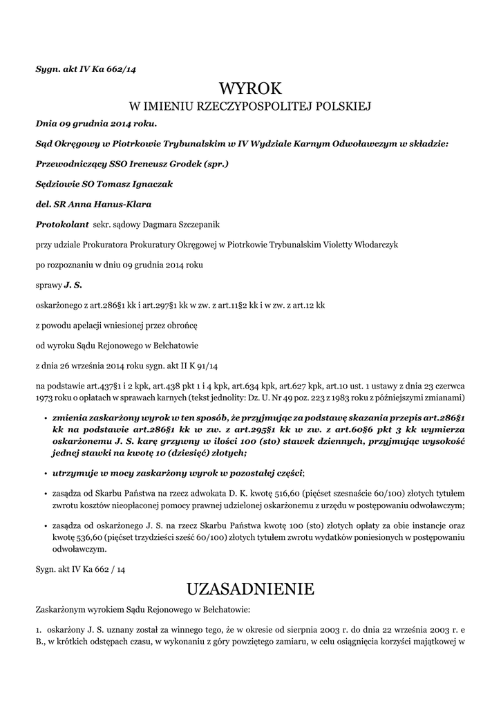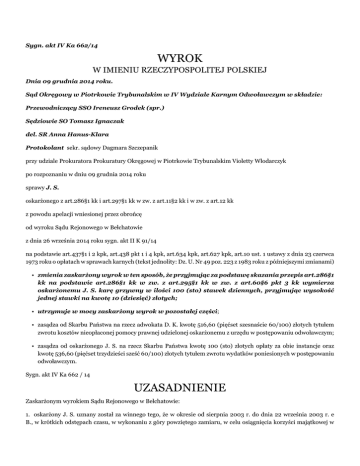 Sygn. akt IV Ka 662/14 WYROK W IMIENIU RZECZYPOSPOLITEJ POLSKIEJ Dnia 09 grudnia 2014 roku. Sąd Okręgowy w Piotrkowie Trybunalskim w IV Wydziale Karnym Odwoławczym w składzie: Przewodniczący SSO Ireneusz Grodek (spr.) Sędziowie SO Tomasz Ignaczak del. SR Anna Hanus-Klara Protokolant sekr. sądowy Dagmara Szczepanik przy udziale Prokuratora Prokuratury Okręgowej w Piotrkowie Trybunalskim Violetty Włodarczyk po rozpoznaniu w dniu 09 grudnia 2014 roku sprawy J. S. oskarżonego z art.286§1 kk i art.297§1 kk w zw. z art.11§2 kk i w zw. z art.12 kk z powodu apelacji wniesionej przez obrońcę od wyroku Sądu Rejonowego w Bełchatowie z dnia 26 września 2014 roku sygn. akt II K 91/14 na podstawie art.437§1 i 2 kpk, art.438 pkt 1 i 4 kpk, art.634 kpk, art.627 kpk, art.10 ust. 1 ustawy z dnia 23 czerwca 1973 roku o opłatach w sprawach karnych (tekst jednolity: Dz. U. Nr 49 poz. 223 z 1983 roku z późniejszymi zmianami) • zmienia zaskarżony wyrok w ten sposób, że przyjmując za podstawę skazania przepis art.286§1 kk na podstawie art.286§1 kk w zw. z art.295§1 kk w zw. z art.60§6 pkt 3 kk wymierza oskarżonemu J. S. karę grzywny w ilości 100 (sto) stawek dziennych, przyjmując wysokość jednej stawki na kwotę 10 (dziesięć) złotych; • utrzymuje w mocy zaskarżony wyrok w pozostałej części; • zasądza od Skarbu Państwa na rzecz adwokata D. K. kwotę 516,60 (pięćset szesnaście 60/100) złotych tytułem zwrotu kosztów nieopłaconej pomocy prawnej udzielonej oskarżonemu z urzędu w postępowaniu odwoławczym; • zasądza od oskarżonego J. S. na rzecz Skarbu Państwa kwotę 100 (sto) złotych opłaty za obie instancje oraz kwotę 536,60 (pięćset trzydzieści sześć 60/100) złotych tytułem zwrotu wydatków poniesionych w postępowaniu odwoławczym. Sygn. akt IV Ka 662 / 14 UZASADNIENIE Zaskarżonym wyrokiem Sądu Rejonowego w Bełchatowie: 1. oskarżony J. S. uznany został za winnego tego, że w okresie od sierpnia 2003 r. do dnia 22 września 2003 r. e B., w krótkich odstępach czasu, w wykonaniu z góry powziętego zamiaru, w celu osiągnięcia korzyści majątkowej w postaci kredytu, wspólnie i w porozumieniu z inną osobą odpowiadającą w odrębnym postępowaniu, ubiegając się o przyznanie kredytu w kwocie 30390 złotych na zakup samochodu marki T. (...) późniejszy nr rej. (...), wprowadził w błąd pracowników (...) Banku S.A. Oddział w B. w ten sposób, że przedłożył stwierdzające nieprawdę dokumenty w postaci zawyżającej wartość będącego przedmiotem kredytowania pojazdu a stwierdzającej jego nabycie faktury VAT, komis nr 54 / 203 z dnia 19.09.2003 r. na kwotę 44000 złotych, w tym kredyt 29000 złotych i 15000 złotych gotówką, podczas gdy w rzeczywistości J. S. nabył przedmiotowy samochód w (...) B. D. w dniu 18.09.2003 r., przy czym doprowadził niekorzystny Bank do niekorzystnego rozporządzenia mieniem, przy czym oskarżony przed wszczęciem wobec niego postępowania karnego zaspokoił roszczenie pokrzywdzonego, tj. czynu z art. 286 § l kk i 297 § 1 kk w zw. z art. 11 § l kk i w zw. z art. 12 kk i za tak przypisany czyn na podstawie art. 286 § 1 kk w zw. z art. 11 § 3 kk i art. 33 § 2 kk i wymierzył mu karę 7 miesięcy pozbawienia wolności i 50 stawek dziennych grzywny, ustalając wysokość jednej stawki dziennej grzywny na kwotę 10 złotych; 2. na podstawie art. 69 § 1 i § 2 kk w zw. z art. 70 § 1 pkt 1 kk warunkowo zawiesił oskarżonemu wykonanie orzeczonej kary pozbawienia wolności na okres próby 2 lat; 3. zasądził od Skarbu Państwa na rzecz adwokat D. K. kwotę 2927,96 złotych tytułem zwrotu kosztów nieopłaconej pomocy prawnej udzielonej oskarżonemu z urzędu; 4. zwolnił oskarżonego od kosztów procesu ponad kwotę 90 złotych. Apelację od powyższego wyroku wniósł obrońca oskarżonego, podnosząc zarzuty: I. błędu w ustaleniach faktycznych przyjętych za podstawę wyroku, polegającego na uznaniu za niewiarygodne wyjaśnień oskarżonego oraz przyjęciu, że oskarżony swoim zachowaniem wypełnił znamiona czynu z art. 286 1 kk w sytuacji, gdy zgromadzony materiał dowodowy nie pozwalał na przypisanie oskarżonemu działania w zamiarze doprowadzenia banku do niekorzystnego rozporządzenia mieniem, jak również działania w celu osiągnięcia korzyści majątkowej: II. obrazę przepisów postępowania, tj. art. 5 § 2 kpk oraz art. 7 kpk poprzez rozstrzygnięcie na niekorzyść oskarżonego nie dających się usunąć wątpliwości co do przebiegu zdarzenia, dotyczących okoliczności związanych ze złożeniem wniosku kredytowego oraz osób składających dokumenty, jak również dokonanie oceny materiału dowodowego w sposób dowolny. W konkluzji skarżący wniósł zmianę zaskarżonego wyroku poprzez uniewinnienie oskarżonego od jego popełnienia przypisanego mu czynu, względnie o jego uchylenie i przekazanie sprawy Sądowi I instancji do ponownego rozpoznania. Sąd Okręgowy zważył, co następuje: Podniesione w apelacji zarzuty zmierzały do wykazania niezasadnego ( zdaniem skarżącego ) przypisania J. S. przedmiotowych i podmiotowych znamion występku oszustwa z art. 286 § 1 kk, albowiem po jego stronie nie było nigdy zamiaru osiągnięcia korzyści majątkowej oraz doprowadzenia pokrzywdzonego banku do niekorzystnego rozporządzenia mieniem. Zamierzał bowiem wywiązać się z wszystkich przyjętych na siebie zobowiązań kredytowych, a nie był świadom, że R. K., działający bez jego wiedzy i zgody, przedłożył w banku dokumenty w postaci podrobionego wniosku o kredyt oraz faktury VAT, które przedstawiały nieprawdę co do okoliczności nabycia samochodu będącego przedmiotem kredytowania, min. poprzez zawyżenie jego wartości. W związku z powyższym skarżący uważał, iż także ustalenia o wspólnym oraz opartym na porozumieniu działaniu tych osób nie były usprawiedliwione. Skarżący na potwierdzenie powyższego powoływał się na opinie graf