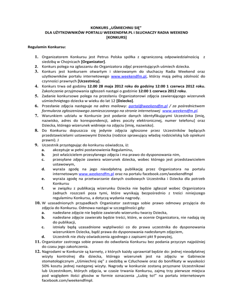 KONKURS „UŚMIECHNIJ SIĘ” DLA UŻYTKOWNIKÓW PORTALU WEEKENDFM.PL i SŁUCHACZY RADIA WEEKEND [KONKURS] Regulamin Konkursu: 1. Organizatorem Konkursu jest Petrus Polska spółka z ograniczoną odpowiedzialnością z siedzibą w Chojnicach [Organizator]. 2. Konkurs polega na zgłaszaniu do Organizatora zdjęć prezentujących uśmiech dziecka. 3. Konkurs jest konkursem otwartym i skierowanym do słuchaczy Radia Weekend oraz użytkowników portalu internetowego www.weekendfm.pl, którzy mają pełną zdolność do czynności prawnych [Uczestnicy]. 4. Konkurs trwa od godziny 12.00 28 maja 2012 roku do godziny 12:00 1 czerwca 2012 roku. Zakończenie przyjmowania zgłoszeń nastąpi o godzinie 12:00 1 czerwca 2012 roku. 5. Zadanie konkursowe polega na przesłaniu Organizatorowi zdjęcia zawierającego wizerunek uśmiechniętego dziecka w wieku do lat 12 [Dziecko]. 6. Przesłanie zdjęcia następuje na adres mailowy: [email protected] / za pośrednictwem formularza zgłoszeniowego zamieszczonego na stronie internetowej www.weekendfm.pl. 7. Warunkiem udziału w Konkursie jest podanie danych identyfikującymi Uczestnika [imię, nazwisko, adres do korespondencji, adres poczty elektronicznej, numer telefonu] oraz Dziecka, którego wizerunek widnieje na zdjęciu [imię, nazwisko]. 8. Do Konkursu dopuszcza się jedynie zdjęcia zgłoszone przez Uczestników będących przedstawicielami ustawowymi Dziecka (rodzice sprawujący władzę rodzicielską lub opiekuni prawni). J 9. Uczestnik przystępując do konkursu oświadcza, iż: a. akceptuje w pełni postanowienia Regulaminu, b. jest właścicielem przesyłanego zdjęcia i ma prawo do dysponowania nim, c. przesyłane zdjęcie zawiera wizerunek dziecka, wobec którego jest przedstawicielem ustawowym, d. wyraża zgodę na jego nieodpłatną publikację przez Organizatora na portalu internetowym www.weekendfm.pl oraz na portalu facebook.com/weekendfmpl e. wyraża zgodę na przetwarzanie danych osobowych Uczestnika i Dziecka dla potrzeb Konkursu f. w związku z publikacją wizerunku Dziecka nie będzie zgłaszał wobec Organizatora żadnych roszczeń poza tymi, które wynikają bezpośrednio z treści niniejszego regulaminu Konkursu, a dotyczą wydania nagrody. 10. W uzasadnionych przypadkach Organizator zastrzega sobie prawo odmowy przyjęcia do zdjęcia do Konkursu. Odmowa nastąpi w szczególności gdy: a. nadesłane zdjęcie nie będzie zawierało wizerunku twarzy Dziecka, b. nadesłane zdjęcie zawierało będzie treści, które, w ocenie Organizatora, nie nadają się do publikacji, c. istniały będą uzasadnione wątpliwości co do prawa uczestnika do dysponowania wizerunkiem Dziecka, bądź prawa do dysponowania nadesłanym zdjęciem, d. Uczestnik nie złoży oświadczenia zgodnego z zapisami pkt 9 powyżej, 11. Organizator zastrzega sobie prawo do odwołania Konkursu bez podania przyczyn najpóźniej do czasu jego zakończenia. 12. Nagrodami w Konkursie są karnety, z których każdy uprawniał będzie do: jednej nieodpłatnej wizyty kontrolnej dla dziecka, którego wizerunek jest na zdjęciu w Gabinecie stomatologicznym „Uśmiechnij się” z siedzibą w Człuchowie oraz do bonifikaty w wysokości 50% kosztu jednej następnej wizyty. Nagrody w konkursie zostaną przyznane Uczestnikowi lub Uczestnikom, których zdjęcia, w czasie trwania Konkursu, zajmą trzy pierwsze miejsca pod względem ilości głosów w formie oznaczenia „Lubię to!” na portalu internetowym facebook.com/weekendfmpl. 13. W konkursie przewiduje się nie więcej niż 3 nagrody. W sytuacji gdy to samo zdjęcie zostanie zgłoszone przez więcej niż jednego Uczestnika, nagroda przyznana zostanie wyłącznie Uczestnikowi, który zgłosił zdjęcie jako pierwszy. 14. Ogłoszenie wyników nastąpi najpóźniej w dniu 2 czerwca 2012 r. O wynikach Konkursu Organizator poinformuje uczestników poprzez zamieszczenie na portalu internetowym www.weekendfm.pl informacji zawierającej zwycięskie zdjęcia oraz imiona i nazwiska zwycięzców. 15. Wydanie nagród nastąpi w miejscu i czasie ustalonym przez Organizatora, przy czym Organizator zastrzega sobie prawo powstrzymania się z wydaniem nagród do czasu uregulowania przez każdego z jego członków wszelkich formalności związanych z odbiorem nagrody. 16. Organizator nie ponosi jakiejkolwiek odpowiedzialności za jakoś usług świadczonych przez Gabinet stomatologiczny „Uśmiechnij się” będących nagrodą w Konkursie, w szczególności zaś za ich zakres, jakość, wysokość odpłatności oraz ewentualne szkody wynikłe w związku z ich świadczeniem. W imieniu Organizatora: Małgorzata Kościelniak Redaktor Naczelny Radia Weekend