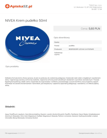 TAALO sp. z o.o. Ul. Wolności 10, 87-200 Wąbrzeźno 56 687 12 94 NIVEA Krem pudełko 50ml Cena: 5,65 PLN Opis słownikowy Dawka - Postać pudełko Producent BEIERSDORF-LECHIA S.A.POZNAŃ Substancja czynna - Opis produktu Delikatna formuła kremu Nivea sprawia, że jest on polecany do codziennej pielęgnacji. Doskonale radzi sobie z dogłębnym nawilżeniem skóry i regeneracją warstwy ochronnej naskórka. Zapewnia ochronę przed szkodliwym działaniem czynników zewnętrznych. Posiada łagodną konsystencję, dzięki czemu wspaniale się rozprowadza i wchłania, pozostawiając uczucie komfortu oraz przyjemny zapach. Kosmetyk nie zawiera konserwantów i barwników, jest bezpieczny i zapewnia optymalną pielęgnację i nawilżenie, a w efekcie piękną skórę. Składniki: Aqua, Paraffinum Liquidum, Cera Microcristallina, Glycerin, Lanolin Alcohol (Eucerit), Paraffin, Panthenol, Decyl Oleate, Octyldodecanol, Aluminum Stearates, Citric Acid, Magnesium Sulfate, Magnesium Stearate, Parfum, Limonene, Geraniol, Hydroxycitronellal, Linalool, Citronellol, Benzyl Benzoate, Cinnamyl Alcohol Plik wygenerowano: 03-03-2017 Powered by TCPDF (www.tcpdf.org) Oprogramowanie sklepu: AptusShop