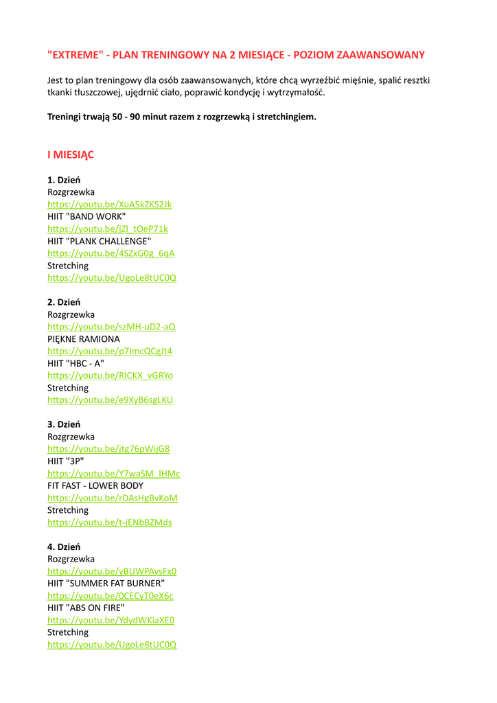 "EXTREME" - PLAN TRENINGOWY NA 2 MIESIĄCE - POZIOM ZAAWANSOWANY Jest to plan treningowy dla osób zaawansowanych, które chcą wyrzeźbić mięśnie, spalić resztki tkanki tłuszczowej, ujędrnić ciało, poprawić kondycję i wytrzymałość. Treningi trwają 50 - 90 minut razem z rozgrzewką i stretchingiem. I MIESIĄC 1. Dzień Rozgrzewka https://youtu.be/XuA5kZKS2Jk HIIT "BAND WORK" https://youtu.be/jZl_tOeP71k HIIT "PLANK CHALLENGE" https://youtu.be/4SZxG0g_6qA Stretching https://youtu.be/UgoLe8tUC0Q 2. Dzień Rozgrzewka https://youtu.be/szMH-uD2-aQ PIĘKNE RAMIONA https://youtu.be/p7ImcQCgJt4 HIIT "HBC - A" https://youtu.be/RICKX_vGRYo Stretching https://youtu.be/e9XyB6sgLKU 3. Dzień Rozgrzewka https://youtu.be/jtg76pWijG8 HIIT "3P" https://youtu.be/Y7waSM_lHMc FIT FAST - LOWER BODY https://youtu.be/rDAsHgBvKoM Stretching https://youtu.be/t-jENbBZMds 4. Dzień Rozgrzewka https://youtu.be/yBUWPAvsFx0 HIIT "SUMMER FAT BURNER" https://youtu.be/0CECyT0eX6c HIIT "ABS ON FIRE" https://youtu.be/YdydWKiaXE0 Stretching https://youtu.be/UgoLe8tUC0Q 5. Dzień Rozgrzewka https://youtu.be/XuA5kZKS2Jk HIIT "SIŁA" https://youtu.be/Fjg_katqi3o WEWNĘTRZNA STRONA UD https://youtu.be/dOwT1OsLpD8 Stretching https://youtu.be/t-jENbBZMds 6. Dzień Rozgrzewka https://youtu.be/mxKr-ub5ijQ CROSSFIT WOD 8 https://youtu.be/JSMMugJxxjs HIIT "BUTT PUSH-UP" https://youtu.be/JvcgnOnupa4 Stretching https://youtu.be/e9XyB6sgLKU 7. Dzień WOLNE II MIESIĄC 1. Dzień Rozgrzewka https://youtu.be/jtg76pWijG8 HIIT "PUSH UP - CHALLENGE" https://youtu.be/81kl-oL43nk TRENING Z TALERZEM x 2 https://youtu.be/HqDmhXP-a-s HIIT "HBC - A" https://youtu.be/RICKX_vGRYo Stretching https://youtu.be/e9XyB6sgLKU 2. Dzień HIIT "BTTP" - bez stretchingu na koniec https://youtu.be/7heQU63_H8k HIIT "SMILE" https://youtu.be/9cHj3P5Fnrk Stretching https://youtu.be/UgoLe8tUC0Q 3. Dzień Rozgrzewka https://youtu.be/XuA5kZKS2Jk HIIT "DEAD OR ALIVE" https://youtu.be/dCatIjblyLA HIIT "3P" https://youtu.be/Y7waSM_lHMc Stretching https://youtu.be/t-jENbBZMds 4. Dzień HIIT "FAST AND FURIOUS" https://youtu.be/4whelVgUR7A PROGRAM "PERFECT BUTT" https://youtu.be/Pvf4zxY9WCU Stretching https://youtu.be/UgoLe8tUC0Q 5. Dzień Rozgrzewka https://youtu.be/szMH-uD2-aQ HIIT "SIŁA" https://youtu.be/Fjg_katqi3o HIIT "10 STEPS" https://youtu.be/IzmjqvXDHoM Stretching https://youtu.be/e9XyB6sgLKU 6. Dzień Rozgrzewka https://youtu.be/mxKr-ub5ijQ HIIT "ABS STYLE" https://youtu.be/zTb6H9zIpIU WEWNĘTRZNA STRONA UD https://youtu.be/dOwT1OsLpD8 HIIT "ANIMALS" https://youtu.be/INMv7ESJomE Stretching https://youtu.be/UgoLe8tUC0Q 7. Dzień WOLNE Przeczytaj koniecznie: 10 TRENINGOWYCH ZASAD DLA DOBREGO SAMOPOCZUCIA: - Trenuj w butach sportowych - Nie dokładaj nic do planu, jest on kompletny - Zawsze ćwicz swoim tempem, nie moim - Najważniejsza podczas treningu jest technika, to dzięki niej nie ulegniesz kontuzji i osiągniesz upragniony efekt - Programy nie są łatwe i takie mają być. To trudne zestawy dla osób zaawansowanych. NIE MUSISZ ich zrobić w 100%, ale masz dać z siebie 100% - Dieta stanowi 70% sukcesu - Do treningu przystąp po konsultacji z Twoim lekarzem - Jeśli źle się czujesz przerwij trening - Nie narażaj się na maksymalne zmęczenie, odpoczynek też jest elementem treningu - Dla kobiet: w trakcie cyklu menstruacyjnego wysiłek nie jest wskazany, unikaj też ćwiczeń na mięśnie brzucha i okolicę miednicy MIŁEGO TRENINGU!