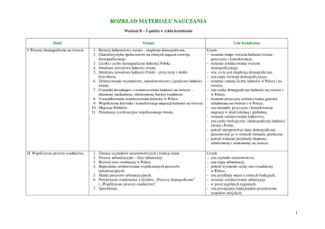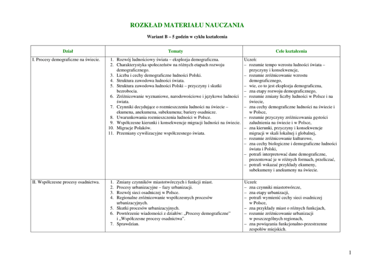 ROZKŁAD MATERIAŁU NAUCZANIA Wariant B – 5 godzin w cyklu kształcenia Dział I. Procesy demograficzne na świecie. II. Współczesne procesy osadnictwa. Tematy Cele kształcenia 1. Rozwój ludnościowy świata – eksplozja demograficzna. 2. Charakterystyka społeczeństw na różnych etapach rozwoju demograficznego. 3. Liczba i cechy demograficzne ludności Polski. 4. Struktura zawodowa ludności świata. 5. Struktura zawodowa ludności Polski – przyczyny i skutki bezrobocia. 6. Zróżnicowanie wyznaniowe, narodowościowe i językowe ludności świata. 7. Czynniki decydujące o rozmieszczeniu ludności na świecie – ekumena, anekumena, subekumena; bariery osadnicze. 8. Uwarunkowania rozmieszczenia ludności w Polsce. 9. Współczesne kierunki i konsekwencje migracji ludności na świecie. 10. Migracje Polaków. 11. Przemiany cywilizacyjne współczesnego świata. Uczeń: – rozumie tempo wzrostu ludności świata – przyczyny i konsekwencje, – rozumie zróżnicowanie wzrostu demograficznego, – wie, co to jest eksplozja demograficzna, – zna etapy rozwoju demograficznego, – rozumie zmiany liczby ludności w Polsce i na świecie, – zna cechy demograficzne ludności na świecie i w Polsce, – rozumie przyczyny zróżnicowania gęstości zaludnienia na świecie i w Polsce, – zna kierunki, przyczyny i konsekwencje migracji w skali lokalnej i globalnej, – rozumie zróżnicowanie kulturowe, – zna cechy biologiczne i demograficzne ludności świata i Polski, – potrafi interpretować dane demograficzne, prezentować je w różnych formach, przeliczać, – potrafi wskazać przykłady ekumeny, subekumeny i anekumeny na świecie. 1. 2. 3. 4. Zmiany czynników miastotwórczych i funkcji miast. Procesy urbanizacyjne – fazy urbanizacji. Rozwój sieci osadniczej w Polsce. Regionalne zróżnicowanie współczesnych procesów urbanizacyjnych. 5. Skutki procesów urbanizacyjnych. 6. Powtórzenie wiadomości z działów: „Procesy demograficzne” i „Współczesne procesy osadnictwa”. 7. Sprawdzian. Uczeń: – zna czynniki miastotwórcze, – zna etapy urbanizacji, – potrafi wymienić cechy sieci osadniczej w Polsce, – zna przykłady miast o różnych funkcjach, – rozumie zróżnicowanie urbanizacji w poszczególnych regionach, – zna powiązania funkcjonalno-przestrzenne zespołów miejskich. 1 III. Światowe problemy żywnościowe. IV. Produkcja energii i kierunki rozwoju przemysłu. 1. Zróżnicowanie rolnictwa na świecie – rolnictwo towarowe i samozaopatrzeniowe. 2. Czynniki rozwoju rolnictwa na świecie. 3. Czynniki rozwoju rolnictwa w Polsce. 4. Typy gospodarki rolnej na świecie. 5. Warunki i obszary upraw roślin na świecie. 6. Warunki upraw roślin w Polsce. 7. Hodowla zwierząt gospodarskich na świecie. 8. Hodowla zwierząt gospodarskich w Polsce. 9. Obszar nadwyżek i niedoborów żywności na świecie. Przyczyny głodu. 10. Sposoby zwiększania produkcji żywności – przeciwdziałanie zjawisku głodu. 11. Polskie rolnictwo w drodze do Unii Europejskiej. 12. Powtórzenie wiadomości z działu: „Światowe problemy żywnościowe”. 13. Sprawdzian. 1. 2. 3. 4. 5. 6. 7. 8. 9. 10. 11. 12. 13. Zmiany w bilansie energetycznym świata. Produkcja energii na świecie – surowce energetyczne. Produkcja energii w Polsce na tle bazy surowcowej. Energetyka alternatywna. Przemysł – jego podział i rola w gospodarce. Tradycyjne i nowoczesne gałęzie przemysłu. Regionalne zróżnicowanie procesów uprzemysłowienia. Czynniki lokalizacji przemysłu. Główne regiony przemysłowe świata – struktura gałęziowa. Technopolie na świecie. Okręgi przemysłowe Polski. Współczesne przemiany polskiego przemysłu. Powtórzenie wiadomości z działu: „Produkcja energii i kierunki rozwoju przemysłu”. Sprawdzian. Uczeń: – zna przyrodnicze i pozaprzyrodnicze czynniki rozwoju rolnictwa Polski i świata – wpływ czynników na rozmieszczenie produkcji rolnej w różnych częściach świata, – rozumie wpływ czynników na poziom rozwoju gospodarki rolnej, – rozumie przemiany rolnictwa w Polsce pod koniec XX i na początku XXI wieku, – potrafi wymienić cechy i problemy gospodarki rolnej w KWR i KSR, – zna cechy rolnictwa w określonym regionie świata, – rozumie problem głodu jawnego i utajonego – przyczyny i metody walki z głodem, – rozumie związek między warunkami środowiska naturalnego, poziomem rozwoju gospodarczego a poziomem wyżywienia ludności świata. Uczeń: – zna główne regiony eksploatacji surowców energetycznych na świecie i w Polsce – konsekwencje nierównomiernego rozmieszczenia surowców energetycznych, – potrafi scharakteryzować energetykę Polski na tle bazy surowcowej, – rozumie rolę energii w rozwoju gospodarczym, – zna przyczyny zmian w bilansie energetycznym świata, – zna poziom wykorzystania energetyki alternatywnej w poszczególnych częściach świata, – rozumie rolę przemysłu w rozwoju gospodarczym państw, – potrafi wymienić czynniki lokalizacji przemysłu oraz określić rozmieszczenie uprzemysłowionych regionów świata i Polski – ośrodki, okręgi przemysłowe świata i Polski; technopolie na świecie i obszary zalążkowe technopolii w Polsce, – zna zmiany w strukturze gałęziowej przemysłu Polski i świata – problem restrukturyzacji 2 przemysłu Polski, – potrafi interpretować dane statystyczne, prezentować je w różnych formach, przeliczać. V. Usługi i komunikacja. 1. 2. 3. 4. 5. 6. 7. 8. 9. Usługi a poziom rozwoju gospodarczego świata. Turystyka na świecie. Infrastruktura turystyczna w Polsce. Regiony turystyczne kraju. Poziom rozwoju usług w Polsce. Transport lądowy na świecie. Transport lotniczy i wodny na świecie. Główne szlaki i węzły transportowe na świecie. Nowoczesne systemy i środki łączności. Komunikacja w Polsce. VI. Obrót międzynarodowy. 1. 2. 3. 4. VII. Zróżnicowanie poziomu rozwoju gospodarczego państw świata. 1. Mierniki pozi