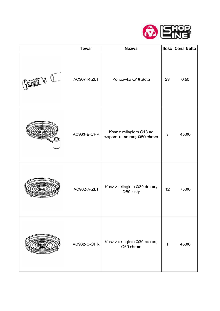 Ilość Cena Netto Towar Nazwa AC307-R-ZLT Końcówka Q16 złota 23 0,50 AC963-E-CHR Kosz z relingiem Q18 na wsporniku na rurę Q50 chrom 3 45,00 AC962-A-ZLT Kosz z relingiem Q30 do rury Q50 złoty 12 75,00 AC962-C-CHR Kosz z relingiem Q30 na rurę Q60 chrom 1 45,00 AC963-C-CHR Kosz z relingiem Q30 na wsporniku na rurę Q60 chrom 7 25,00 AC962-D-CHR Kosz z relingiem Q45 na rurę Q60 chrom 1 25,00 AC328-R-CHR Kubek podwójny chrom 31 26,00 AC329-R-CHR Kubek potrójny chrom 3 36,00 AC303-R-ZLT Narożnik Q 16 135° złoty 2 5,40 AC320-R-CHR Półka do przepisów kulinarnych H=35 36 4,00 AC967-A-ZLT Półka drewniana z relingiem Q30 do rury Q50 złota 7 45,00 AC967-A-CHR Półka drewniana z relingiem Q30 na rurę Q50 chrom 2 45,00 AC967-C-CHR Półka drewniana z relingiem Q30 na rurę Q60 chrom 29 17,00 AC968-A-ZLT Półka drewniana z relingiem Q30 na wsponiku do rury Q50 złota 3 82,00 Półka drewniana z relingiem AC968-A-CHR Q30 na wsporniku do rury Q50 chrom 5 68,00 Półka drewniana z relingiem AC968-C-CHR Q30 na wsporniku do rury Q60 chrom 23 25,00 AC967-B-ZLT Półka drewniana z relingiem Q45 do rury Q50 złota 4 82,00 AC967-B-CHR Półka drewniana z relingiem Q45 na rurę Q50 chrom 10 82,00 AC967-D-CHR Półka drewniana z relingiem Q45 na rurę Q60 chrom 6 82,00 AC320-B-CHR Półka na przepisy kulinarne H=30 1 4,00 AC320-R-SAT Półka na przepisy kulinarne satyna 12 39,00 AC320-0-ZLT Półka na przepisy kulinarne złota 5 39,00 AC321-C-CHR Półka narożna chrom 31 12,00 AC321-0-ZLT Półka narożna złota 15 43,00 AC314-R-CHR Półka podwójna chrom 19 18,00 AC318-R-CHR Półka podwójna do przypraw chrom 9 18,00 AC318-0-ZLT Półka podwójna na przyprawy złota 5 18,00 AC312-R-CHR Półka pojedyncza chrom 23 11,20 AC312-0-SAT Półka pojedyncza H=35 32 15,00 AC312-0-ZLT Półka pojedyncza H=35 złota 16 35,00 AC965-A-ZLT Półka szklana z relingiem Q30 do rury Q50 złota 4 62,00 AC965-C-CHR Półka szklana z relingiem Q30 na rurę Q30 chrom 10 62,00 AC966-C-CHR Półka szklana z relingiem Q30 na wsporniku do rury Q60 chrom 5 62,00 AC965-0-SAT Półka szklana z relingiem Q35 do rury Q50 satyna 1 62,00 AC966-A-ZLT Półka szklana z relingiem Q35 na wsporniku do rury Q50 złota 1 62,00 AC965-D-CHR Półka szklana z relingiem Q45 na rurę Q60 chrom 6 62,00 AC312-0-CHR Półka-zaczep długi H=35 chrom 13 14,00 AC966-R-CHR Reling szyby 300 20 100,00 AC323-R-CHR Stojak do butelek 2 15,20 AC305-R-ZLT Uchwyt dystansowy z wkrętem Q16 złoty 179 6,00 AC970-0-SAT Wieszak do kieliszków Q50 satyna 17 25,00 AC970-A-CHR Wieszak do kieliszków Q60 chrom 9 43,00 AC960-0-CHR Wieszak pojedyńczy Q50 chrom 5 11,00 AC960-A-CHR Wieszak pojedyńczy Q60 chrom 2 29,00 AC961-A-CHR Wieszak potrójny Q60 chrom 4 26,00 AC301-0-ZLT Zaślepka płaska Q16 złoto 739 0,30