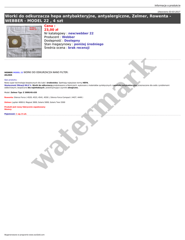 Informacje o produkcie Utworzono 03-03-2017 Worki do odkurzacza hepa antybakteryjne, antyalergiczne, Zelmer, Rowenta WEBBER - MODEL 22 , 4 szt Cena : 23,00 zł WEBBER MODEL 22 ZELMER er m ar k Nr katalogowy : new/webber 22 Producent : Webber Dostępność : Dostępny Stan magazynowy : poniżej średniego Średnia ocena : brak recenzji WORKI DO ODKURZACZA NANO FILTER: Opis produktu: Nowa super technologia bezpiecznych dla ludzi i środowiska. Spełniają najwyższe normy HEPA. Skuteczność filtracji 99,9 %. Worki do odkurzaczy produkowane w Niemczech, wykonane z materiałów syntetycznych z powłoką antybakteryjną przeznaczone dla osób z problemami oddechowymi, bezpieczne dla najmłodszych, powstrzymujące czynniki alergiczne. Model: Zelmer Typ: Z 3000/49.420 Rowenta: Silence Force ( 4520, 4523, 4541, 4550 ), Silence Force Compact ( 4427, 4449 ) Zelmer: Jupiter 4000.0, Magnat 3000, Solaris 5000, Solaris Twix 5500 Produkt jest nowy fabrycznie zapakowany Niemcy w at Pojemność: 1 op./4 szt. Wygenerowano w programie www.oscGold.com