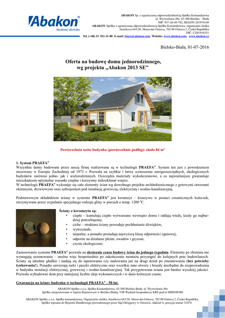 ABAKON Sp. z ograniczoną odpowiedzialnością Spółka Komandytowa ul. Wyzwolenia 49a, 43-300 Bielsko – Biała NIP: 937-26-49-782, REGON 241974149 ABAKON Spółka z ograniczoną odpowiedzialnością Spółka Komandytowa, organizačni složka Jurečkova 643/20, Moravskà Ostrava, 702 00 Ostrava 2, Česká Republika DIČ: CZ01916351 Tel. (+48) 33 811-11-88 E-mail: [email protected] Website: www.abakon.com www.abakon.cz Bielsko-Biała, 01-07-2016 Oferta na budowę domu jednorodzinnego, wg projektu „Abakon 2013 SE” Powierzchnia netto budynku (powierzchnia podłóg): około 84 m2 1. System PRAEFA® Wszystkie domy budowane przez naszą firmę realizowane są w technologii PRAEFA®. System ten jest z powodzeniem stosowany w Europie Zachodniej od 1973 r. Pozwala na szybkie i łatwe wznoszenie energooszczędnych, ekologicznych budynków zarówno jedno- jak i wielorodzinnych. Oszczędza materiały wykończeniowe, a co najważniejsze gwarantuje mieszkańcom optymalne warunki cieplne i korzystny mikroklimat wnętrz. W technologii PRAEFA® wykonuje się całe elementy ścian wg dowolnego projektu architektonicznego z gotowymi otworami okiennymi, drzwiowymi oraz uzbrojeniem pod instalację grzewczą, elektryczną i wodno-kanalizacyjną. Podstawowym składnikiem ściany w systemie PRAEFA® jest keramzyt – kruszywo w postaci ceramicznych kuleczek, otrzymywane przez wypalanie specjalnego rodzaju gliny w piecach o temp. 1200 0C. Ściany z keramzytu są; • ciepłe – kumulują ciepło wytwarzane wewnątrz domu i oddają wtedy, kiedy go najbardziej potrzebujemy, • ciche – struktura ściany powoduje pochłanianie dźwięków, • wytrzymałe, • niepalne, a ponadto posiadają najwyższą klasę odporności ogniowej, • odporne na działanie pleśni, owadów i gryzoni, • czyste ekologicznie. Zastosowanie systemu PRAEFA® pozwala na skrócenie czasu budowy ścian do jednego tygodnia. Elementy po złożeniu nie wymagają sezonowania – można więc bezpośrednio po zakończeniu montażu przystąpić do kolejnych prac budowlanych. Ściany są idealnie gładkie i nadają się do tapetowania czy malowania już na drugi dzień po zmontowaniu (bez potrzeby tynkowania!). Ponadto zawierają rurki i puszki elektryczne oraz wszelkie inne otwory i bruzdy niezbędne do rozprowadzenia w budynku instalacji elektrycznej, grzewczej i wodno-kanalizacyjnej. Tak przygotowana ściana jest bardzo wysokiej jakości. Pozwala wybudować dom przy mniejszej liczbie ekip wykonawczych i w dużo krótszym czasie. Gwarancja na ściany budynku w technologii PRAEFA® - 50 lat. ABAKON Spółka z o.o. Spółka Komandytowa, 43-300 Bielsko-Biała, ul. Wyzwolenia 49a Spółka zarejestrowana w Sądzie Rejonowym w Bielsku-Białej, VIII Wydział Gospodarczy KRS pod nr 0000388586 ABAKON Spółka z o.o. Spółka komandytowa, Organizačni složka, Jurečkova 643/20, Moravskà Ostrava, 702 00 Ostrava 2, Česká Republika, Spółka wpisana do Rejestru Handlowego prowadzonego przez Sąd Okręgowy w Ostrawie, oddział A, pozycja numer 21074 ABAKON Sp. z ograniczoną odpowiedzialnością Spółka Komandytowa ul. Wyzwolenia 49a, 43-300 Bielsko – Biała NIP: 937-26-49-782, REGON 241974149 ABAKON Spółka z ograniczoną odpowiedzialnością Spółka Komandytowa, organizačni složka Jurečkova 643/20, Moravskà Ostrava, 702 00 Ostrava 2, Česká Republika DIČ: CZ01916351 Tel. (+48) 33 811-11-88 E-mail: [email protected] Website: www.abakon.com www.abakon.cz PRAEFA® ZOSTAŁA NAGRODZONA ZŁOTYM MEDALEM ZA SYSTEM BUDOWY Z ELEMENTÓW KERAMZYTOWYCH NA MIĘDZYNARODOWYCH TARGACH BUDOWLANYCH W POZNANIU BUDMA 2003! PRAEFA® OTRZYMAŁA CERTYFIKAT JAKOŚCI ISO:9001 ISO 9001:2000 Podsumowując: Z bardzo bogatej oferty technologii budowlanych dostępnych na rynku wybraliśmy i stosujemy te, które pozwalają na szybkie budowanie ciepłych (ściany zapewniają bardzo dobrą izolacyjność termiczną budynku U=0,244 W/m2K), wygodnych i niedrogich zarówno w budowie, jak i utrzymaniu domów. Przywiązujemy szczególną uwagę zarówno do jakości wykonania i terminowości, jak i do szczegółów wykończeniowych np. stosujemy drewnianą podbitkę barwioną na kolor harmonizujący z kolorystyką elewacji budynku i dachu. Staramy się również, aby plac budowy nie wyglądał jak pole bitwy po kolejnych ekipach budowlanych. ABAKON Spółka z o.o. Spółka Komandytowa, 43-300 Bielsko-Biała, ul. Wyzwolenia 49a Spółka zarejestrowana w Sądzie Rejonowym w Bielsku-Białej, VIII Wydział Gospodarczy KRS pod nr 0000388586 ABAKON Spółka z o.o. Spółka komandytowa, Organizačni složka, Jurečkova 643/20, Moravskà Ostrava, 702 00 Ostrava 2, Česká Republika, Spółka wpisana do Rejestru Handlowego prowadzonego przez Sąd Okręgowy w Ostrawie, oddział A, pozycja numer 21074 ABAKON Sp. z ograniczoną odpowiedzialnością Spółka Komandytowa ul. Wyzwolenia 49a, 43-300 Bielsko – Biała NIP: 937-26-49-782, REGON 241974149 ABAKON Spółka z ograniczoną odpowiedzialnością Spółka Komandytowa, organizačni složka Jurečkova 643/20, Moravskà Ostrava, 702 00 Ostrava 2, Česká Republika DIČ: CZ01916351 Tel. (+48) 33 811-11-88 E-mail: [email protected] Website: www.abakon.com www.abakon.cz 1. FUNDAMENT PŁYTOWY Zakres robót obejmuje: − geodezyjne wytyczenie budynku, − usunięcie warstwy nienośnej gruntu o grubości 25-30 cm, na odkład, − wykonanie podbudowy pod fundament zgodnie z przygotowanym wcześniej projektem i zagęszczenie jej ubijarką mechaniczną, − wykonanie przepustu wprowadzającego wodę do budynku, − wykonanie podziemnej części kanalizacji z wyprowadzeniem jej 1m poza obrys fundamentu, − ustawienie styropianowych elementów brzegowych, − izolacja pozioma ze styropianu MARBET Styrohart EPS-P 100-036 o gr. 5 cm, − izolacja pozioma z dwóch warstw styropianu EPS 100-038 gr. po 5 cm, − wykonanie czerpni do kominka, − ułożenie zbrojenia, − dostarczenie i wypełnienie płyty betonem C16/20 grubości 20 cm, − wykon
