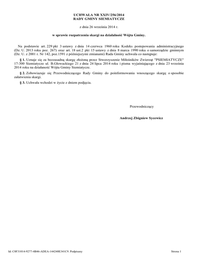 UCHWAŁA NR XXIV/256/2014 RADY GMINY SIEMIATYCZE z dnia 26 września 2014 r. w sprawie rozpatrzenia skargi na działalność Wójta Gminy. Na podstawie art. 229 pkt 3 ustawy z dnia 14 czerwca 1960 roku Kodeks postepowania administracyjnego (Dz. U. 2013 roku poz. 267) oraz art. 18 ust.2 pkt 15 ustawy z dnia 8 marca 1990 roku o samorządzie gminnym (Dz. U. z 2001 r. Nr 142, poz.1591 z późniejszymi zmianami) Rada Gminy uchwala co następuje: § 1. Uznaje się za bezzasadną skargę złożoną przez Stworzyszenie Miłośników Zwierząt "PSIEMIATYCZE" 17-300 Siemiatycze ul. B.Głowackiego 21 z dnia 24 lipca 2014 roku i pisma wyjaśniającego z dnia 23 września 2014 roku na działaność Wójta Gminy Siemiatycze. § 2. Zobowiazuje się Przewodniczącego Rady Gminy do poinformowania wnoszącego skargę o sposobie załatwienia skargi. § 3. Uchwała wchodzi w życie z dniem podjęcia. Przewodniczący Andrzej Zbigniew Sycewicz Id: C0F31014-9277-4B46-ADEA-144240E341C9. Podpisany Strona 1 Uzasadnienie Pismem z dnia 24 lipca 2014 roku Stwarzyszenie Miłośników Zwierząt "Psiemiatycze" z siedzibą w Siemiatyczach ul. B.Głowackiego 21 poinformiowało o rzekomych nieprawiadłowościach Wójta Gminy przy zawieraniu umowy z frmą CENTAUR F.W. - Marek Kulesza z siedzibą w Długa Szlachecka ul. Ks.Jerzego Popiełuszki 4. Stwarzyszenie zarzuca ,że w chwili podpisywania umowy Firma Pana Marka Kuleszy nie posiadała aktualnego zezwolenia na prowadzenie schroniska dla zwierząt. Umowa została zawarta pomiędzy Wójtem Gminy Siemiatycze a Firmą Centaur F.W.- Marka Kuleszy na podstawie dokumentów,które wskazywały gdzie będą przekazywane odławiane bezspańskie psy z terenu Gminy Siemiatycze. Porozumienie pomiędzy Firma Marka Kuleszy a Schroniskiem prowadzonym przez Stwarzyszenie Na Rzecz Niesienia Pomocy dla Bezdomnych Zwierzat "Templ" z siedzibą w Wasilkowie ul. Gajna 36. Umowa obowiązuje od 1 stycznia 2014 roku do 31 grudnia 2014 roku i zapisy w tej umowie zostały uzgodnione przez obydwie strony tej umowy. Nie można zarzucać,że niektóre zapisy tej umowy sa bezpodstawne. Nie jest to akt administracyjny lecz umowa cywilonoprawna zawarta przez podmioty posiadające do tego uprawnienia prawne. Wójt Gminy jako organ wykonawczy Gminy Siemiatycze z ustawy o samorządzie gminnym i ustawy o ochronie zwierząt a Pan Marek Kulesza jako przedsiębiorca. Należy nadmienić, że zadania wynikające z ustawy o ochronie zwierząt realizowane są rzetelnie i odpowiedzialnie. Odławiane bezpańskie psy przez Firmę Centaur Marka Kuleszy przekazywane są do schroniska prowadzonego przez Stowarzyszenie "Templ". Schronisko prowadzone przez firmę TEMPL prowadzi ciągłą działalność i posiada nadzór weterynaryjny w miejscu jego siedziby.Od dnia 18 września 2013 roku odłowiono 3 bezpańskie psy. Ponadto w dniu 23 września 2014 roku Stowarzyszenie Miłośników Zwierząt "Psiemiatycze" z siedzibą w Siemiatyczach prz ul. B.Głowackiego 21 złożyła informację wyjaśniającą w sprawie prowadzenia schroniska przez Stowarzyszenie Na rzecz Niesienia Pomocy Dla Bezdomnych Zwierząt "Templ" w Długiej Szlacheckiej. Faktycznie Stwarzyszenie "Templ" nie posiada siedziby w Długiej Szlacheckiej a zgodnie z posiadanymi dokumantami przejęło pod swoja administrację schronisko dla bezdomnych zwierzerząt pod adresem w Długiej Szlacheckiej. Administracyjnie Stwarzyszenie Na Rzecz Niesienia Pomocy Dla Bezdomnych Zwierząt podlega powiatowi białostockiemu. Analiza skargi wobec działań Wójta Gminy Siemiatycze pozwala przyjąc, że sformułowane zarzuty nie są zasadne. Id: C0F31014-9277-4B46-ADEA-144240E341C9. Podpisany Strona 1