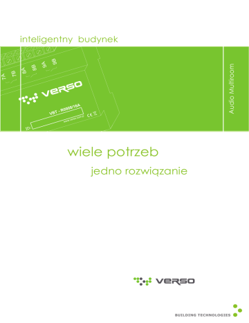 Audio Multiroom inteligentny budynek wiele potrzeb jedno rozwiązanie BUILDING TECHNOLOGIES KONCEPCJA SYSTEMU AUDIO MULTIROOM Pojedyncza (autonomiczna) strefa w systemie audio multiroom Antena radiowa Wzmacniacz strefowy LAN / Ethernet Moduł multiroom CD / DVD / BR Touch Screen 3,5” TV System automatyki VBT -2- BUILDING TECHNOLOGIES KONCEPCJA SYSTEMU AUDIO MULTIROOM Pojedyncza (autonomiczna) strefa z podziałem na dwie podstrefy SYSTEM AUDIO MULTIROOM — STREFA 1 PODSTREFA B PODSTREFA A Wzmacniacz strefowy Wzmacniacz strefowy Touch Screen 3,5” Touch Screen 3,5” Moduł multiroom System automatyki VBT -3- BUILDING TECHNOLOGIES KONCEPCJA SYSTEMU AUDIO MULTIROOM Wielostrefowy system audio multiroom - przykład 1 SYSTEM AUDIO MULTIROOM — STREFA 1 SYSTEM AUDIO MULTIROOM — STREFA 2 Wzmacniacz strefowy Wzmacniacz strefowy Moduł multiroom Moduł multiroom Touch Screen 3,5” Touch Screen 3,5” System automatyki VBT / Serwer BMS SYSTEM AUDIO MULTIROOM — STREFA 3 SYSTEM AUDIO MULTIROOM — STREFA 4 Wzmacniacz strefowy Wzmacniacz strefowy Moduł multiroom Touch Screen 12” Touch Screen 3,5” -4- BUILDING TECHNOLOGIES KONCEPCJA SYSTEMU AUDIO MULTIROOM Wielostrefowy system audio multiroom - przykład 2 SYSTEM AUDIO MULTIROOM — STREFA 1 SYSTEM AUDIO MULTIROOM — STREFA 2 Wzmacniacz strefowy Wzmacniacz strefowy Touch Screen 12” Touch Screen 12” Serwer BMS / System automatyki VBT SYSTEM AUDIO MULTIROOM — STREFA 3 SYSTEM AUDIO MULTIROOM — STREFA 4 Wzmacniacz strefowy Wzmacniacz strefowy Moduł multiroom Touch Screen 12” Touch Screen 3,5” -5- BUILDING TECHNOLOGIES KONCEPCJA SYSTEMU AUDIO MULTIROOM Integracja systemu audio multiroom z systemami VBT oraz BMS SYSTEM AUDIO MULTIROOM — STREFA 1 SYSTEM AUDIO MULTIROOM — STREFA 2 Wzmacniacz strefowy Wzmacniacz strefowy Moduł multiroom Moduł multiroom Touch Screen 3,5” Touch Screen 3,5” SYSTEM AUTOMATYKI VBT SYSTEM BMS Panel Sensorowy Touch Screen 12” Moduł VBT Touch Screen 12” Moduł logiczny Serwer BMS Moduł VBT Laptop / Komputer PC Moduł VBT PDA -6- BUILDING TECHNOLOGIES KONCEPCJA SYSTEMU AUDIO MULTIROOM Ogólne uwagi techniczne 1. W skład pojedynczej strefy w systemie audio multiroom wchodzą następujące podzespoły: Panel Touch Screen 3,5” Moduł multiroom (potocznie: moduł mp3), Wzmacniacz strefowy Głośniki 2. Możemy stworzyć dowolną liczbę autonomicznych stref muzycznych. W ramach każdej strefy możemy stworzyć max 5 podstref (podstrefy są wzajemnie zależne, tzn., wszystkie korzystają z tego samego źródła dźwięku, natomiast istnieje możliwość niezależnej regulacji natężenia dźwięku w każdej podstrefie). 3. System audio multiroom może funkcjonować zarówno autonomicznie jak i we współpracy z systemem automatyki inteligentnego budynku VBT. 4. W sytuacji gdy system audio multiroom podłączymy do systemu automatyki VBT zyskujemy możliwość sterowania funkcjami inteligentnego domu za pomocą panelu Touch Screen 3,5” i wzajemnie, za pomocą paneli sensorowych w systemie automatyki możemy sterować funkcjami systemu audio multiroom. 5. System audio multiroom obsługuje muzykę zapisaną w formacie MP3 oraz radio internetowe (stacje nadawane w formacie shoutcast), ponadto moduł multiroom wyposażono w odbiornik radiowy FM i dwa niezależne wejścia sygnału liniowego audio. 6. W celu wykorzystania funkcji radia internetowego należy podłączyć moduł multiroom do sieci internetowej. Korzystanie z wbudowanego radia FM, wymaga podłączenia do modułu multiroom anteny radiowej. 7. Moduł multiroom należy zamontować w rozdzielni automatyki. 8. Panele Touch Screen 3,5” należy podłączyć do modułu multiroom! Do jednego modułu multiroom można podłączyć max 5 paneli sterujących (TouchScreen 3,5 lub Sensorowe). Panel TS3 łączymy z modułem multiroom za pomocą skrętki komputerowej (UTP lub FTP) w której wykorzystujemy wszystkie pary, dlatego zaleca się układanie po dwie skrętki do każdego panelu. 9. Wzmacniacz strefowy montujemy w pobliżu głośników sufitowych. Do jednego modułu multiroom można podłączyć max 5 wzmacniaczy strefowych. Wzmacniacze strefowe łączymy z modułem multiroom za pomocą skrętki komputerowej (UTP lub FTP), a maksymalna odległość pomiędzy modułem multiroom a wzmacniaczem może wnosić 50m. 10. Do każdego ze wzmacniaczy strefowych można podłączyć od 1 do 4 głośników. Wzmacniacze strefowe działają w standardzie stereo, dlatego też podłączenie 4 głośników polega na podłączeniu po 2 głośniki równolegle na jeden kanał. Głośniki podłączamy do wzmacniacza strefowego za pomocą standardowych przewodów głośnikowych. 11. Dodatkowe źródła dźwięku podłączamy do modułu multiroom przewodami audio dedykowanymi dla sygnału analogowego liniowego. -7- BUILDING TECHNOLOGIES