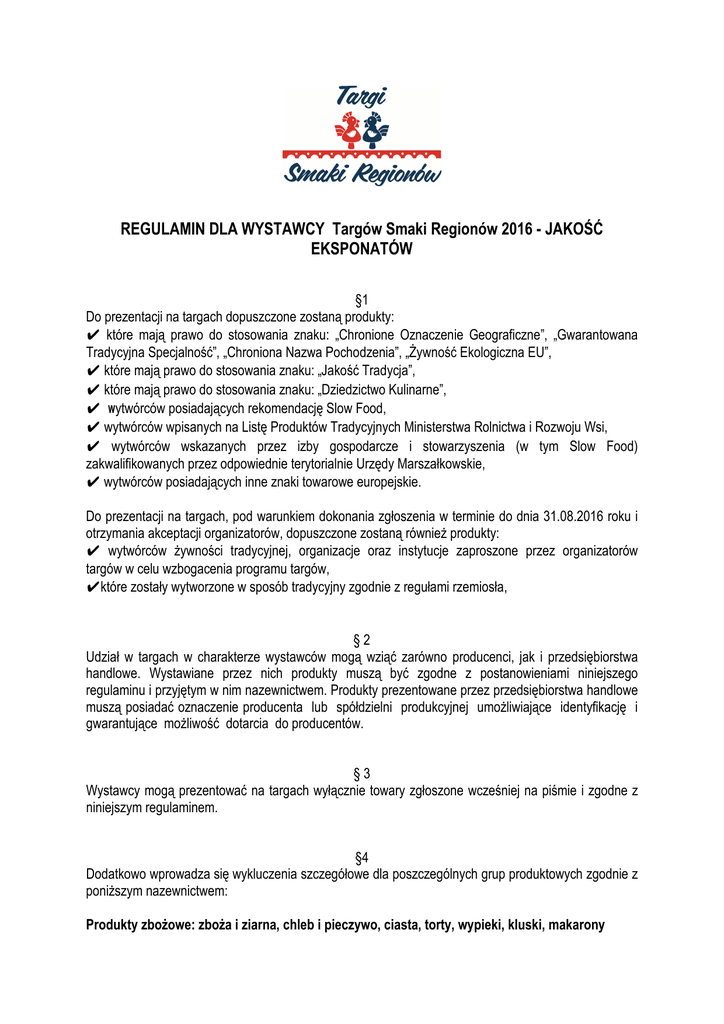 REGULAMIN DLA WYSTAWCY Targów Smaki Regionów 2016 - JAKOŚĆ EKSPONATÓW §1 Do prezentacji na targach dopuszczone zostaną produkty: ✔ które mają prawo do stosowania znaku: „Chronione Oznaczenie Geograficzne”, „Gwarantowana Tradycyjna Specjalność”, „Chroniona Nazwa Pochodzenia”, „Żywność Ekologiczna EU”, ✔ które mają prawo do stosowania znaku: „Jakość Tradycja”, ✔ które mają prawo do stosowania znaku: „Dziedzictwo Kulinarne”, ✔ wytwórców posiadających rekomendację Slow Food, ✔ wytwórców wpisanych na Listę Produktów Tradycyjnych Ministerstwa Rolnictwa i Rozwoju Wsi, ✔ wytwórców wskazanych przez izby gospodarcze i stowarzyszenia (w tym Slow Food) zakwalifikowanych przez odpowiednie terytorialnie Urzędy Marszałkowskie, ✔ wytwórców posiadających inne znaki towarowe europejskie. Do prezentacji na targach, pod warunkiem dokonania zgłoszenia w terminie do dnia 31.08.2016 roku i otrzymania akceptacji organizatorów, dopuszczone zostaną również produkty: ✔ wytwórców żywności tradycyjnej, organizacje oraz instytucje zaproszone przez organizatorów targów w celu wzbogacenia programu targów, ✔które zostały wytworzone w sposób tradycyjny zgodnie z regułami rzemiosła, §2 Udział w targach w charakterze wystawców mogą wziąć zarówno producenci, jak i przedsiębiorstwa handlowe. Wystawiane przez nich produkty muszą być zgodne z postanowieniami niniejszego regulaminu i przyjętym w nim nazewnictwem. Produkty prezentowane przez przedsiębiorstwa handlowe muszą posiadać oznaczenie producenta lub spółdzielni produkcyjnej umożliwiające identyfikację i gwarantujące możliwość dotarcia do producentów. §3 Wystawcy mogą prezentować na targach wyłącznie towary zgłoszone wcześniej na piśmie i zgodne z niniejszym regulaminem. §4 Dodatkowo wprowadza się wykluczenia szczegółowe dla poszczególnych grup produktowych zgodnie z poniższym nazewnictwem: Produkty zbożowe: zboża i ziarna, chleb i pieczywo, ciasta, torty, wypieki, kluski, makarony Nie dopuszcza się: ✘ gotowych mieszanek i dodatków chemicznych przyspieszających wypiek, regulujących puszystość ciasta, chrupkość skórki, a także środków konserwujących, zagęszczających i regulatorów wilgotności ciasta oraz syropu glukozowego. Dopuszcza się: tradycyjne środki wspomagające wzrost ciasta, takie jak: wodorowęglan sodu, węglan amonu, węglan potasu, drożdże. Produkty mięsne: mięso, kiełbasy, szynka, drób, dziczyzna Nie dopuszcza się wyrobów: ✘szynkopodobnych, ✘zawierających emulgatory, ✘poddawanych dojrzewaniu z użyciem glukono-delta-laktonu E 575, ✘wędzonych z użyciem roztworu wodnego dymu wędzarniczego, ✘ zawierających cukry syntetyczne (por. §1 niniejszego regulaminu), ✘ poddawanych dojrzewaniu w folii. Dopuszcza się: cytryniany i fosforany oraz saletrę potasową i sól peklującą w kiełbasach. Produkty rybne: ryby, owoce morza, delikatesowe wyroby rybne Nie dopuszcza się wyrobów: ✘poddawanych dojrzewaniu z użyciem glukono-delta-laktonu E 575, ✘wędzonych z użyciem roztworu wodnego dymu wędzarniczego, ✘zawierających środki zagęszczające (wymienione na liście dodatków do żywności). Dopuszcza się: kwas benzoesowy i askorbinowy w krabach i przetworach krabowych. Produkty mleczne: mleko, masło, jogurt, ser Nie dopuszcza się wyrobów: ✘imitujących produkty mleczne, ✘poddawanych dojrzewaniu w folii, ✘zawierających środki zagęszczające (wymienione na liście dodatków do żywności). Owoce i warzywa: owoce, warzywa, ziemniaki, nasiona roślin strączkowych, grzyby, trufle W przypadku tej grupy produktowej obowiązują ograniczenia z §1 niniejszego regulaminu; nie wprowadza się dodatkowych regulacji. Rośliny uprawne: rośliny, nasiona Nie dopuszcza się: ✘odmian hybrydowych F1 niezdolnych do samodzielnego rozmnażania. Słodycze: czekolada, konfitury, miód, lody, wyroby cukiernicze Nie dopuszcza się: ✘ miodów niewiadomego pochodzenia; na etykiecie musi być wyraźnie oznaczony pszczelarz – producent miodu, ✘ konfitur zawierających kwasek cytrynowy, askorbinowy i sorbinowy, ✘ lodów zawierających środki zagęszczające (wymienione na liście dodatków do żywności). Dopuszcza się: emulgator – lecytynę sojową (certyfikowaną) w czekoladzie, glukozę w landrynkach i pralinach; pektynę, gumę arabską, agar E406. Napoje: piwo, wino, wina musujące, szampan, wódka, napoje destylowane, likiery, wody, soki, lemoniady, kawa, herbata Nie dopuszcza się: ✘ dodatków w postaci stabilizatorów, konserwantów i innych środków przedłużających przydatność produktu do spożycia oraz ekstraktów chmielowych w piwie, ✘ ekstraktów aromatycznych w sokach. Wina: wyłącznie od winiarzy, którzy samodzielnie zajmują się pracami w winnicy i piwniczkach oraz sprzedażą wina Nie dopuszcza się win: ✘ z winnic o uzysku ponad 75 hl/ha, ✘ produkowanych z użyciem takich technologii, jak odparowywanie wody i ogrzewanie zacieru, ✘ aromatyzowanych wiórami drzewnymi, ✘ od winiarzy posiadających mniej niż 75% tradycyjnych lokalnych szczepów winorośli w swych uprawach, ✘ od winiarzy, którzy mniej niż 75% wina produkują na bazie własnych upraw. Dopuszcza się: sulfidy w winach. Produkty delikatesowe: produkty delikatesowe, specjały wegetariańskie, przyprawy, oleje, octy W przypadku tej grupy produktowej obowiązują ograniczenia z §1niniejszego regulaminu. Dopuszcza się: sulfidy w chrzanie. Gotowe potrawy: W przypadku gotowych potraw poszczególne ich składniki muszą spełniać wymagania obowiązujące dla poszczególnych grup produktowych.