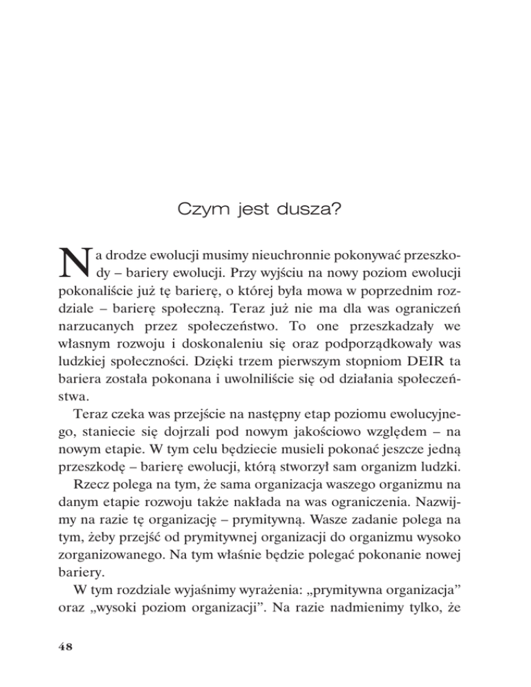 D OJRZAŁOŚĆ . DEIR IV Czym jest dusza? N a drodze ewolucji musimy nieuchronnie pokonywać przeszkody – bariery ewolucji. Przy wyjściu na nowy poziom ewolucji pokonaliście już tę barierę, o której była mowa w poprzednim rozdziale – barierę społeczną. Teraz już nie ma dla was ograniczeń narzucanych przez społeczeństwo. To one przeszkadzały we własnym rozwoju i doskonaleniu się oraz podporządkowały was ludzkiej społeczności. Dzięki trzem pierwszym stopniom DEIR ta bariera została pokonana i uwolniliście się od działania społeczeństwa. Teraz czeka was przejście na następny etap poziomu ewolucyjnego, staniecie się dojrzali pod nowym jakościowo względem – na nowym etapie. W tym celu będziecie musieli pokonać jeszcze jedną przeszkodę – barierę ewolucji, którą stworzył sam organizm ludzki. Rzecz polega na tym, że sama organizacja waszego organizmu na danym etapie rozwoju także nakłada na was ograniczenia. Nazwijmy na razie tę organizację – prymitywną. Wasze zadanie polega na tym, żeby przejść od prymitywnej organizacji do organizmu wysoko zorganizowanego. Na tym właśnie będzie polegać pokonanie nowej bariery. W tym rozdziale wyjaśnimy wyrażenia: „prymitywna organizacja” oraz „wysoki poziom organizacji”. Na razie nadmienimy tylko, że 48 ROZDZIAŁ 2. Nowy etap ewolucji – nowy poziom DEIR istnieje jeden sposób pokonania tej bariery i przejścia na wysoki poziom organizacji – zwiększenie siły duszy. To nie jest przejęzyczenie – chodzi właśnie o duszę, a nie o energoinformacyjną istotę. Do tej pory poświęcaliśmy wiele uwagi energoinformacyjnej istocie, a na temat duszy praktycznie nie mówiliśmy. Na pierwszych trzech stopniach DEIR byłoby przedwcześnie o tym rozmawiać. Teraz przyszedł na to czas. Jeśli nie zrozumiemy, czym jest dusza, nie będziemy mogli opanować następnych poziomów DEIR. Dlatego pora rozpatrzyć dokładnie tę kwestię. Wiecie już, że człowiek nie składa się tylko z ciała fizycznego. Ciało fizyczne – to tylko jedna z wielu jego składowych, przy czym najbardziej niedoskonała, prymitywna składowa. Fizyczne ciało umożliwia życie w fizycznym świecie, dlatego rzecz jasna należy się o nie troszczyć, jednak sprowadzenie swojego życia tylko do poziomu zaspokojenia fizycznych potrzeb ciała jest równoznaczne ze sprowadzeniem na siebie chorób, nieszczęść i cierpień. Oprócz ciała fizycznego człowiek posiada jeszcze wiele subtelnych ciał – niewidocznych dla zwykłych oczu energoinformacyjnych struktur składających się na całokształt energoinformacyjnej istoty ludzkiej. Każdemu z tych ciał odpowiada określony poziom lub warstwa pola energoinformacyjnego, a każde następne ciało jest bardziej subtelną strukturą w stosunku do poprzedniego. Macie już wyobrażenie ciała eterycznego – składowej bardziej subtelnej niż ciało fizyczne. Ciało fizyczne otoczone jest ciałem eterycznym jak otoczką powtarzającą jego formy, stanowi jakby promieniowanie wszystkich komórek, narządów, części ciała fizycznego – możemy powiedzieć, że jest jego kopią, odbiciem. To właśnie ciało eteryczne przejawia się w postaci aury. Jak sami przekonaliście się podczas opanowywania pierwszego stopnia DEIR, ciało eteryczne może zmieniać swoją formę i rozmiary. To znaczy, że ma pewną swobodę przy przemieszczaniu się w przestrzeni, jednak 49 D OJRZAŁOŚĆ . DEIR IV całkowicie oddziela się od ciała fizycznego dopiero po jego śmierci. Oczywiście ciało eteryczne nie posiada swobody poruszania się w czasie, jest to dla niego przeszkoda nie do pokonania. Nie potrafi znaleźć się ani w przeszłości, ani w przyszłości. Jeszcze bardziej subtelną składową niż ciało eteryczne jest ciało astralne. Ciało eteryczne można zobaczyć w postaci aury, jednak ciała astralnego dostrzec nie można. Ciało astralne ma więcej swobody w porównaniu z eterycznym – może oddzielać się od ciała fizycznego za życia człowieka oraz przemieszczać się w przestrzeni na dowolne odległości. Ciało astralne właściwie stale się oddziela, np. we śnie – i nasze sny nie są niczym innym jak podróżami po światach astralnych. Światy astralne to światy zamieszkane przez Rys. 11. Cz³owiek ma wiele cia³, ale tylko jedn¹ duszê 50 ROZDZIAŁ 2. Nowy etap ewolucji – nowy poziom DEIR nasze emocje, pragnienia i marzenia. Ciało astralne, w przeciwieństwie do eterycznego, swobodnie przemieszcza się w czasie – ma to miejsce np. wtedy, gdy nazbyt zagłębimy się we wspomnieniach lub marzeniach o przyszłości. Następny poziom stanowi ciało mentalne. Tworzą je nasze myśli. Mentalne ciało ma swoje prawa. To stosunkowo poważna, silna struktura powstała z naszych wyobrażeń o sobie i świecie, z naszych przekonań, sądów oraz idei. Wszystko to oczywiście może się zmieniać, jednak nie może przemieszczać się w czasie i w przestrzeni. Prawdę powiedziawszy ciała mentalnego w naszym czasie i przestrzeni w ogóle nie ma – znajduje się w innym wymiarze, gdzie nie istnieją ani czas, ani przestrzeń w naszym rozumieniu. Jest jeszcze kilka bardziej subtelnych ciał wyższego porządku, ale na razie o nich mówić nie będziemy. Powiemy tylko, że wielu sądzi, że te wszystkie subtelne ciała – to właśnie dusza. To z gruntu fałszywe wyobrażenie. Wszystkie te ciała składają się na energoinformacyjną istotę, ale w żadnym razie nie są duszą. Proszę zwrócić uwagę na fakt, że nieprzypadkowo te subtelne struktury połączono jednym wspólnym pojęciem. Wszystkie oznaczają słowo „ciało”. A czym jest to ciało, jaki jest sens tego słowa? Ciało, jak już wiemy, jest tylko narzędziem umożliwiającym istnienie w tym świecie. Fizyczne ciało pozwala żyć w fizycznym świecie, astralne – w astralnym itd. Nie tylko ciało fizyczne, ale także wszystkie pozostałe stanowią tylko narzędzia. Po co są te narzędzia, co 